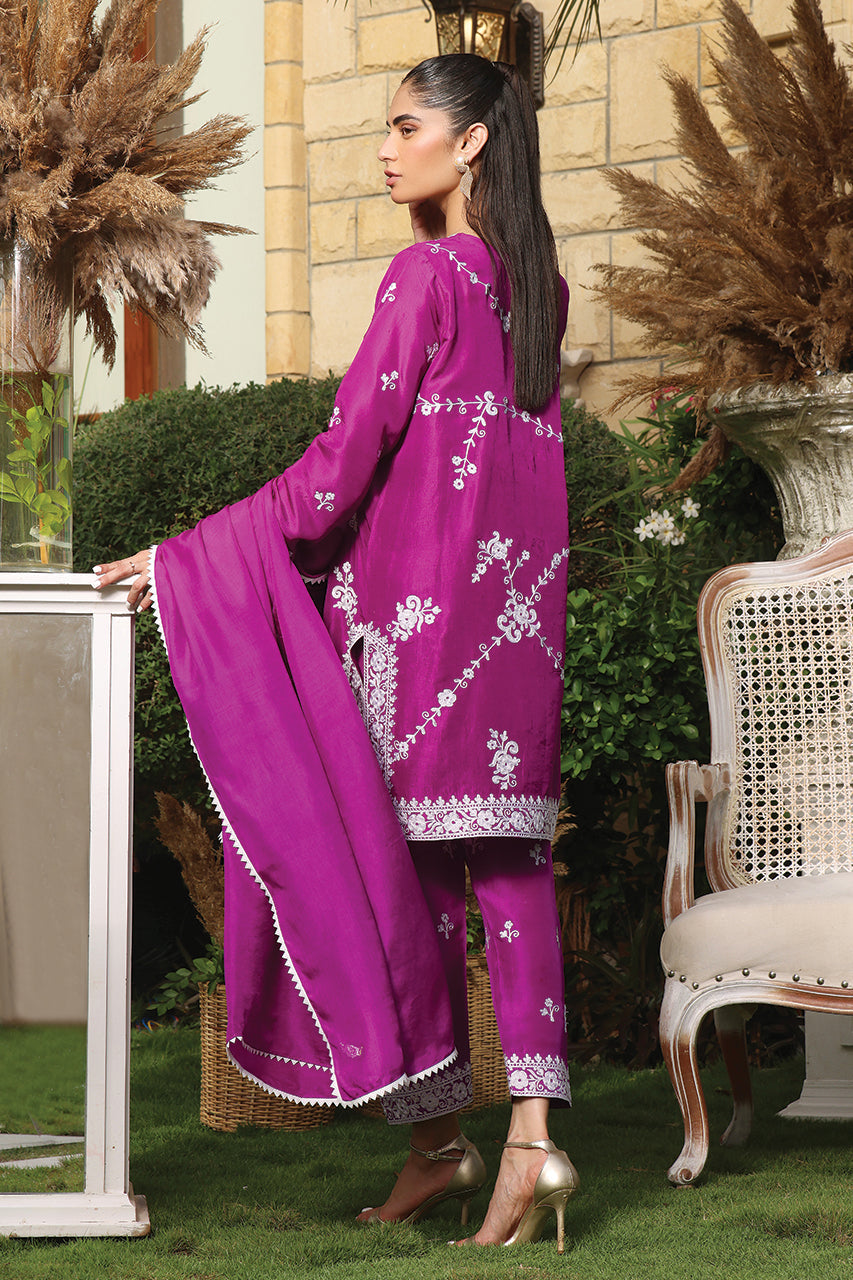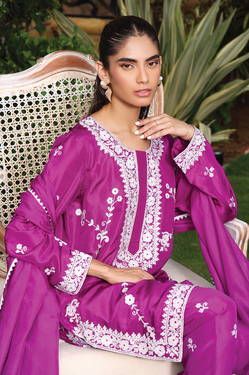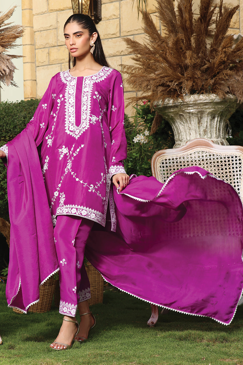This stunning raw silk two-piece ensemble features intricate ari embroidery front and back that is delicately handcrafted to perfection paired with silk dupatta detailed with namakpara lace and straight embroidered shalwar.