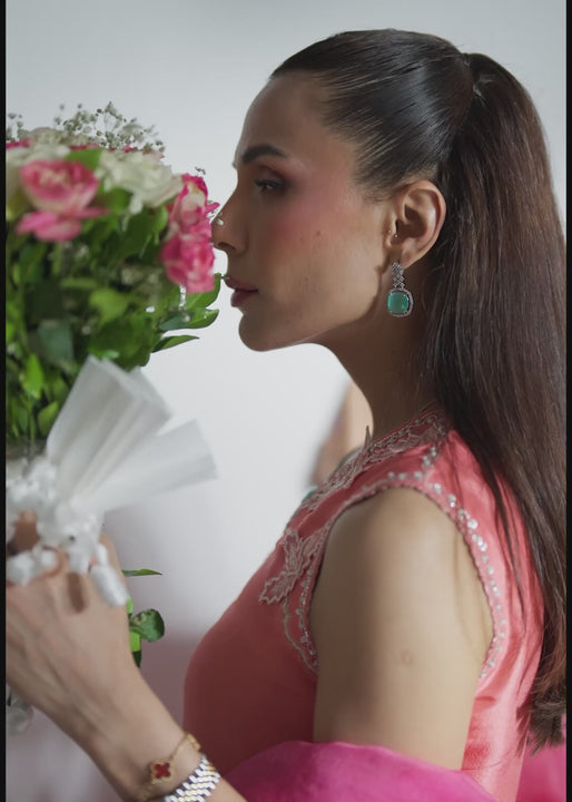 A charming coral pink shirt featuring delicate embroidery with 3D leaves artistically placed in an asymmetrical design, complemented by elegant embellishments that add a subtle sparkle. Paired with luxurious pure...