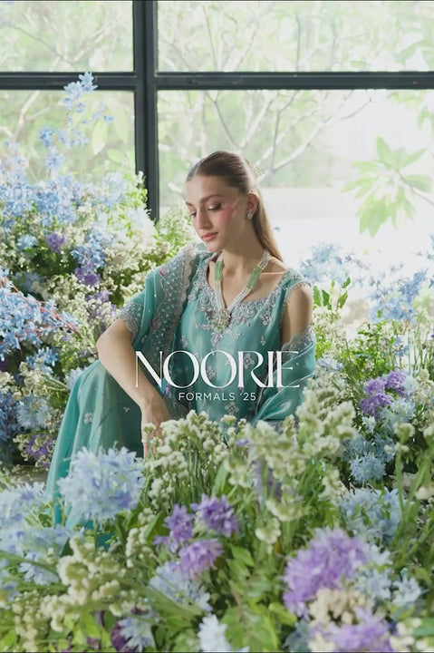 A striking turquoise viscose zari short shirt, beautifully adorned with heavy embroidery throughout. The back features elegant cutwork, enhanced with tassel hangings for a touch of charm. Paired with matching viscose zari Dhaka pants, embellished with delicate sequin work and a richly embroidered border. Completing the look is a zari organza dupatta, detailed with sequin accents and a heavily finished border—perfect for a festive yet sophisticated statement.