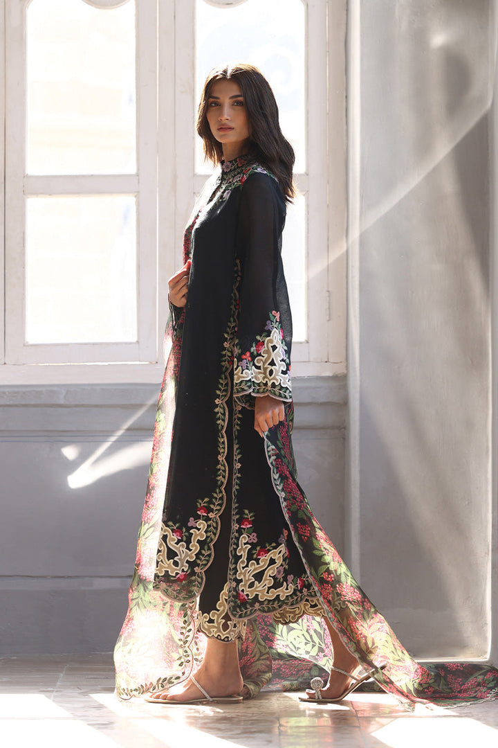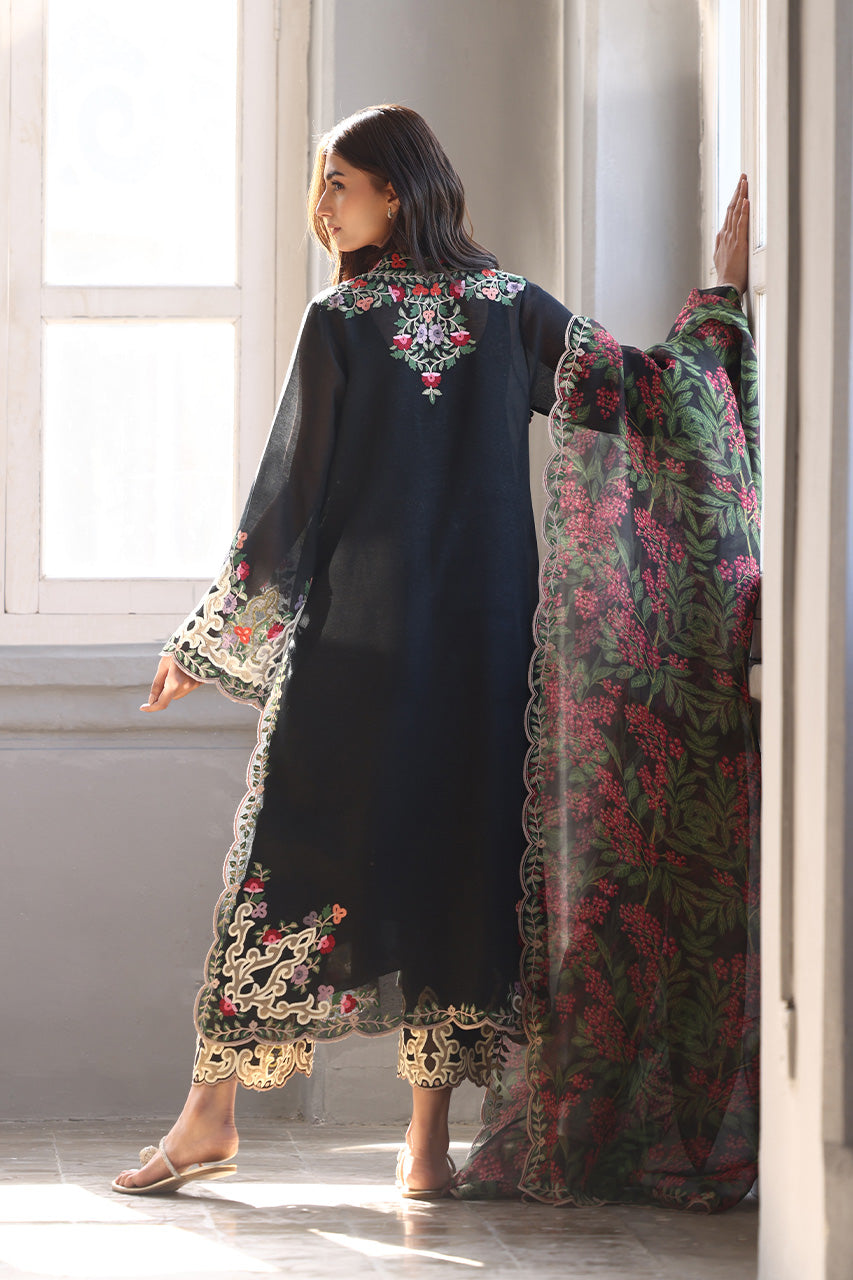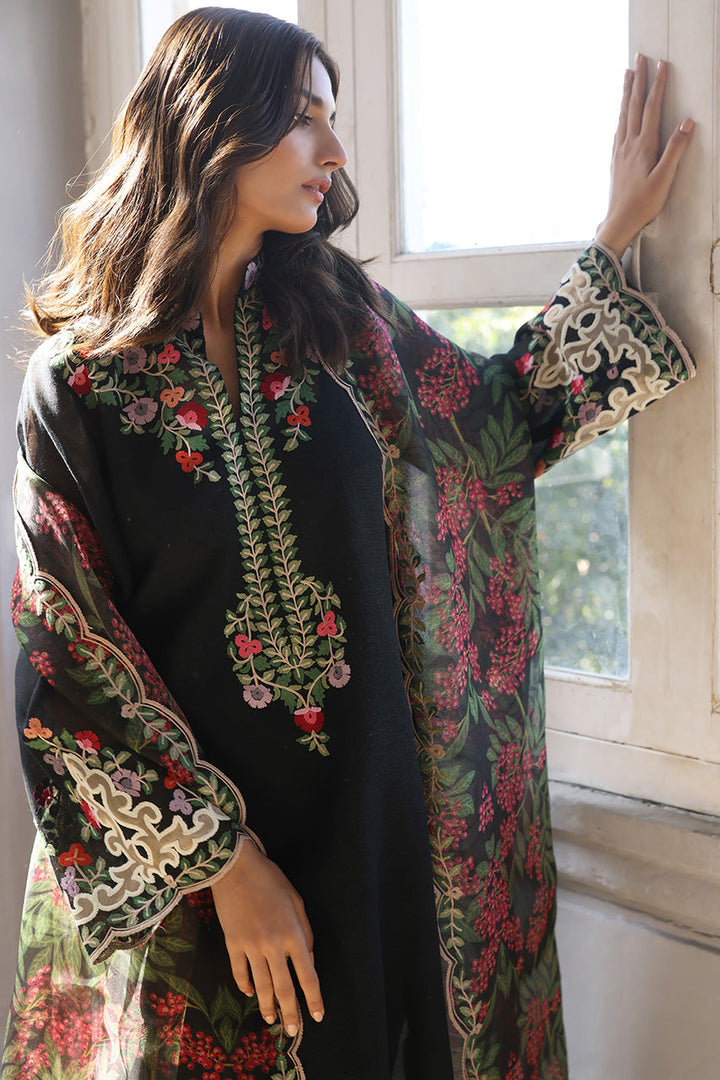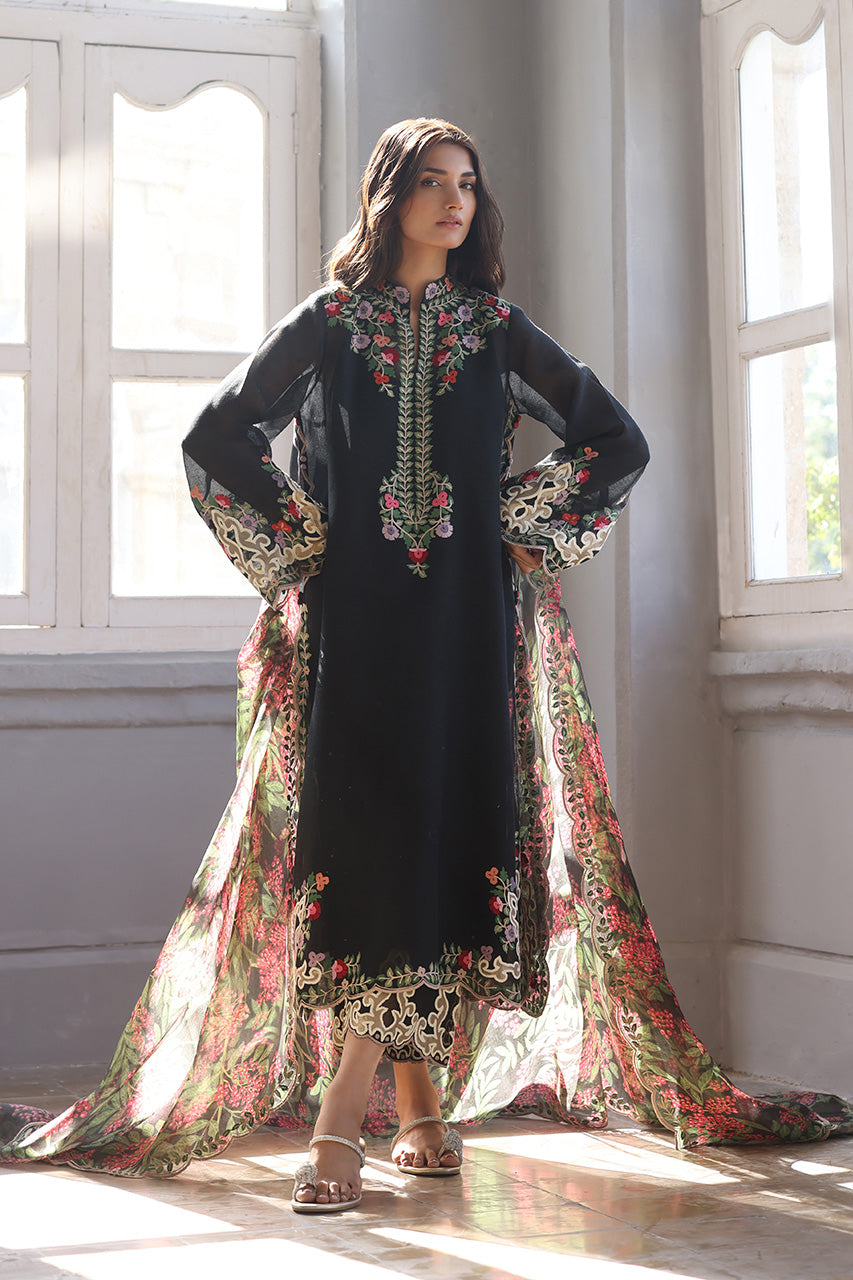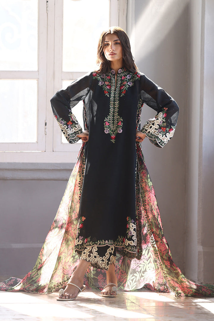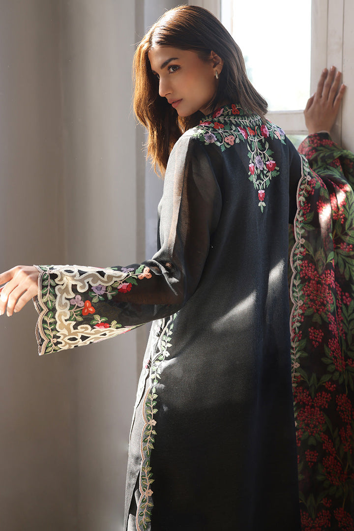 A deep ebony hued shirt, adorned with delicate aari embroidery and artisanal detailing exudes contemporary charm on a khaddi corduroy canvas. Paired with embroidered pure rawsilk culottes and a sheer...