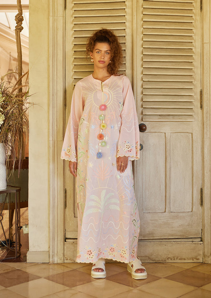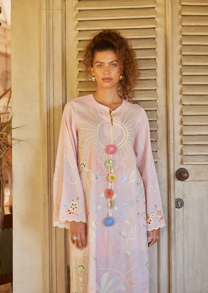 A classic summer staple! Drape this flattering silhouette on and bask in the spotlight with pastel hued embroidery amplified with eyelet details sweeping the swaying borders. Crafted from cotton for an airy and relaxed shape and elevated with playful tassels hanging from the neckline. Pair it with a snatched top knot and gold ear cuffs because in Luna's case, less is definitely more.