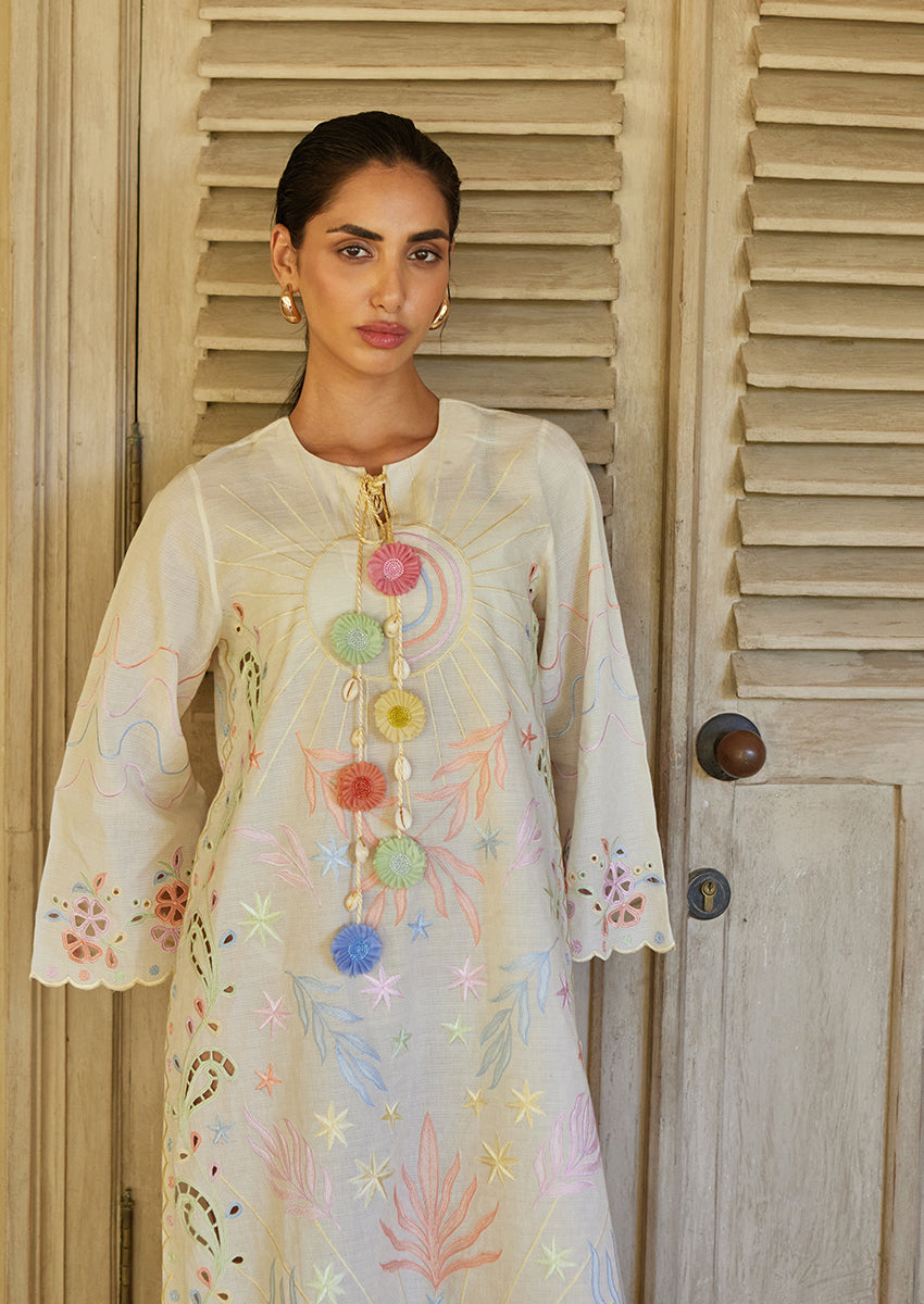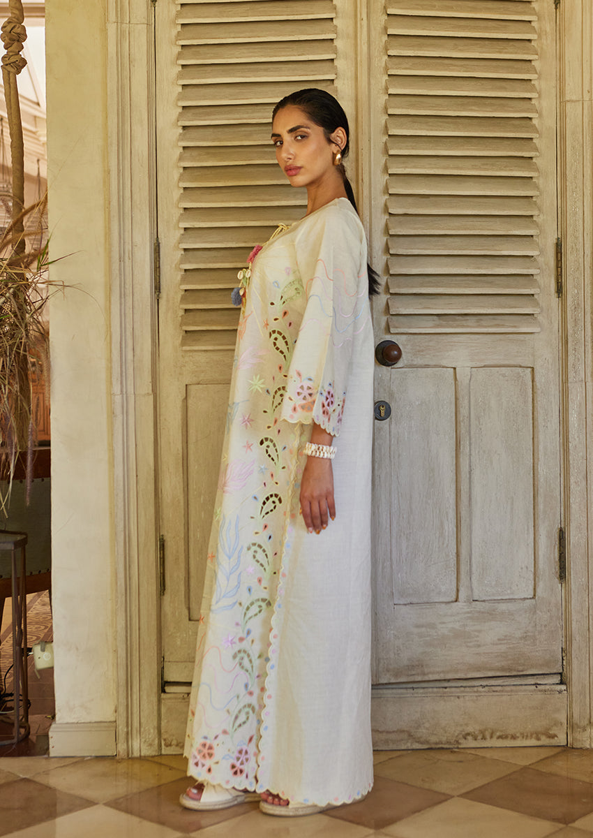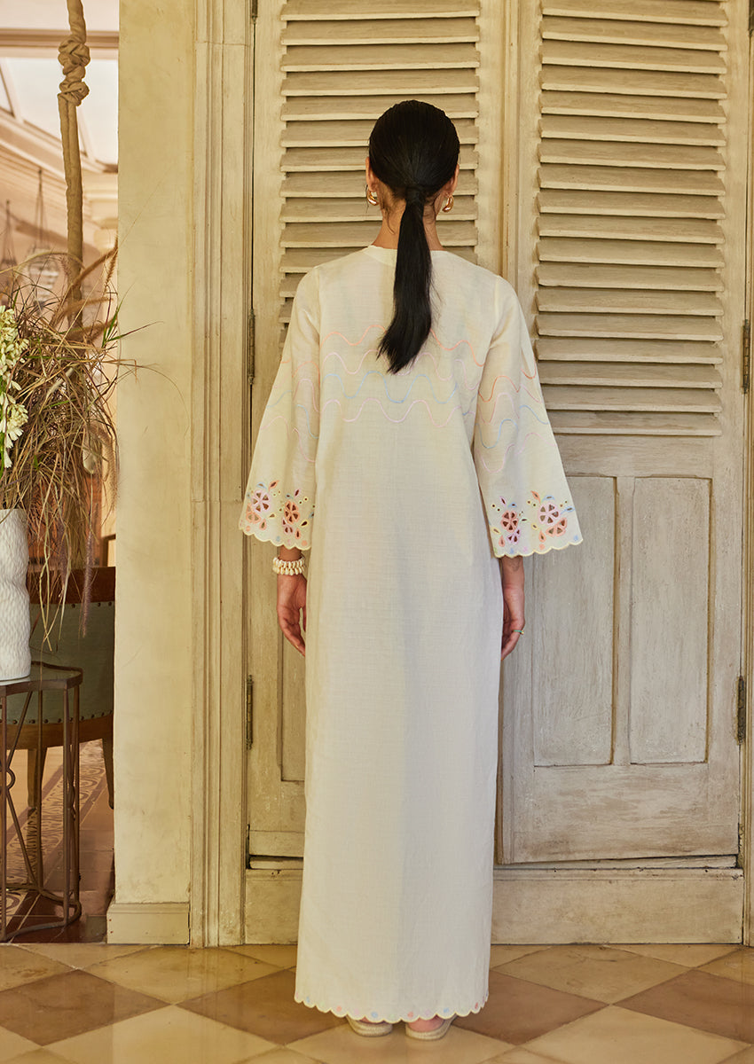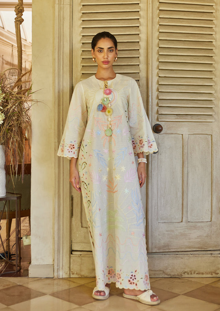 This Ivory kaftan is your style staple when time is of essence. Drape this flattering silhouette on and bask in the spotlight with pastel hued embroidery amplified with eyelet details...