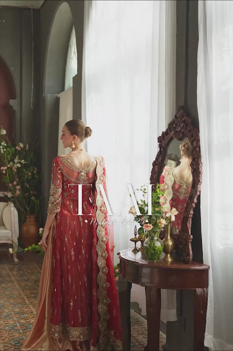 Drape yourself in elegance with this exquisite red French net long shirt, designed to turn heads. The shirt features heavy embroidery on the bodice, seamlessly blending floral and geometric patterns that cascade beautifully across the entire gown. The cutwork back detail adds a touch of drama and allure, enhanced with dangling tassels for graceful movement. Paired with a lamé shimmer lehenga, the look strikes a perfect balance between traditional grandeur and modern sparkle. Completing the ensemble is a matching French net dupatta, adorned with a heavily embroidered border and intricate sequin work scattered throughout, adding a subtle shimmer with every step.