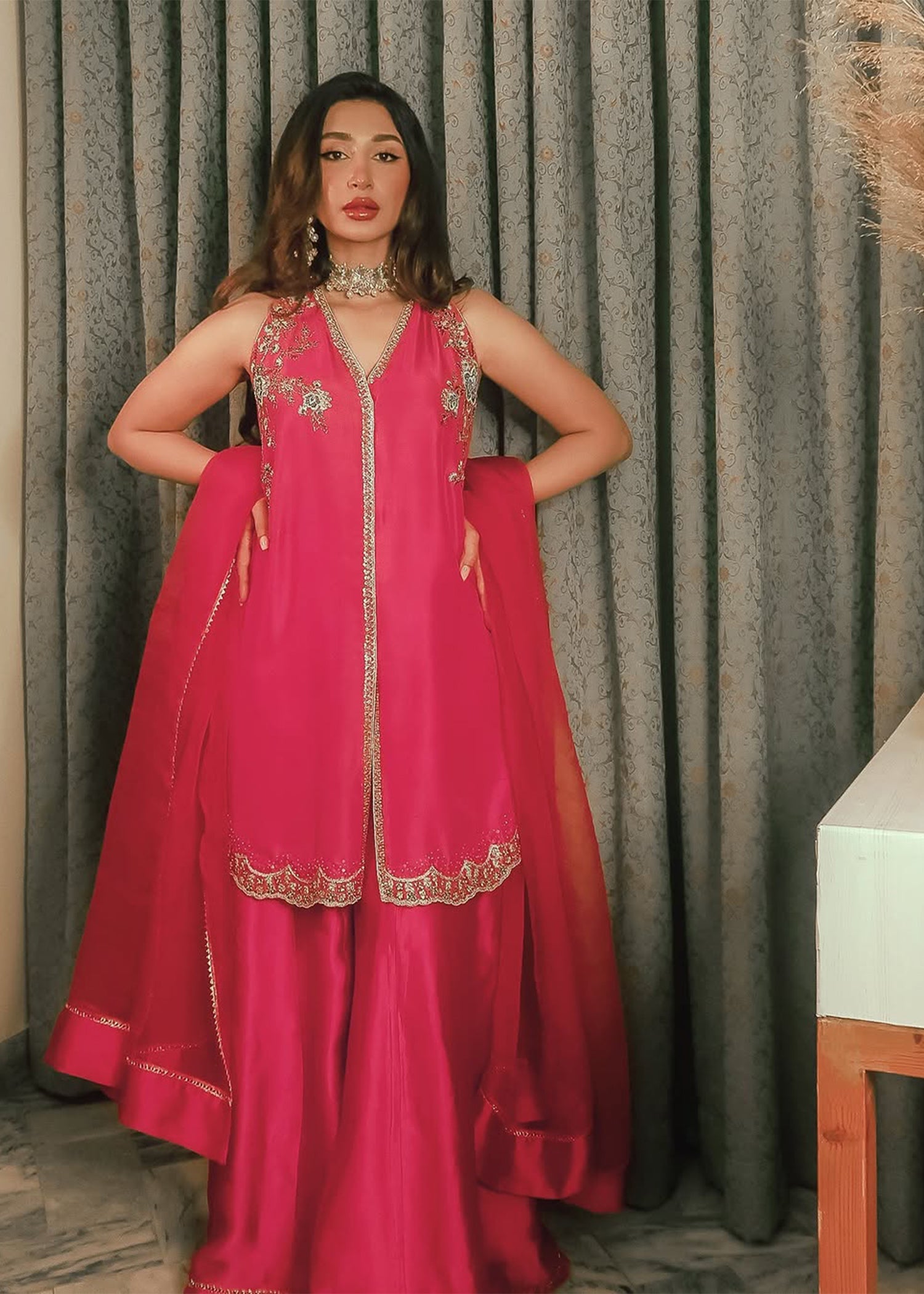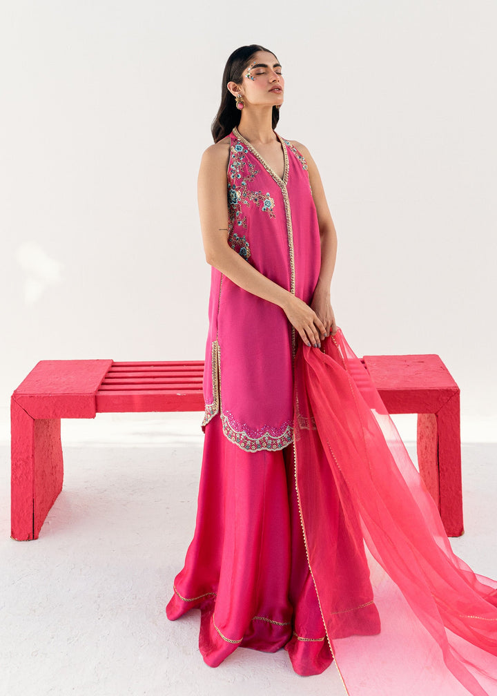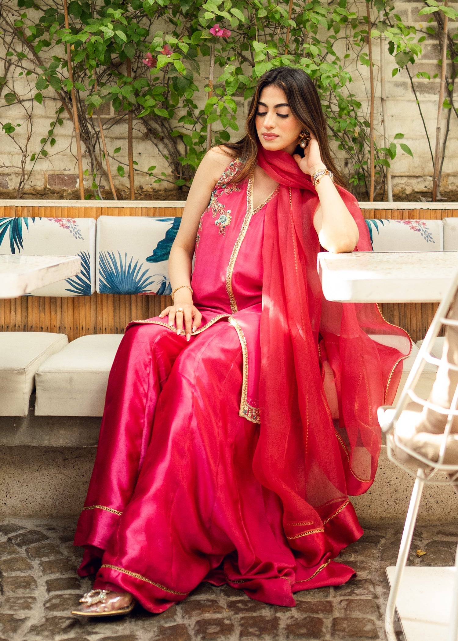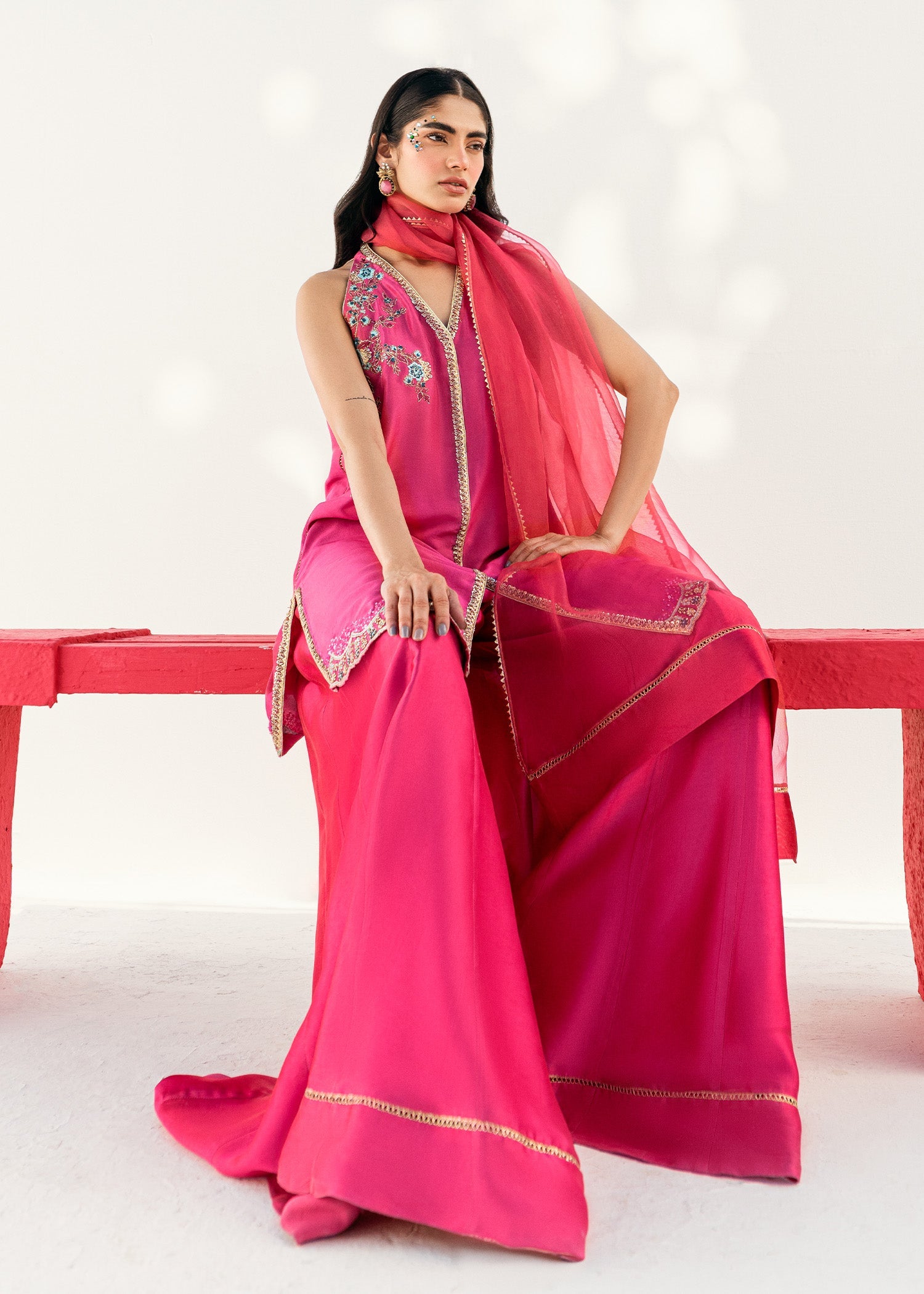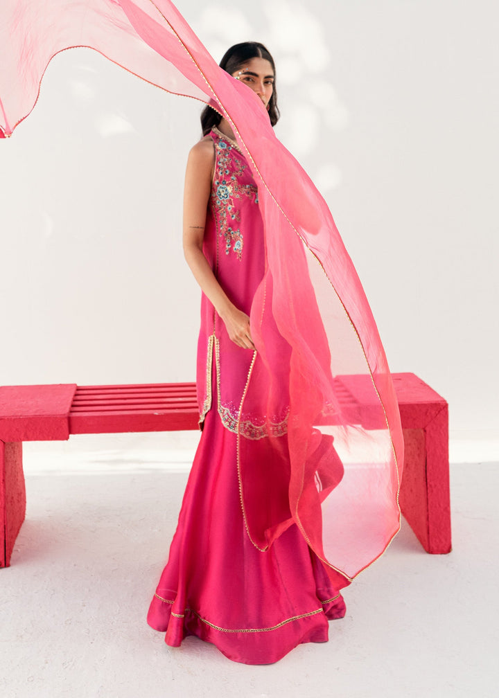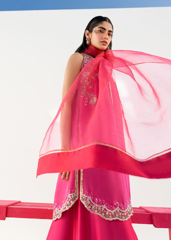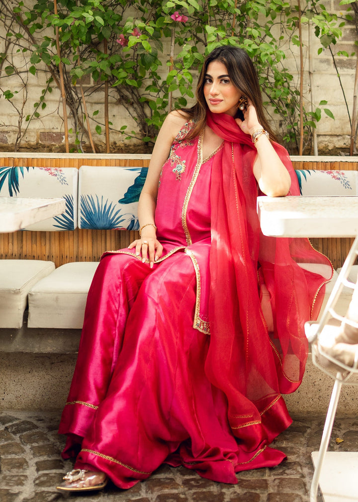 It is a front-open halter short shirt featuring intricate resham embroidery on the armholes, with an asymmetrical embroidery pattern and handwork details on the neckline. The shirt is paired with panelled palazzos and a pure organza dupatta to complete the look.