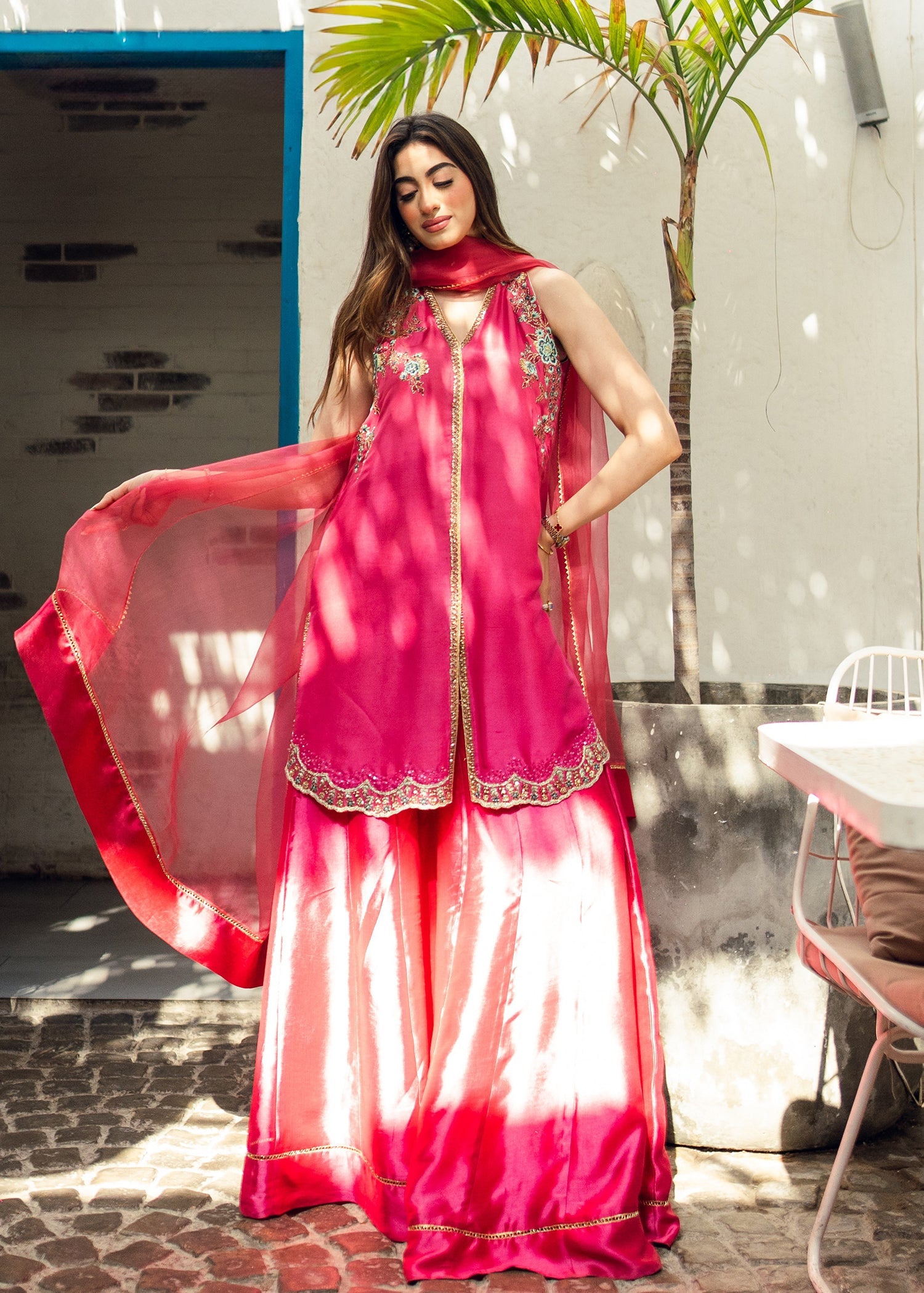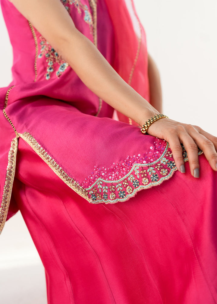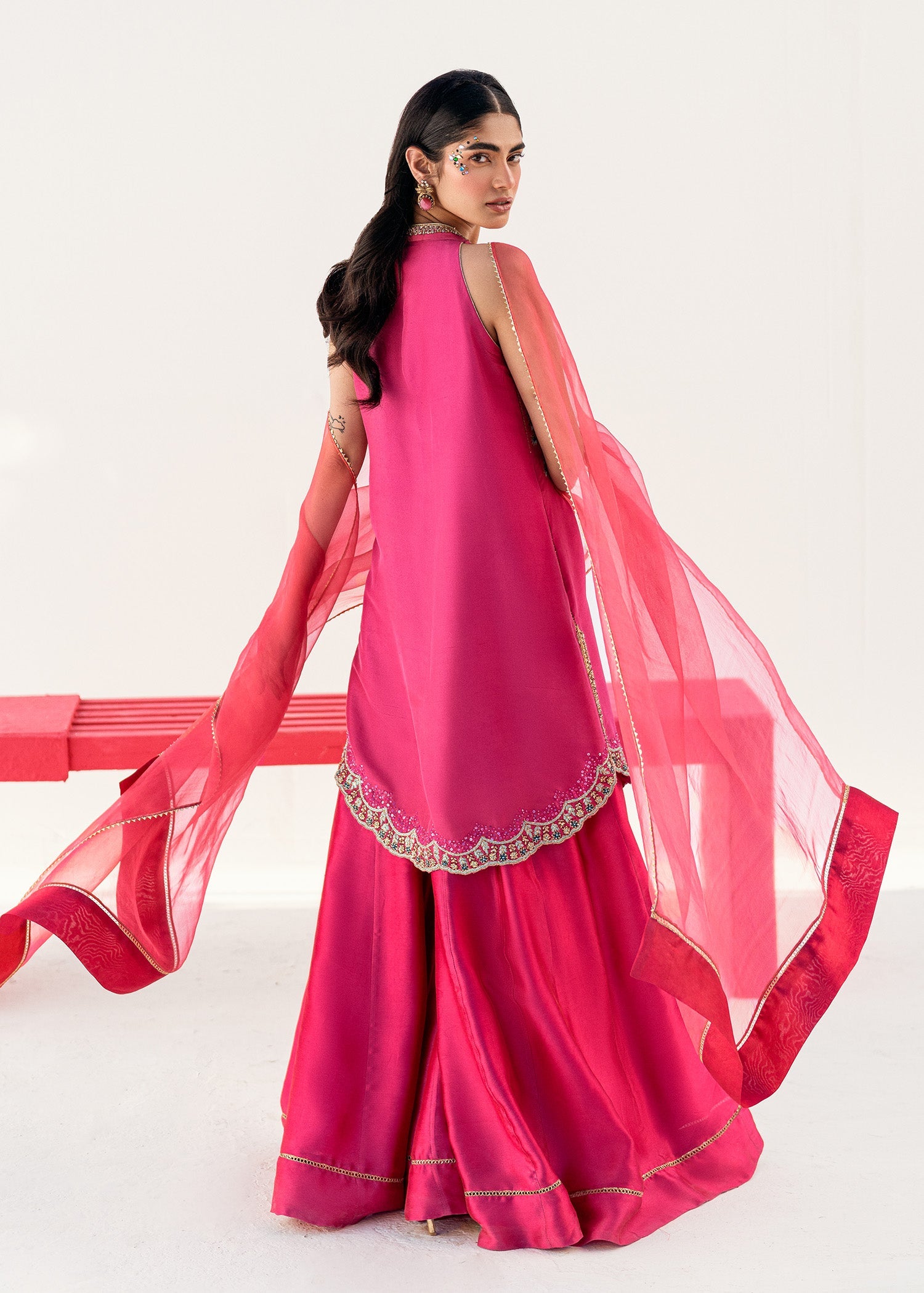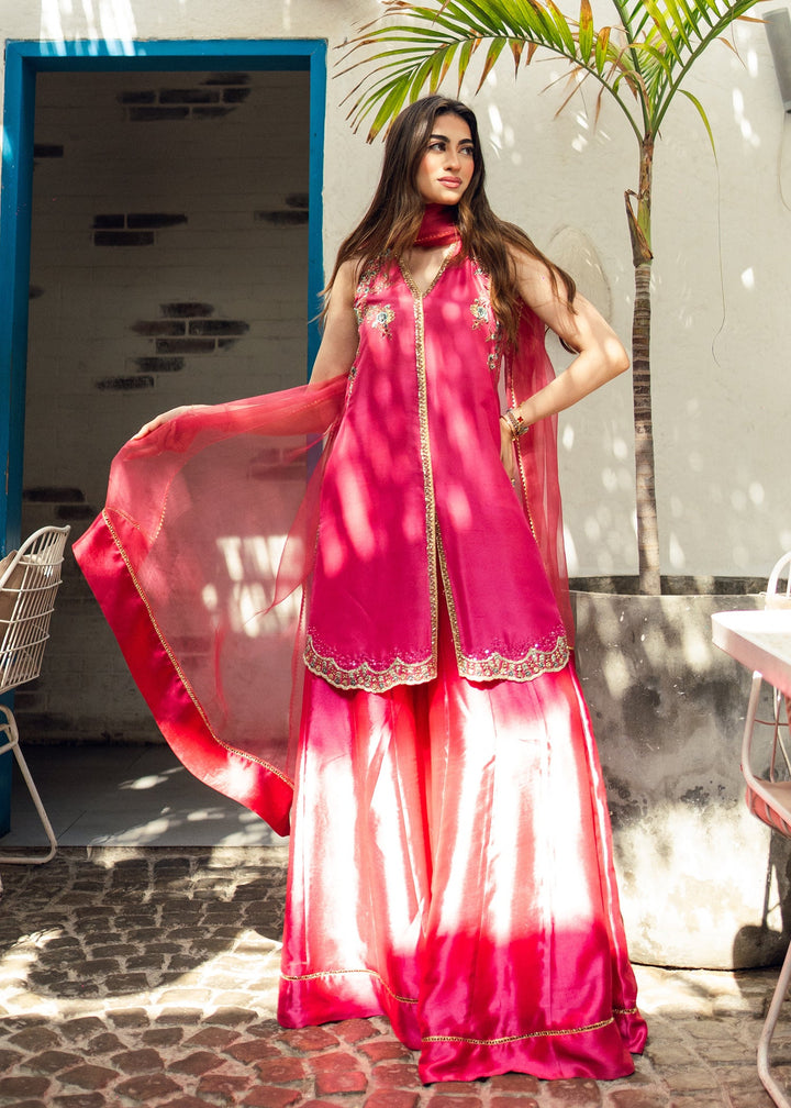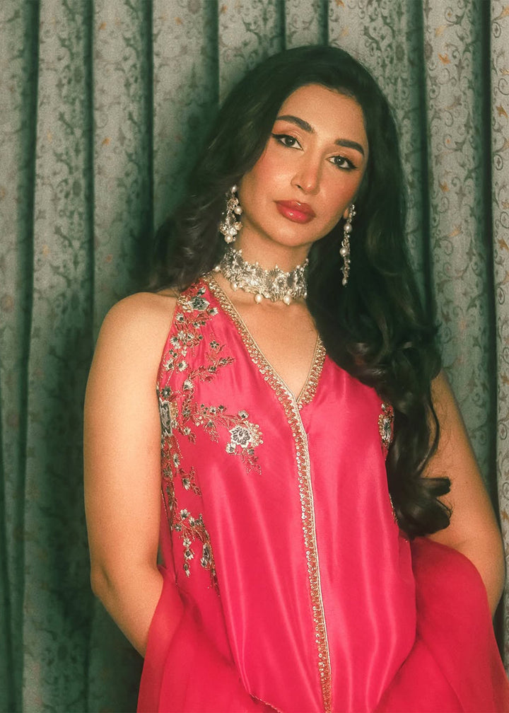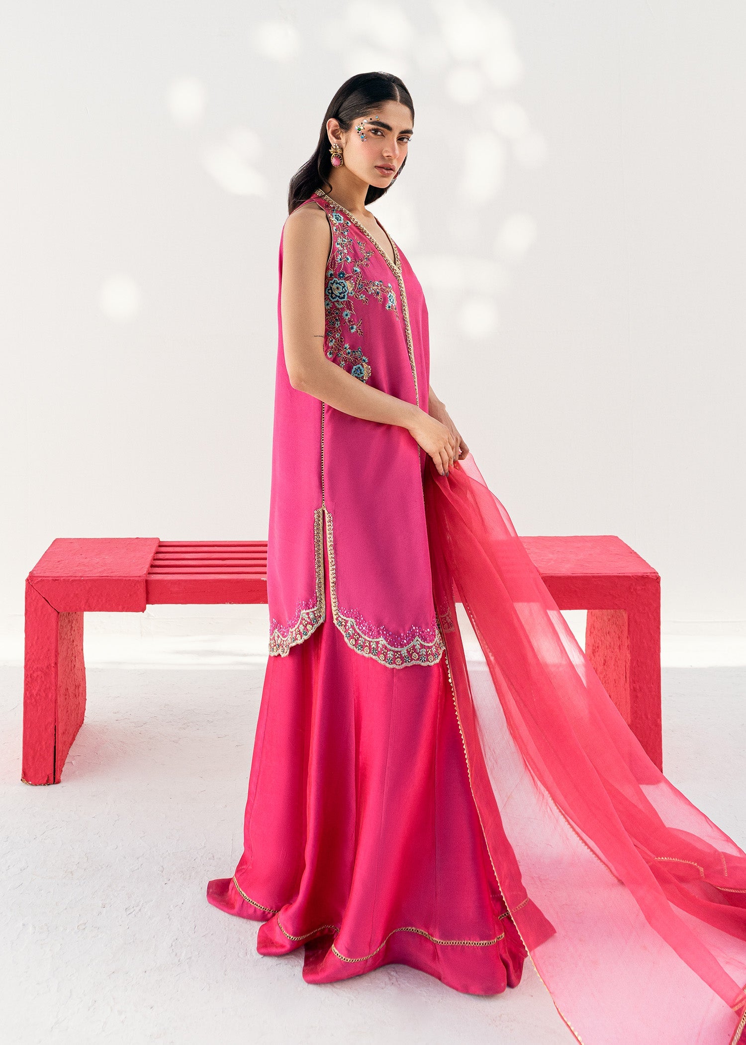 It is a front-open halter short shirt featuring intricate resham embroidery on the armholes, with an asymmetrical embroidery pattern and handwork details on the neckline. The shirt is paired with panelled palazzos and a pure organza dupatta to complete the look.