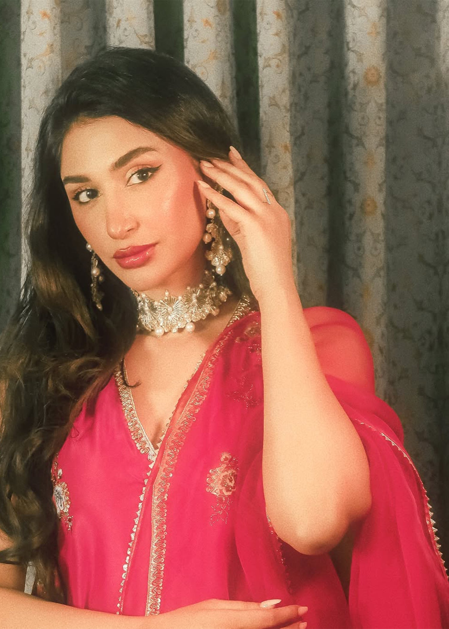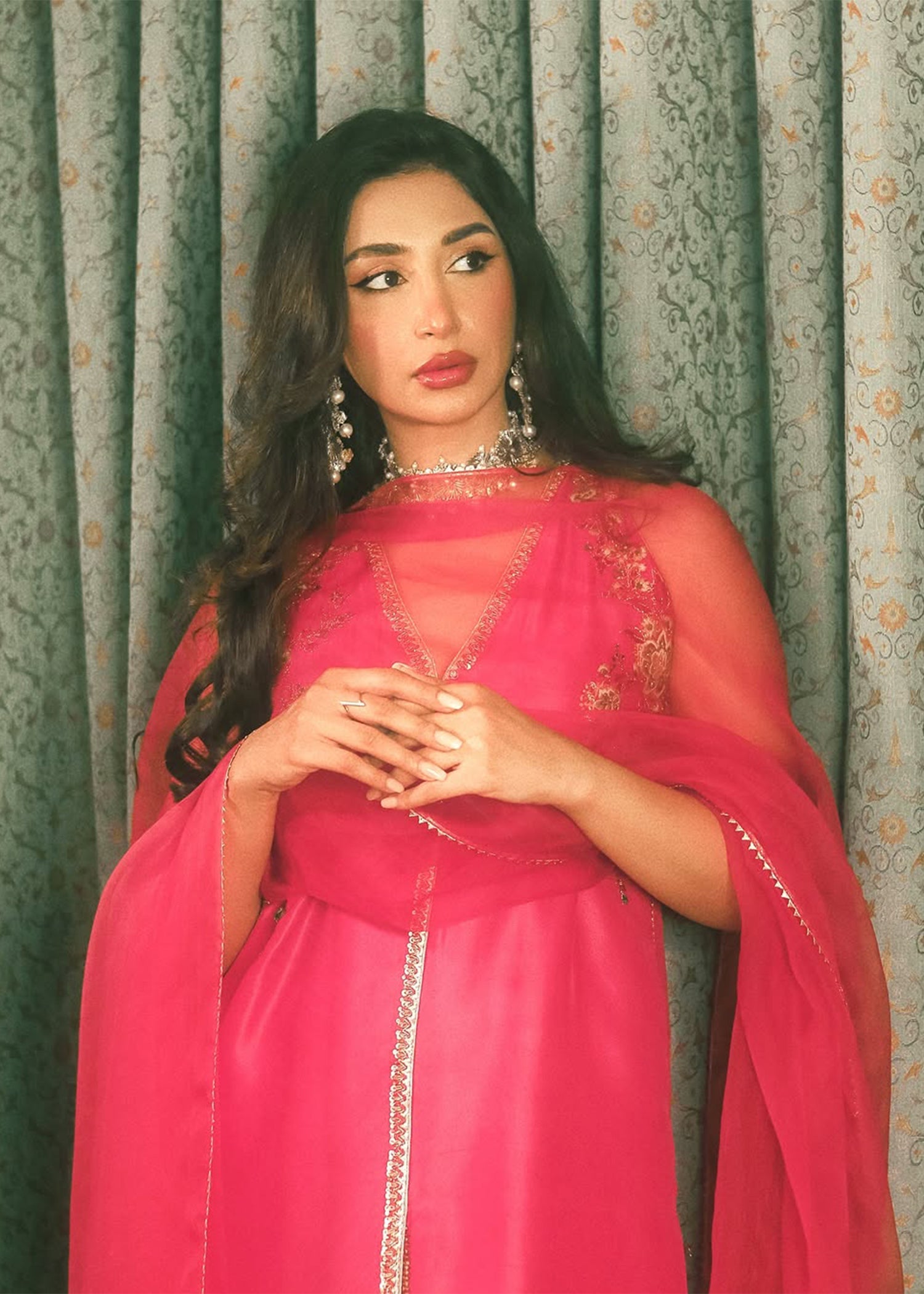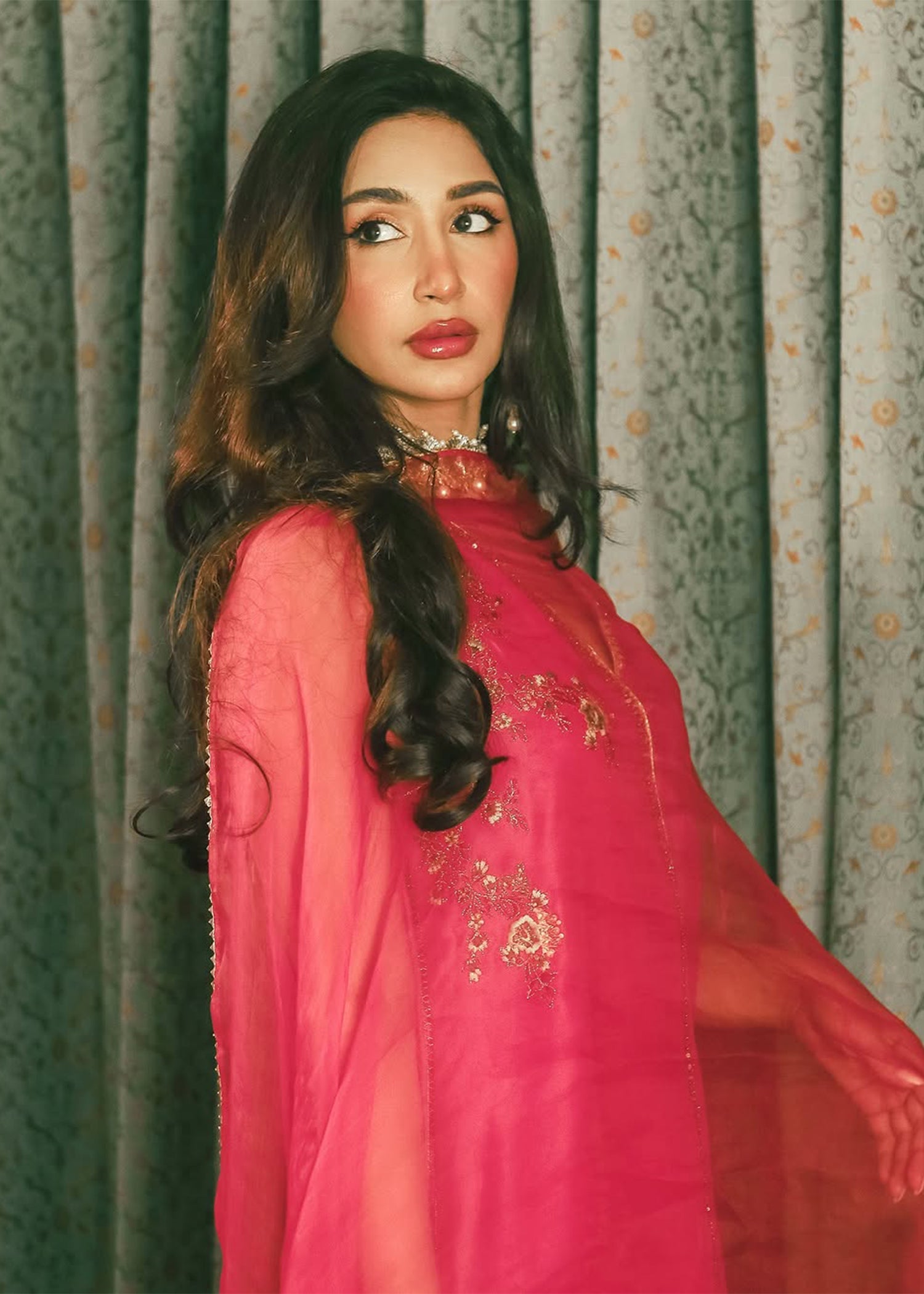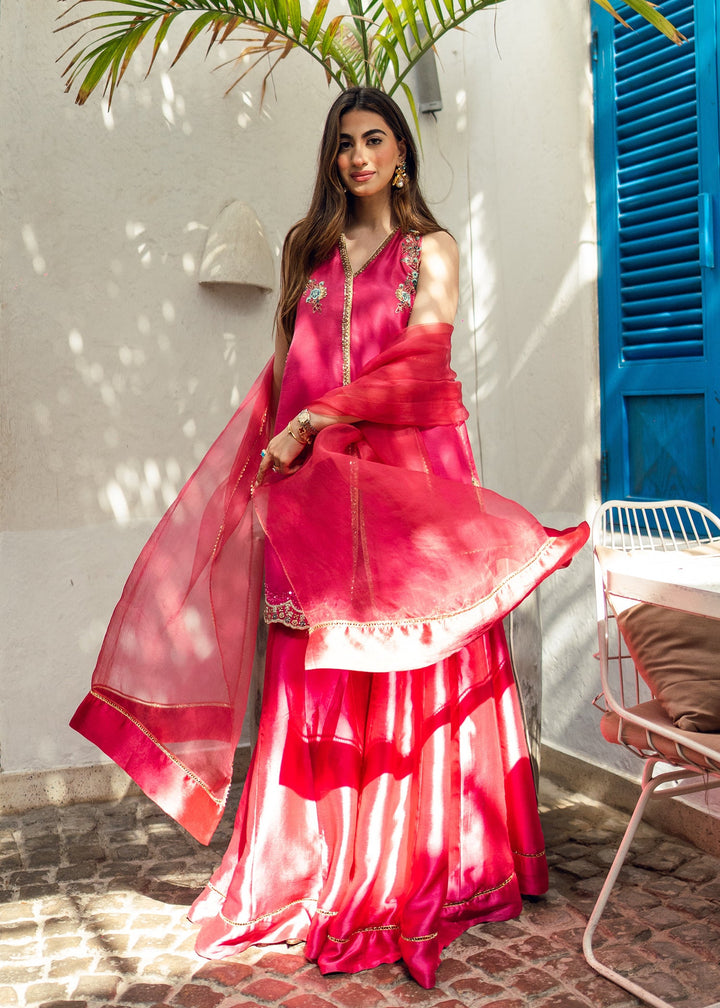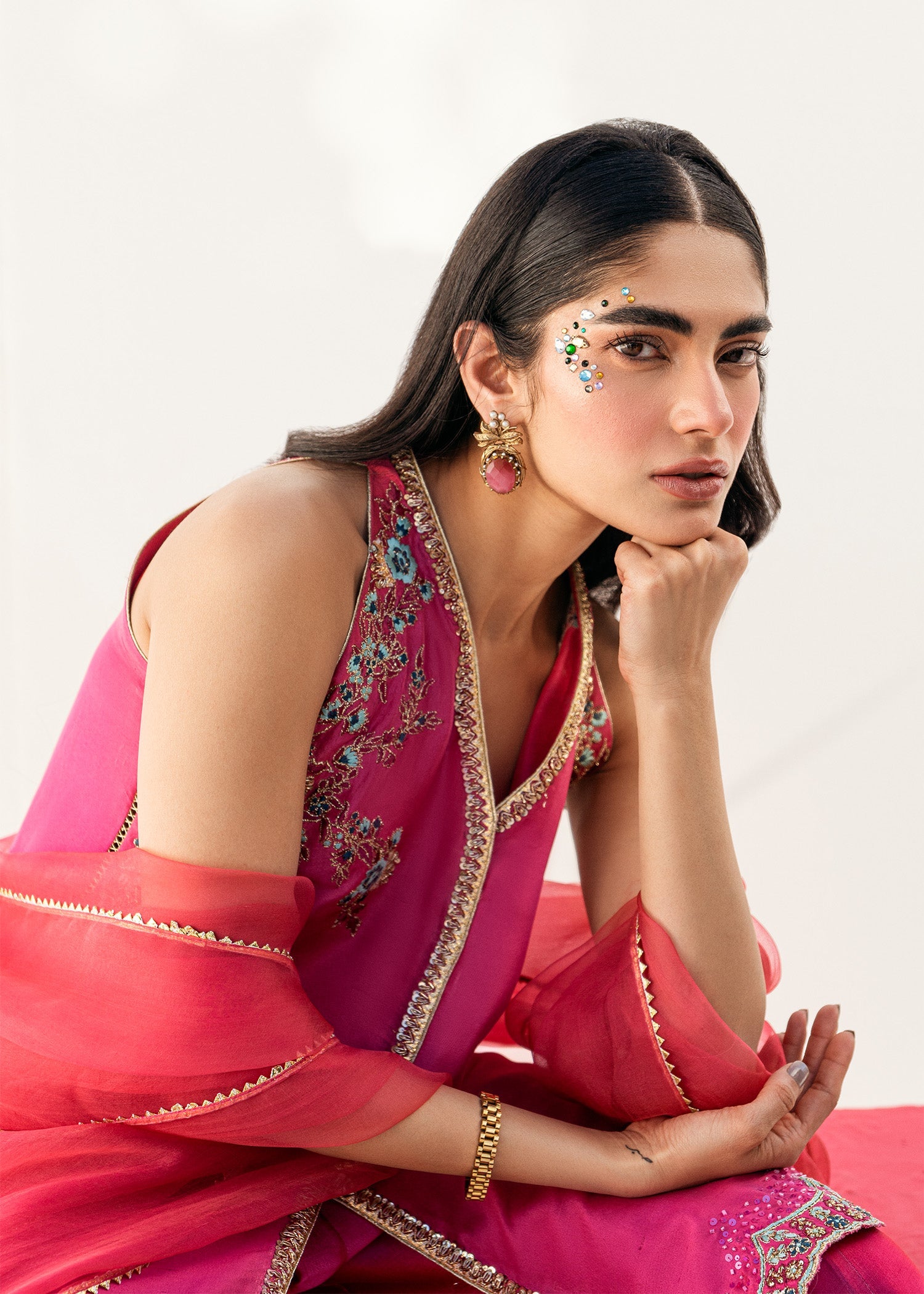 It is a front-open halter short shirt featuring intricate resham embroidery on the armholes, with an asymmetrical embroidery pattern and handwork details on the neckline. The shirt is paired with panelled palazzos and a pure organza dupatta to complete the look.