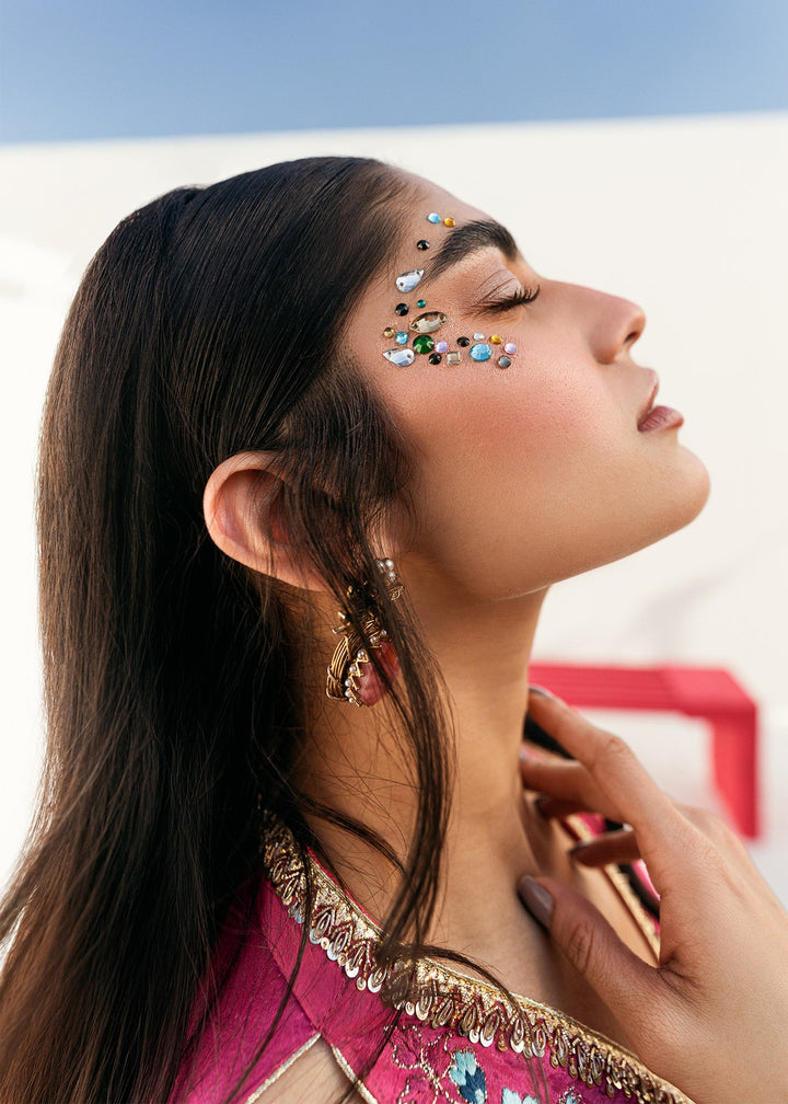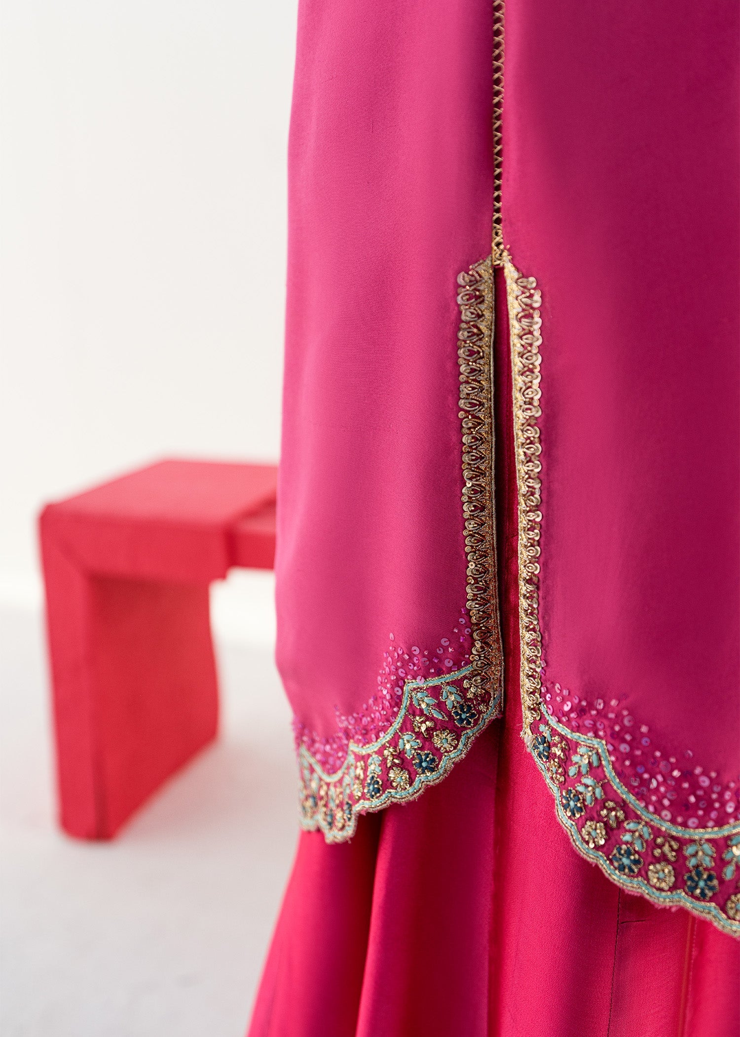 It is a front-open halter short shirt featuring intricate resham embroidery on the armholes, with an asymmetrical embroidery pattern and handwork details on the neckline. The shirt is paired with...