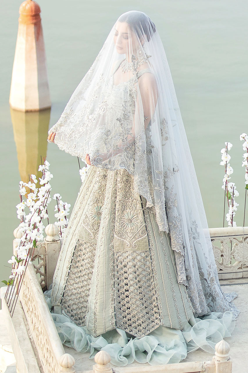 Tissue work long pishwas is beautifully crafted with cutwork geometrical pattern on the daman. This dress is crafted with a grandiose puffy Lehnga with dramatic frills at the bottom. Pair it with a perfectly hand-crafted viel on the french net.