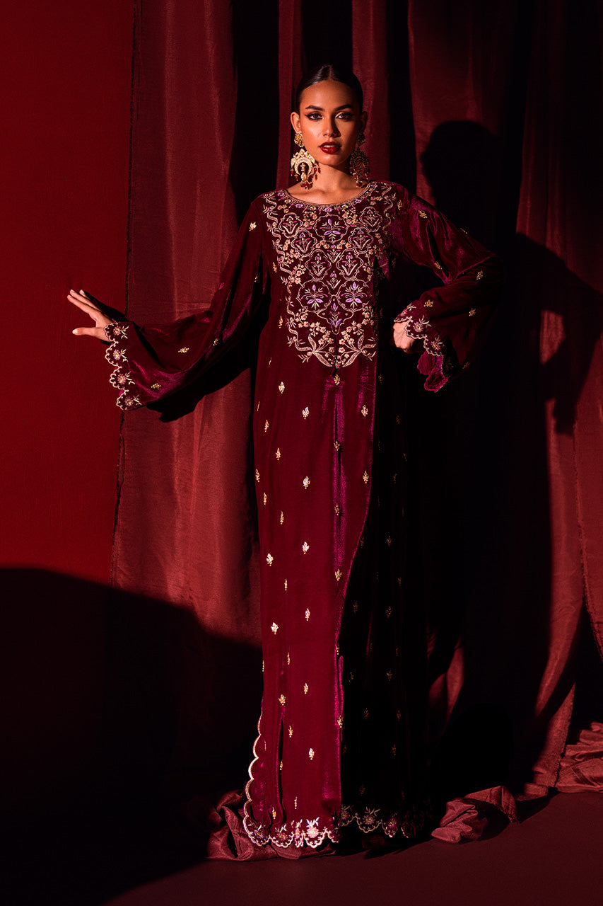 hand-touched with an exquisite combination of Swarovski stones, delicate pearls, shimmering sequins, and intricate zari work. The thoughtful arrangement of these embellishments creates a stunning interplay of texture and brilliance, enhancing the deep richness of the fabric. The silhouette is a masterful blend of classic elegance and modern sophistication, offering a graceful yet contemporary aesthetic. This kaftan is a statement of timeless beauty and refined luxury, perfect for elevating any special occasion.