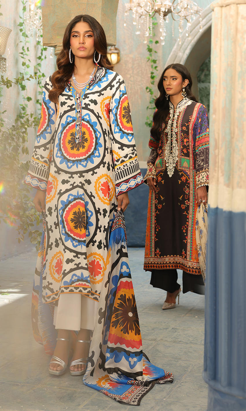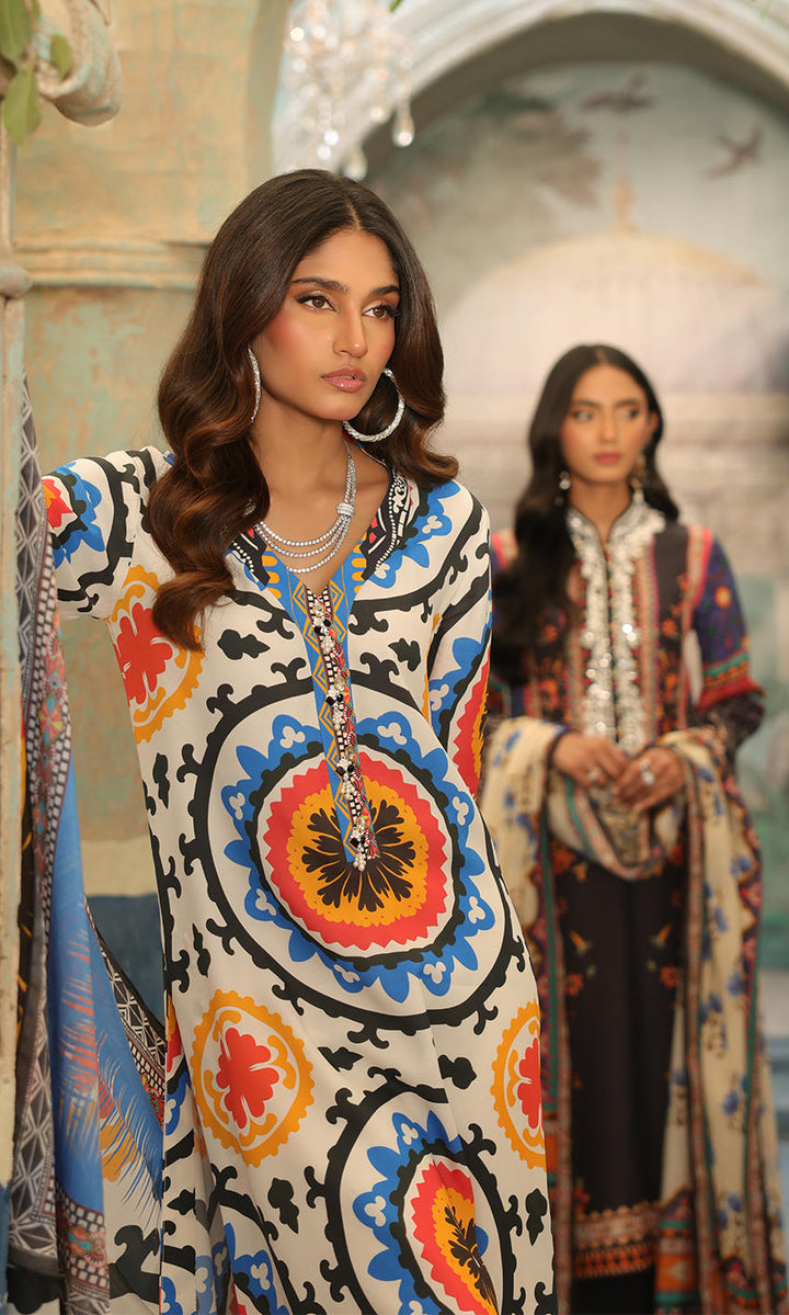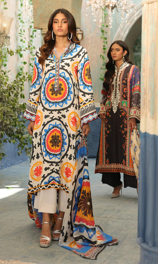 An oversized statement tribal print, styled with crystal buttons for understated elegance.