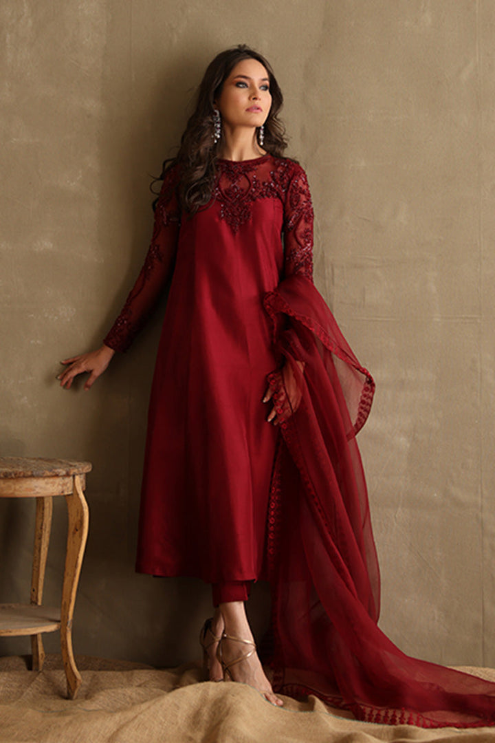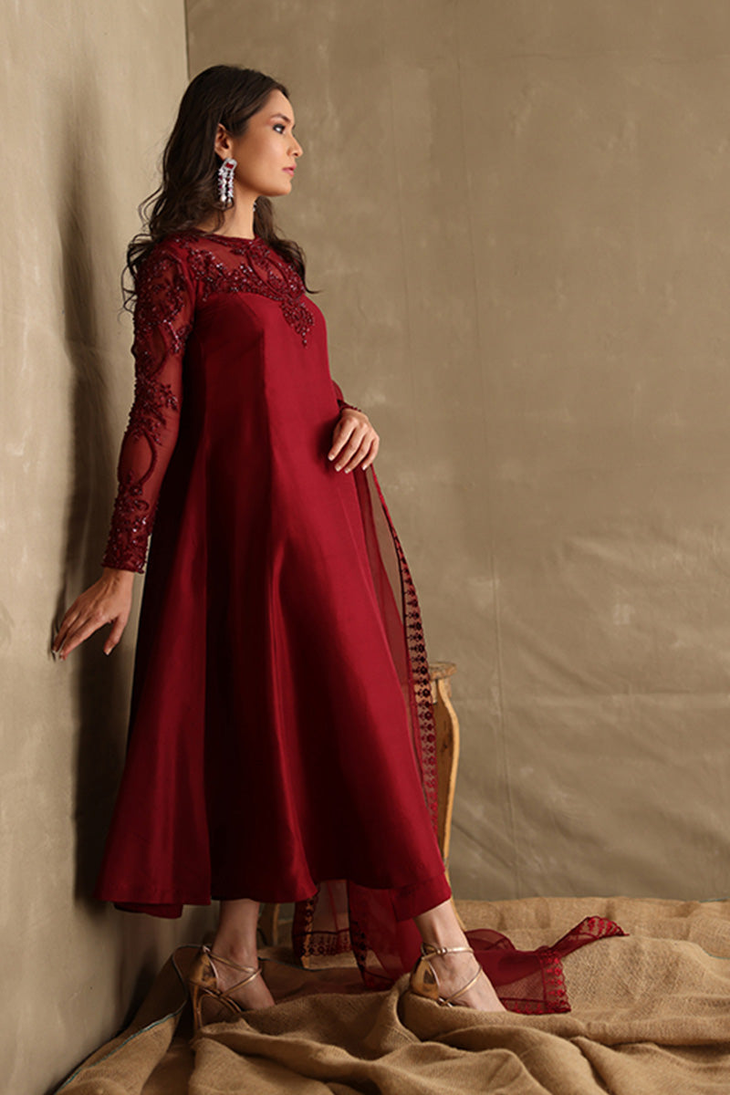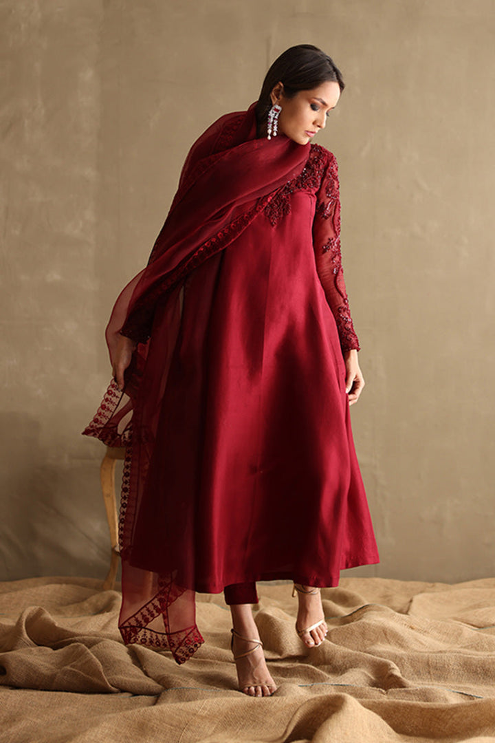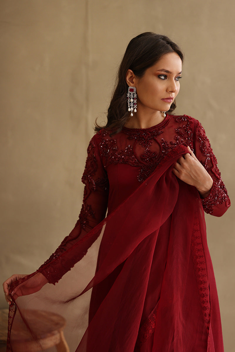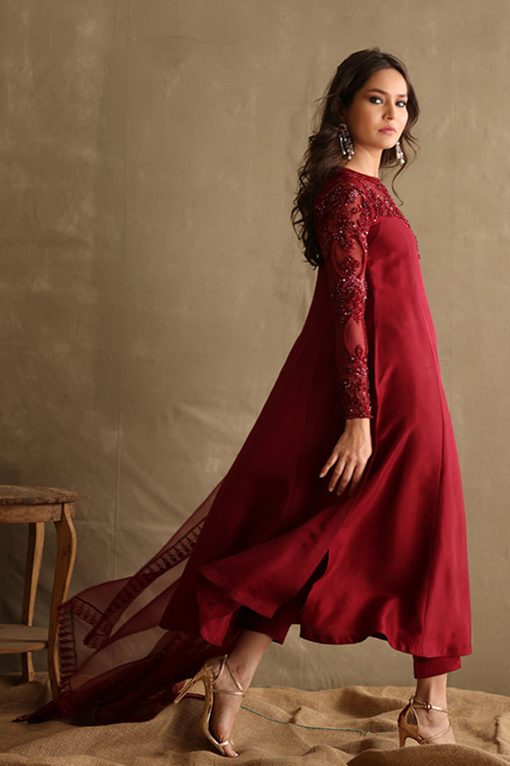 Exude subtle glamour in this burgundy beaded classic! With a hand embellished organza neckline and sleeves, this outfit is a flattering long silhouette in pure raw silk.Â