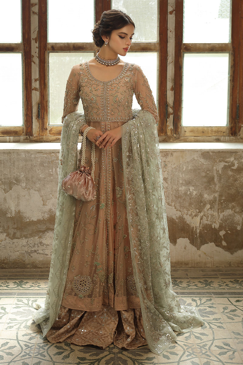 A chai pink tone like this is a treat for eyes. French net front open peshwas with heavy Zardozi work .We love the cutwork details on the hemline and our signature mirror worked beautiful heavy tassels on the back . FULLY worked Soft sage green dupatta with heavy crystal and cutdana details sprinkled all over the dupatta . A jamawar Lehenga is finished with gota and Sheesha work and heavy hand made tassels shows off the back. Can easily say engagement and nikkah Valimahbrides are all sorted for this season.Add on pouch