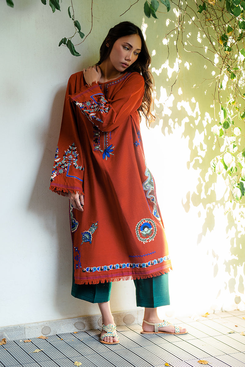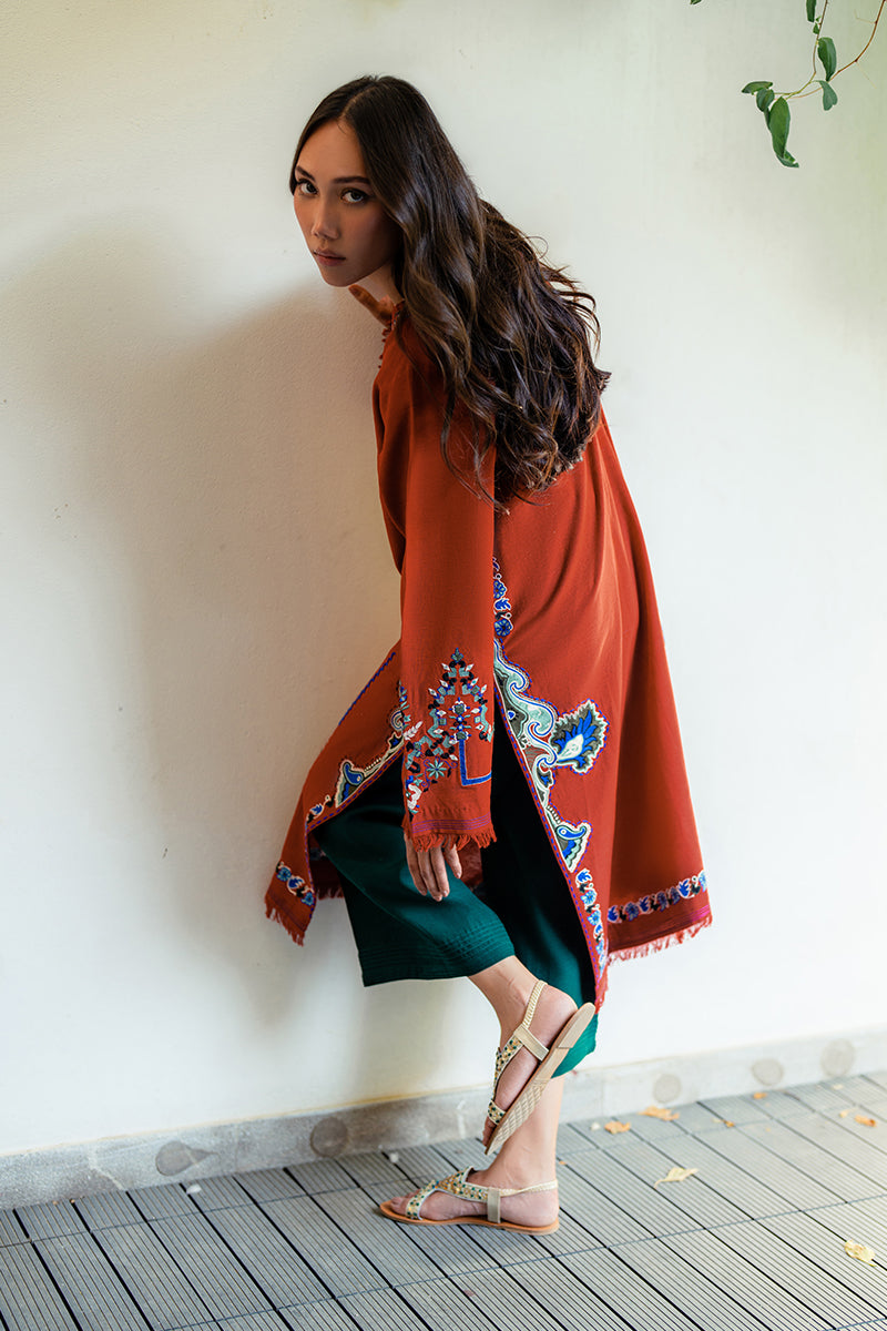 This chic kurta is crafted from premium karandi fabric, featuring intricate machine and Aari embroidery, hand detailing, and shimmering mirror work. With pleats and shredded accents at the daman and sleeves, it blends traditional craftsmanship with modern style for a sophisticated winter look.