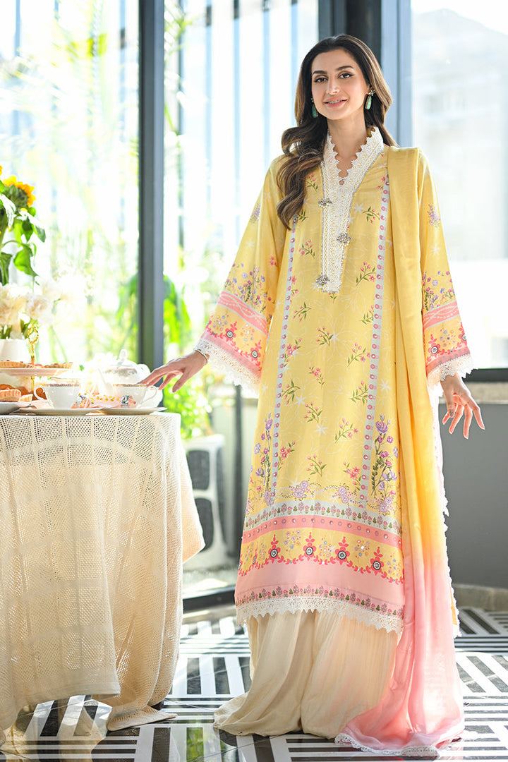This vibrant yellow and pink floral printed pure rawsilk shirt is a perfect blend of bold color and delicate details. The shirt features a classic collar neckline, adding a refined touch, while the embroidered button detailing enhances its elegant charm. The lively floral print in shades of yellow and pink brings a cheerful, fresh look, making it ideal for sunny days. Paired with a luxurious two-tone silk dupatta, the ensemble is completed with a soft lace finishing, adding a graceful touch. Perfect for daytime gatherings.Pants are an add on. Shirt maximum length length 49