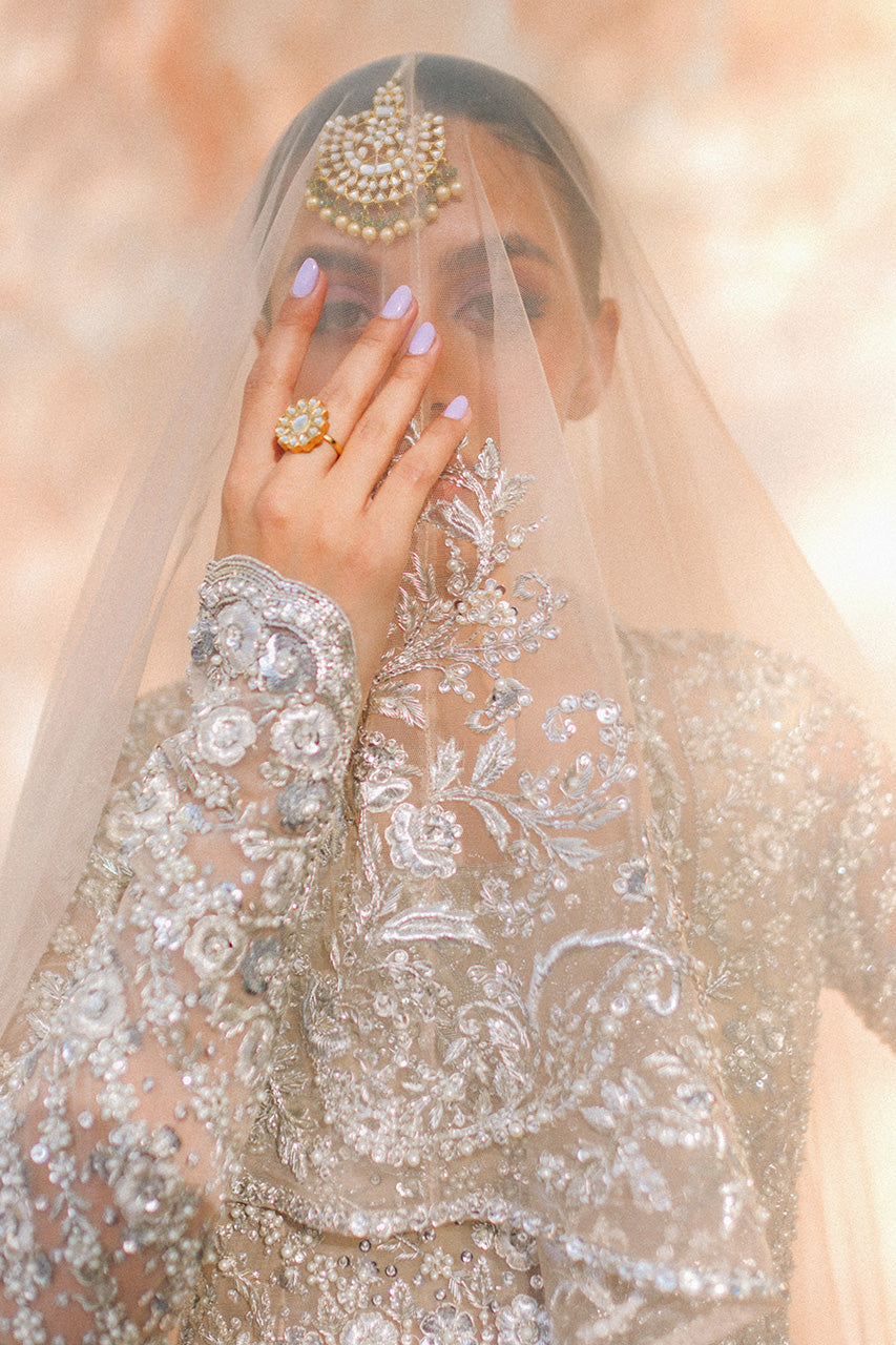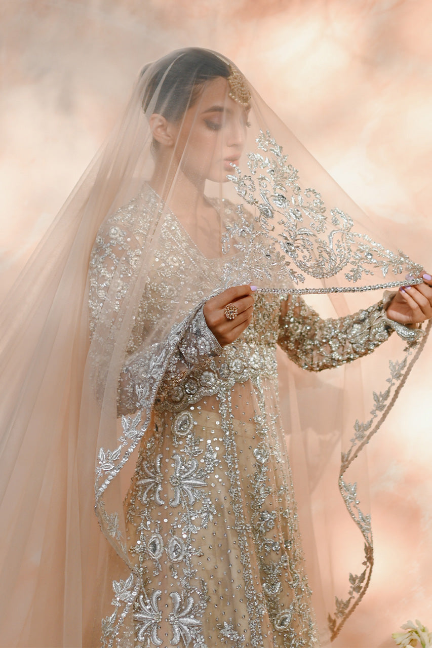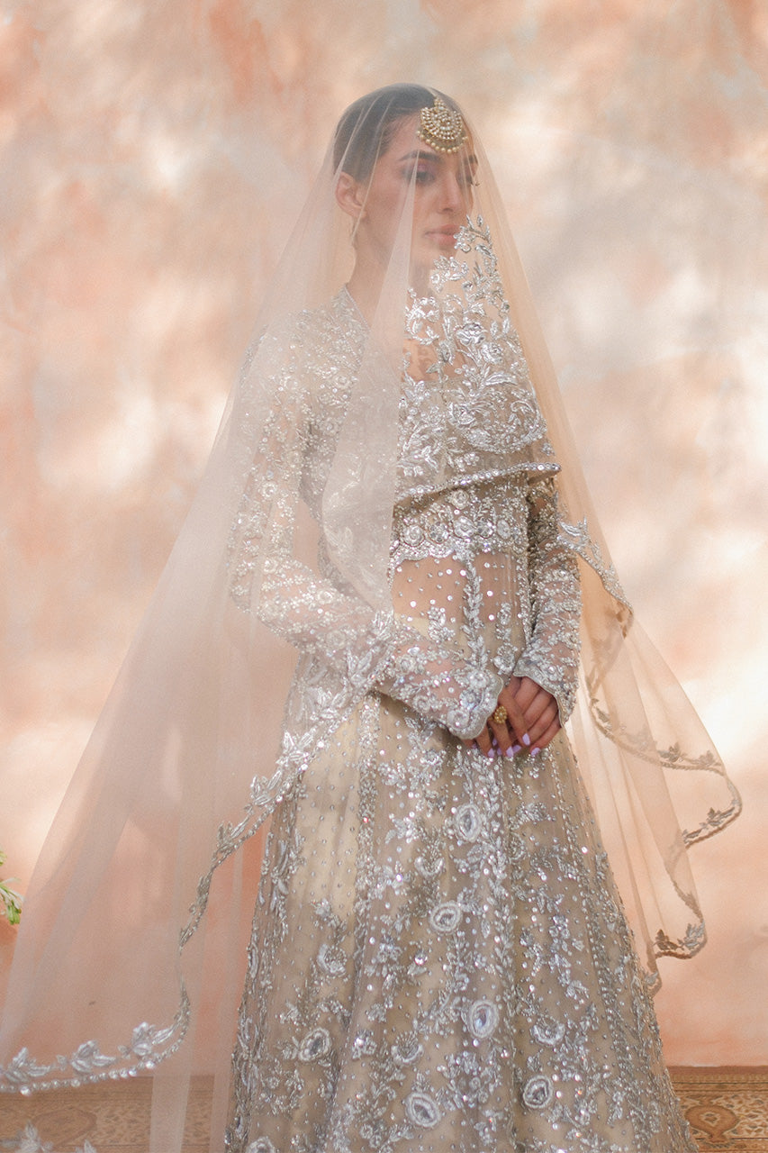 "An ethereal bone coloured tulle peshwas is intricately rendered with floral zardoze and resham work; and paired with a matching tulle veil. The timeless look is completed with a ruffled brocade lehnga adorned with dispersed gota flowers.