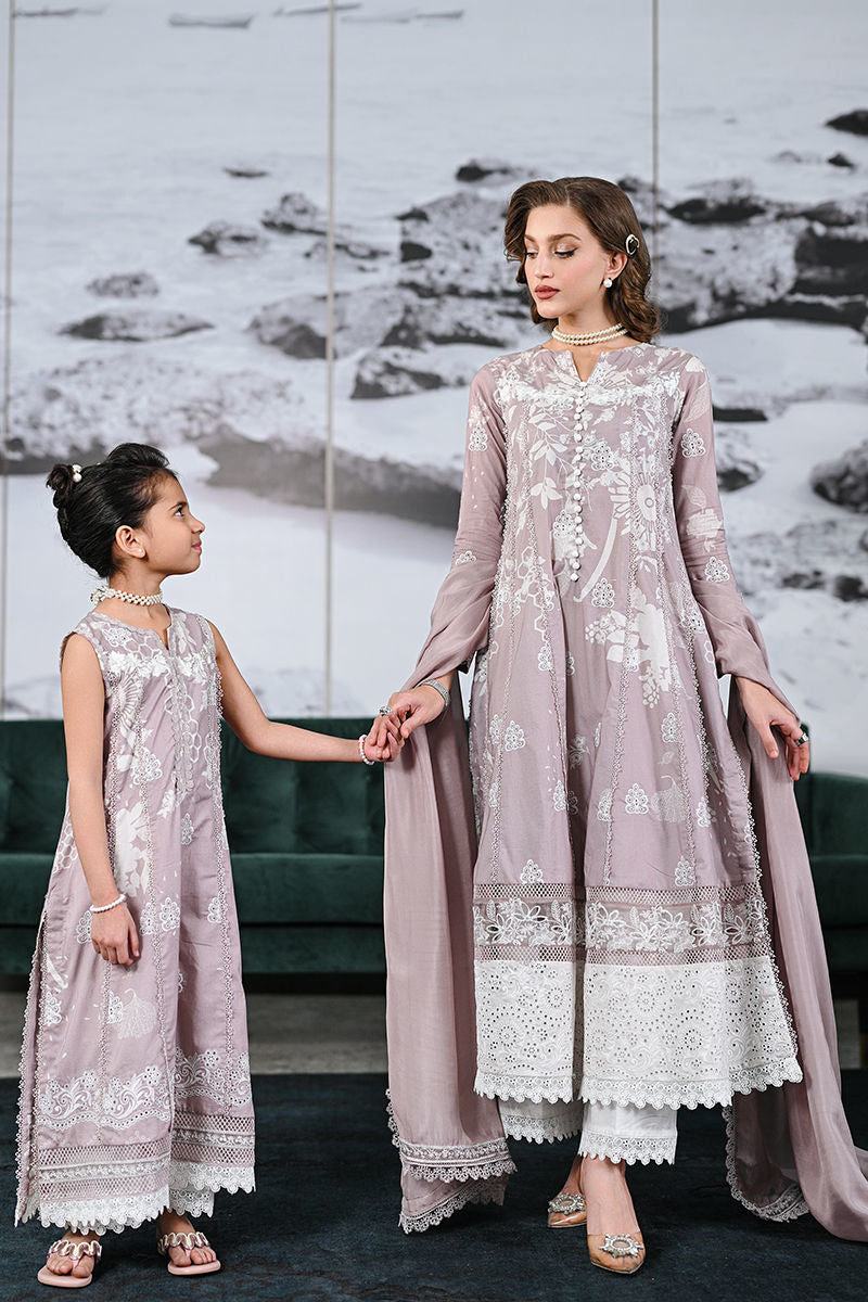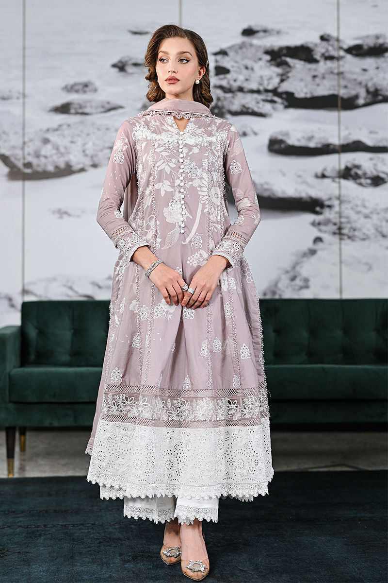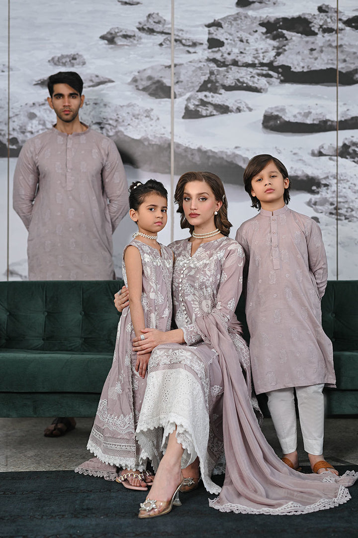 A graceful light mauve long shirt, beautifully adorned with white print and a delicate lace border, complemented by fitted sleeves for a refined silhouette. Paired with a pristine white izaar and a luxurious mauve silk dupatta, finished with lace borders.