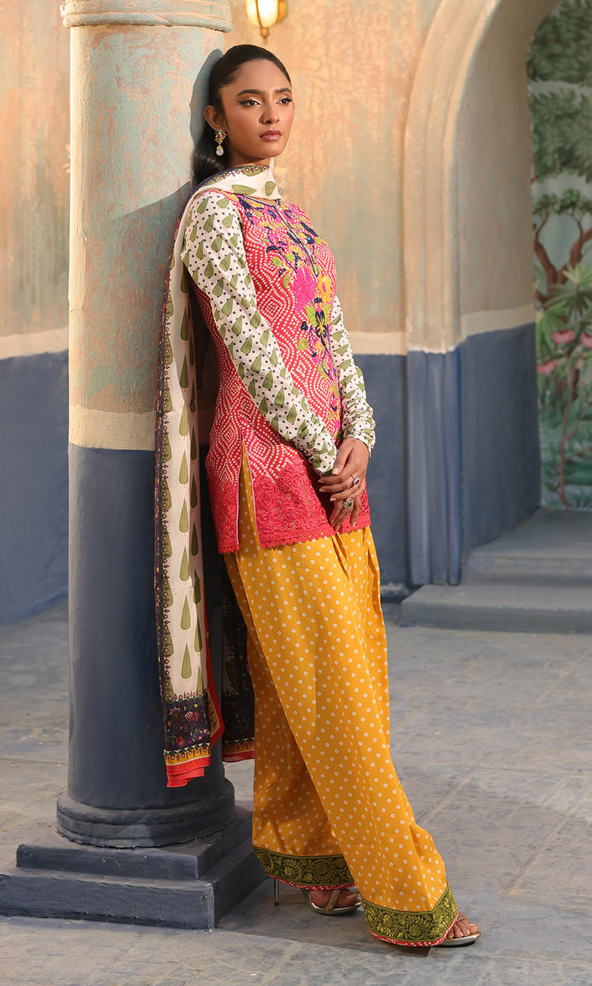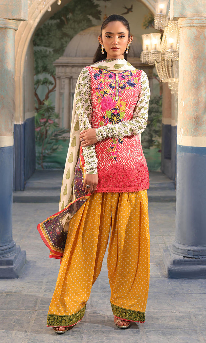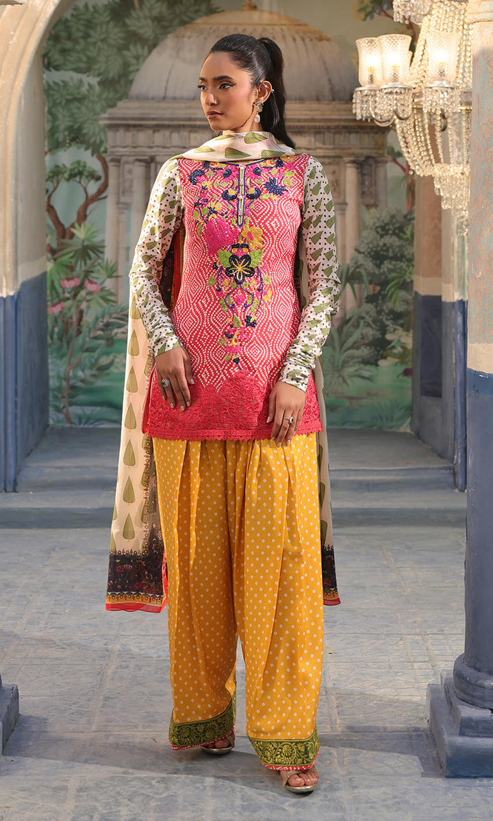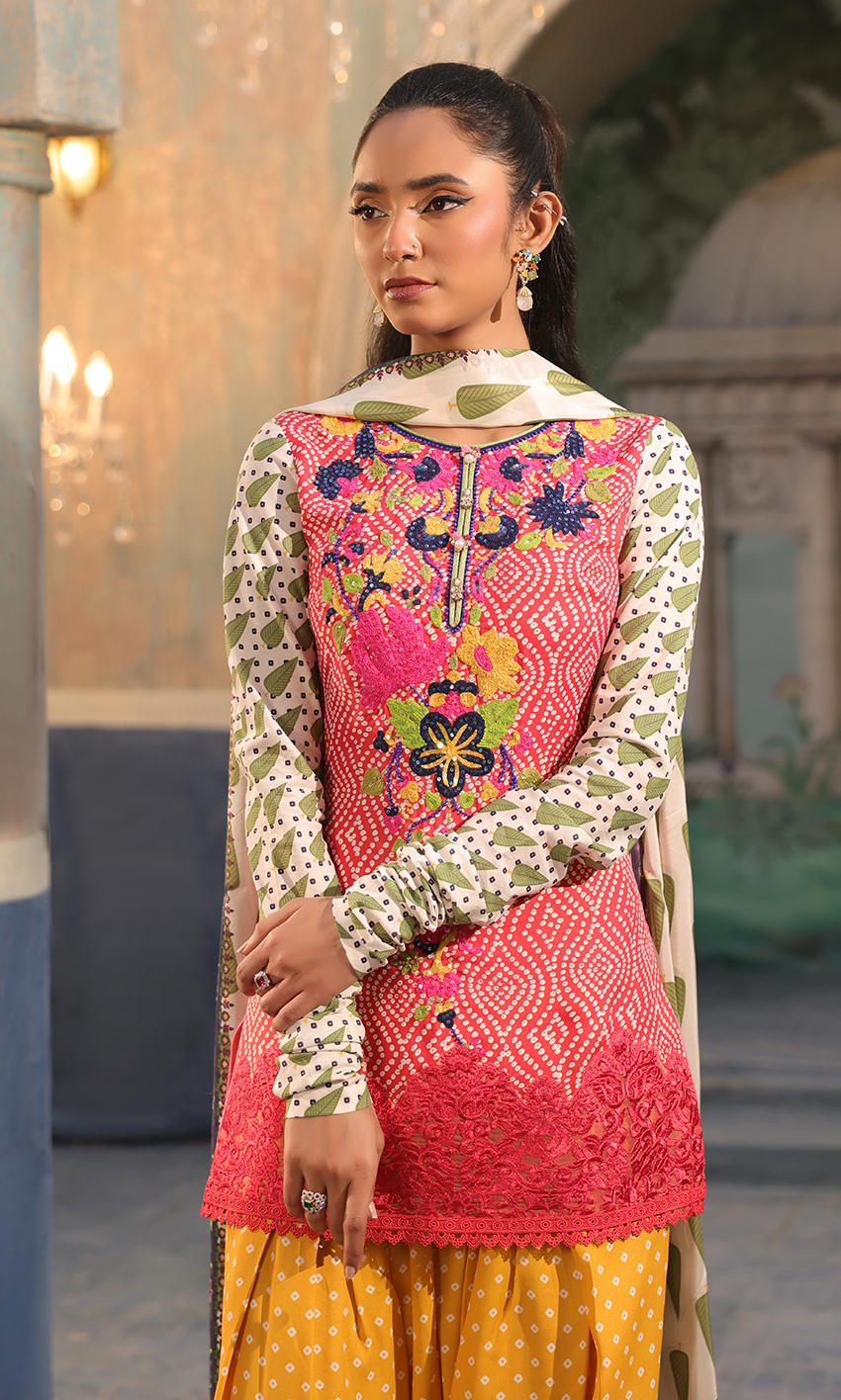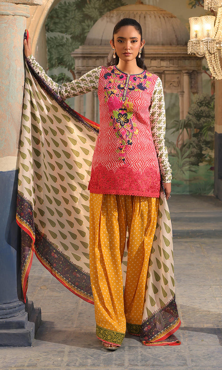 A printed crepe shirt with an embellished neckline is paired with a printed shalwar and a dupatta.