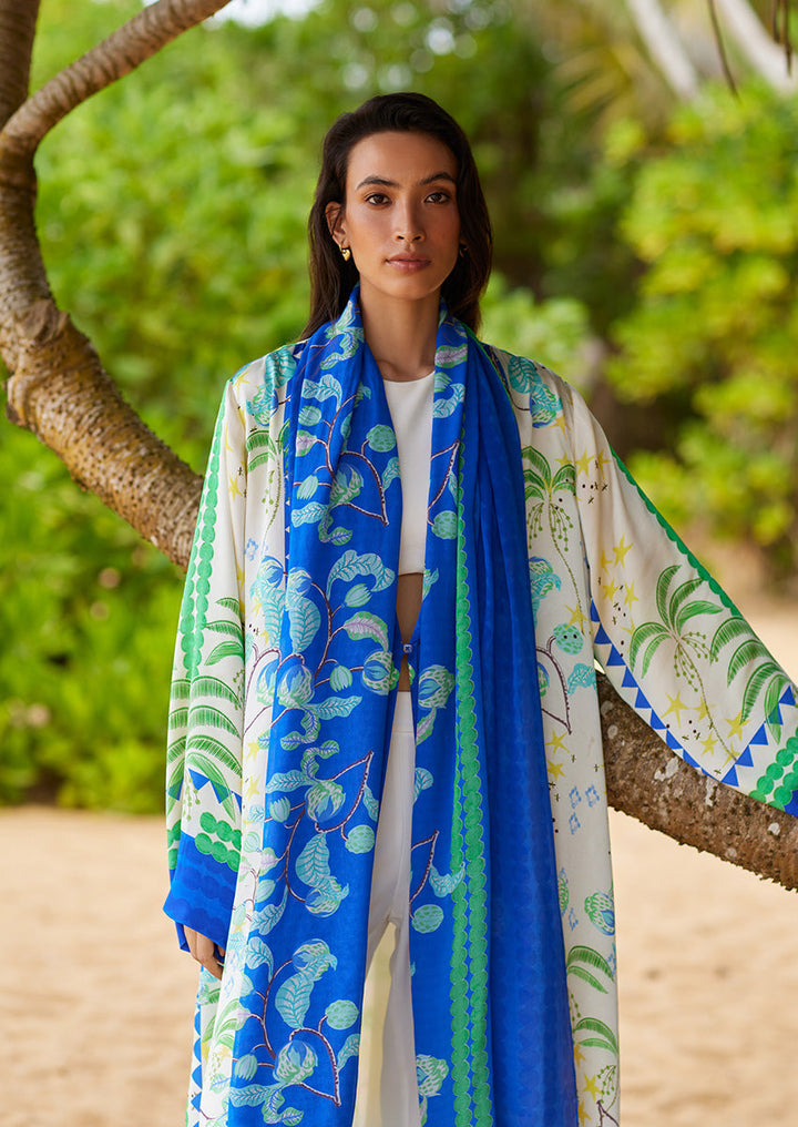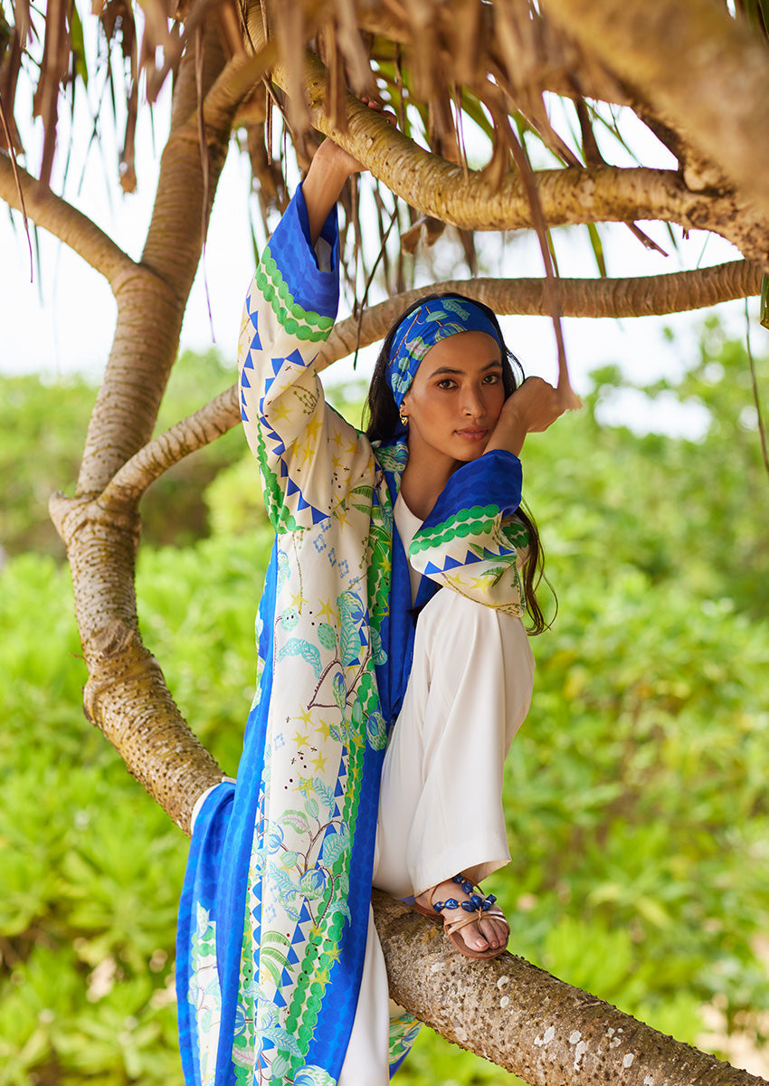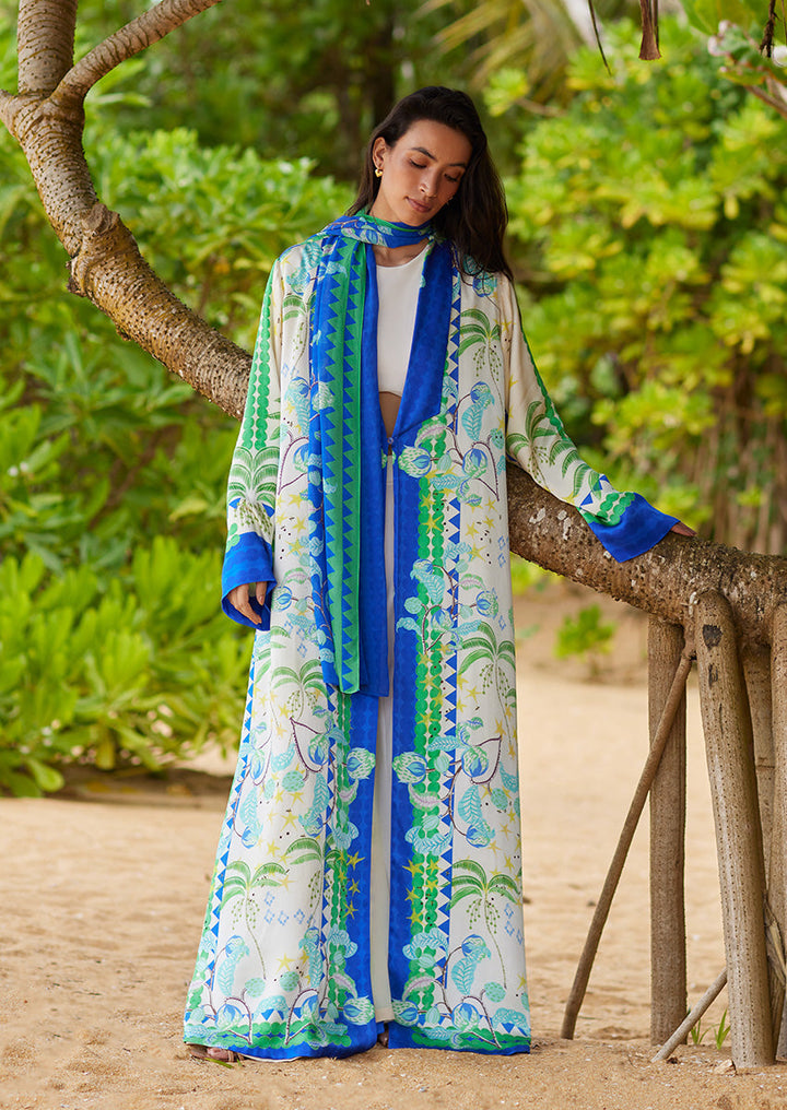 The harmonious combination of cream and verdant hues adds depth to the design, while the bold cerulean trim and accompanying Sheila enhance its sophisticated charm. For a refined look, pair this exquisite abaya with a monochrome top and tailored pants, allowing a striking print to take center stage. This piece is perfect for celebrating the spirit of Ramadan with elegance and ease.