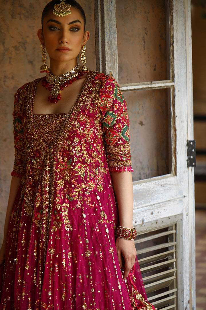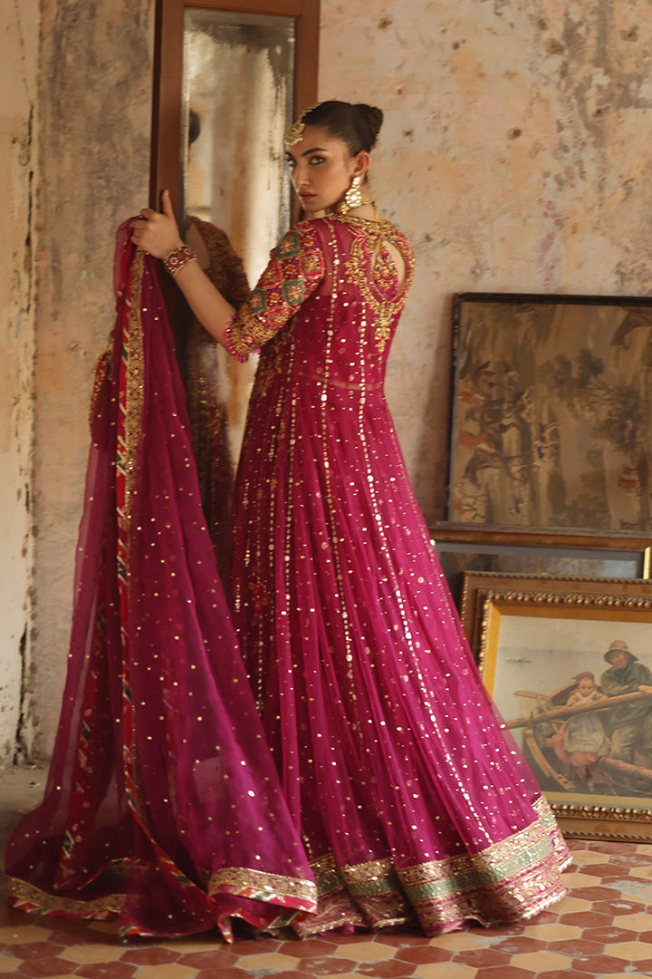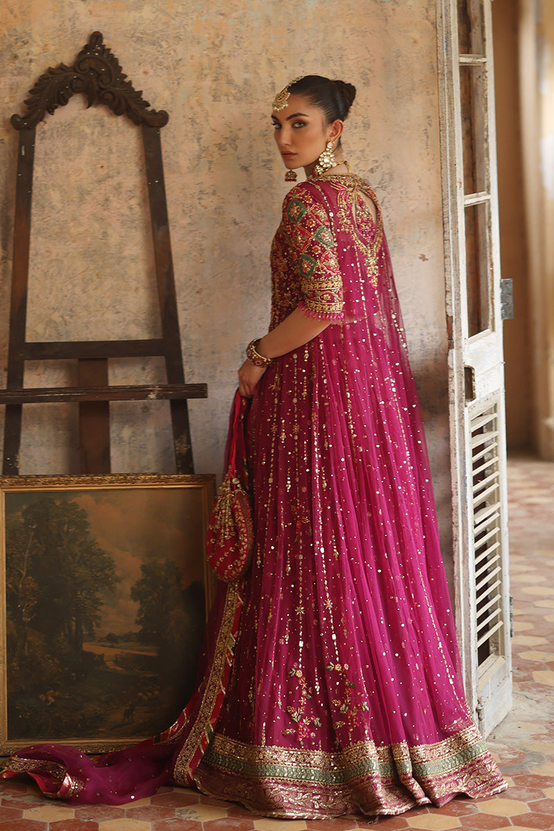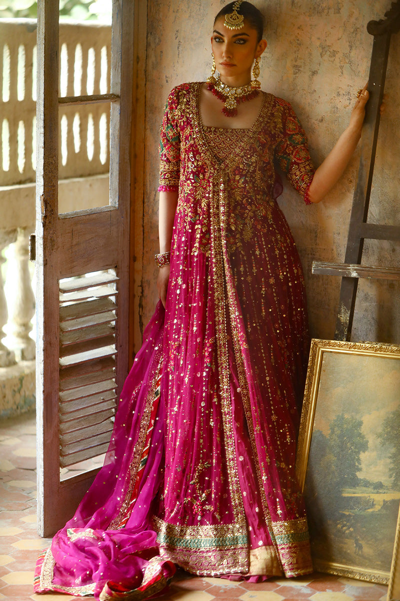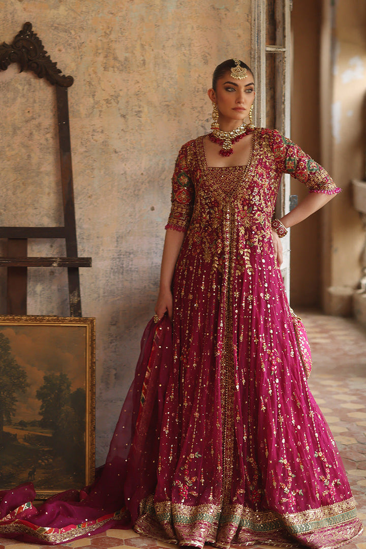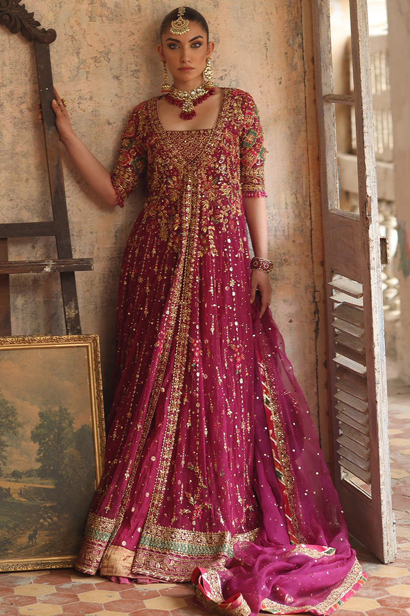 Look like a true queen in this purple and gold pishwaas. Delicate floral and celestial embellished adorn the bodice of the pishwaas, crystal beads hang delicately from the edge of the sleeve with a glistening gold border complete the outfit. The outfit is completed with a chhan dupatta with a complementary gold border.
