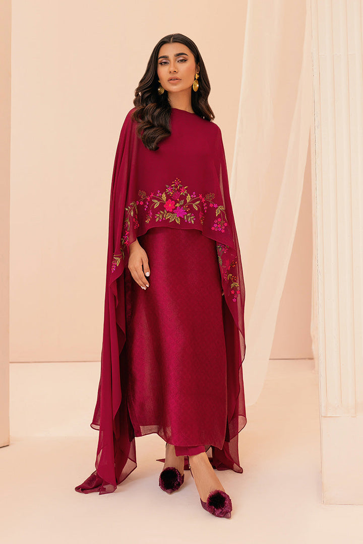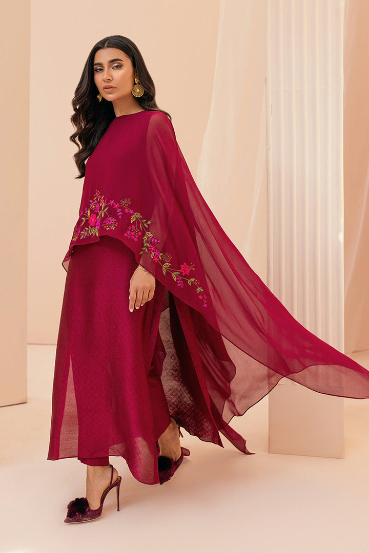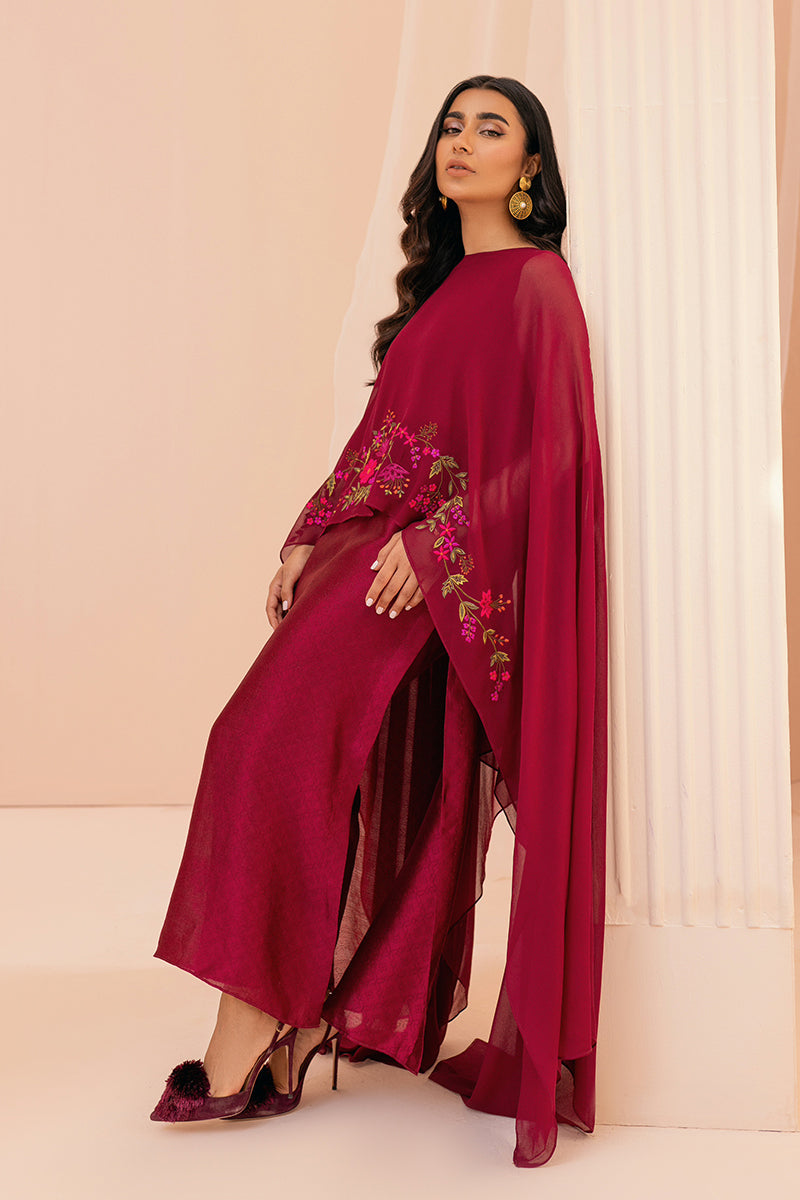 Grace, beauty and elegance, this outfit has it all. This stunning red straight is accompanied by a intricate embroidered floral cape and matching pants. The outfit is sold as 3-piece.