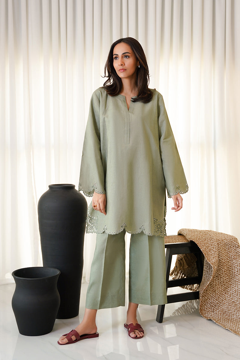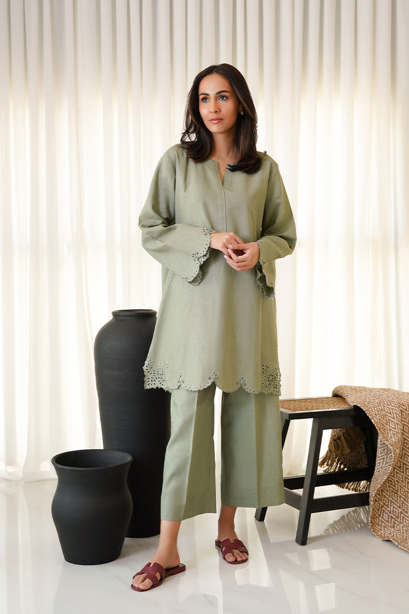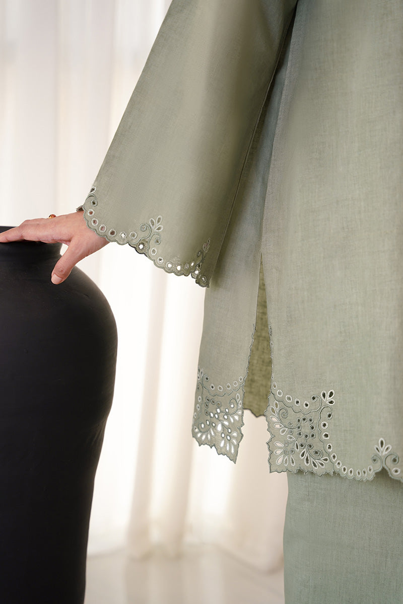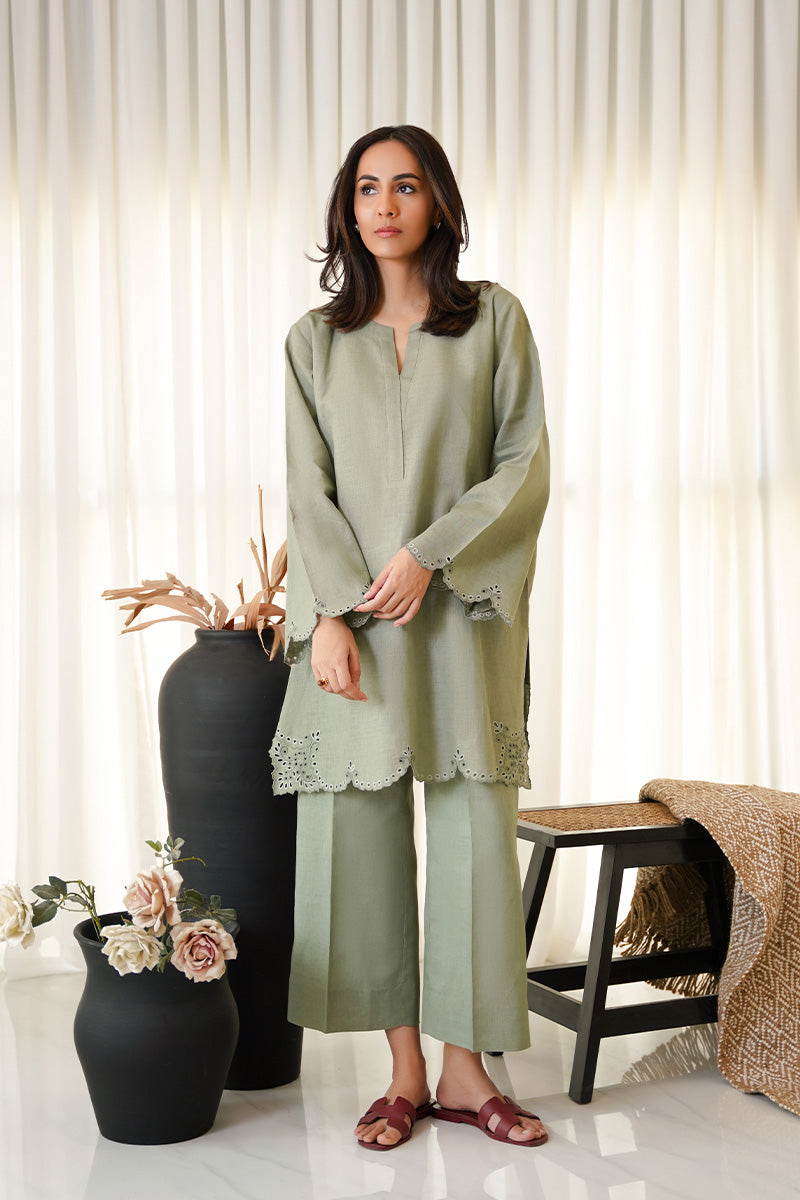 Our Matcha Latte separates is embroidered with cutwork on sleeves and hemline. This mint green shirt is finished with delicate resham embroidery. Pair this shirt with matcha latte culottes, making this basic set a perfect outfit for your daily mundane.