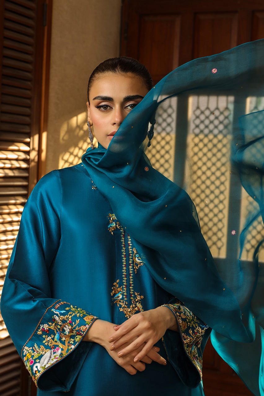 SHIRT: A teal green, raw silk shirt enhanced with hand embroidery on the neckline and sleeve cuffs. DUPATTA: Organza dupatta with hand embroidery. CULOTTES: Raw silk plain culottes.