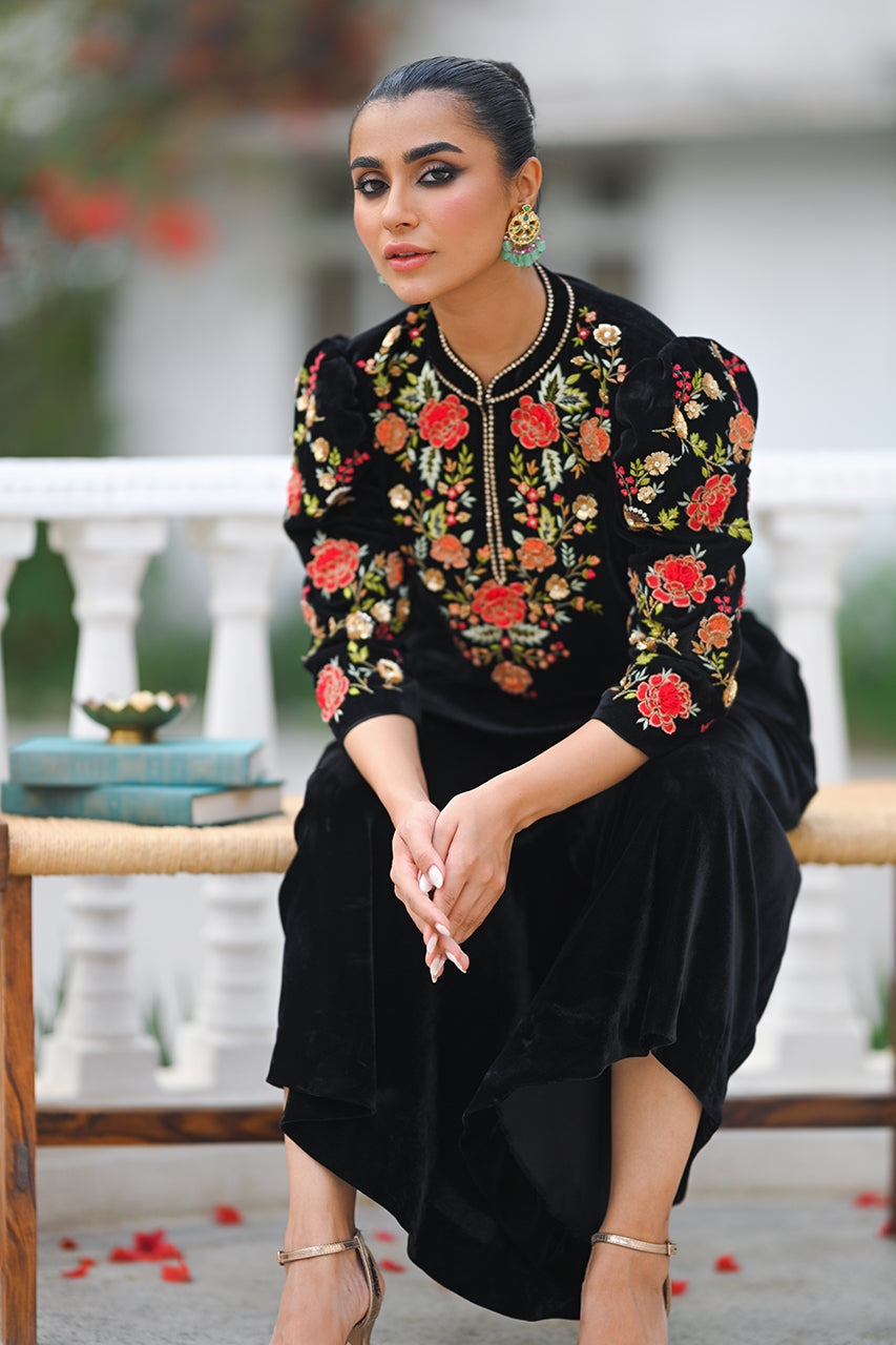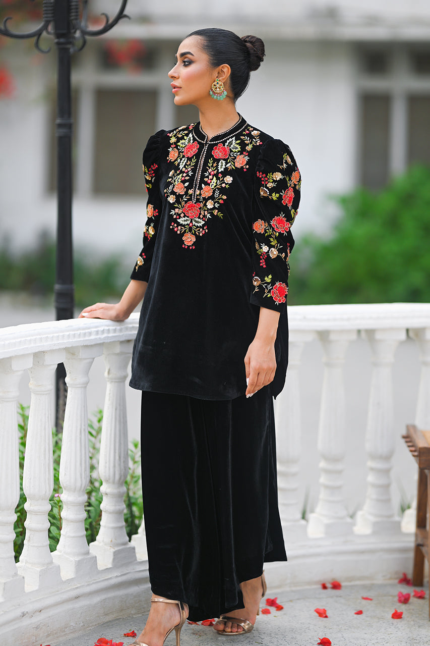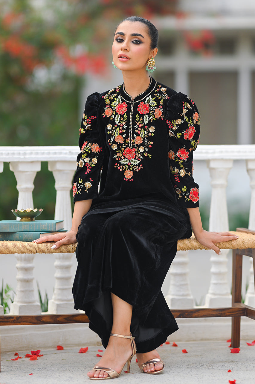 Opt for this luxurious black velvet ensemble worked with zardoze and resham. 3D flowers in various hues add bright pops of colour to this elegant look. It is paired with matching box pants.ÂÂ