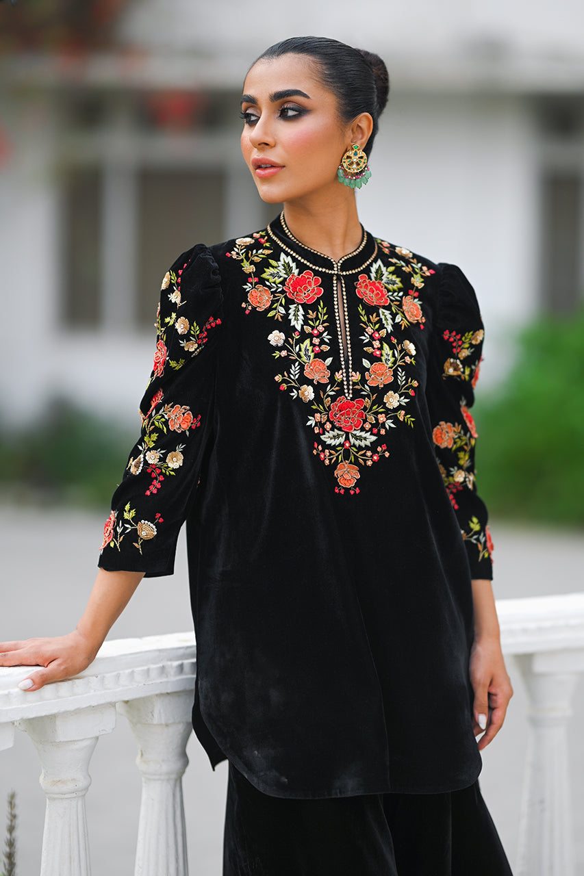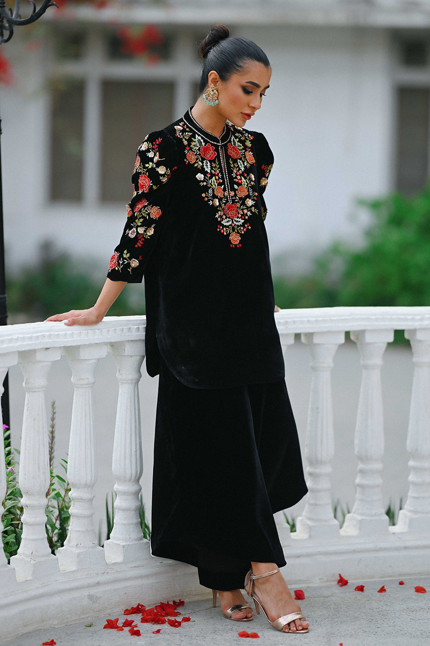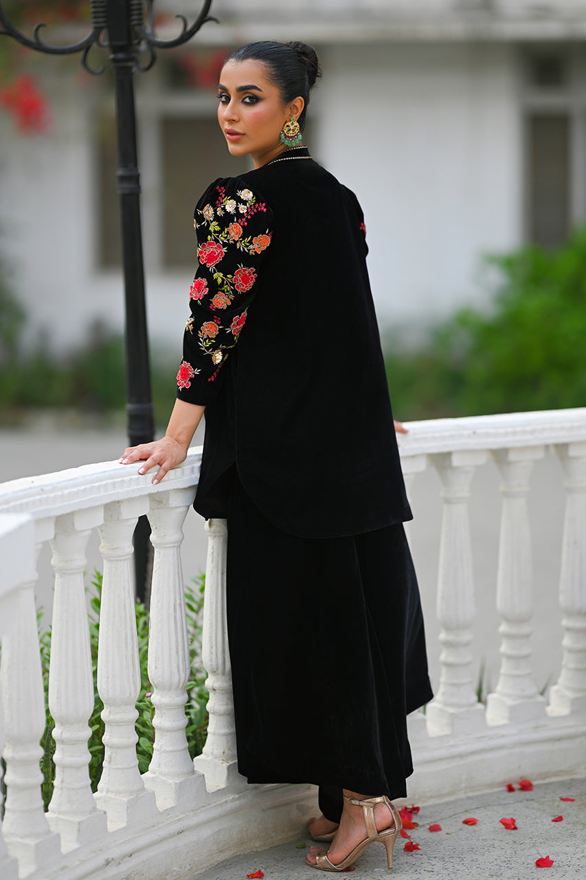 Opt for this luxurious black velvet ensemble worked with zardoze and resham. 3D flowers in various hues add bright pops of colour to this elegant look. It is paired with matching box pants.ÂÂ