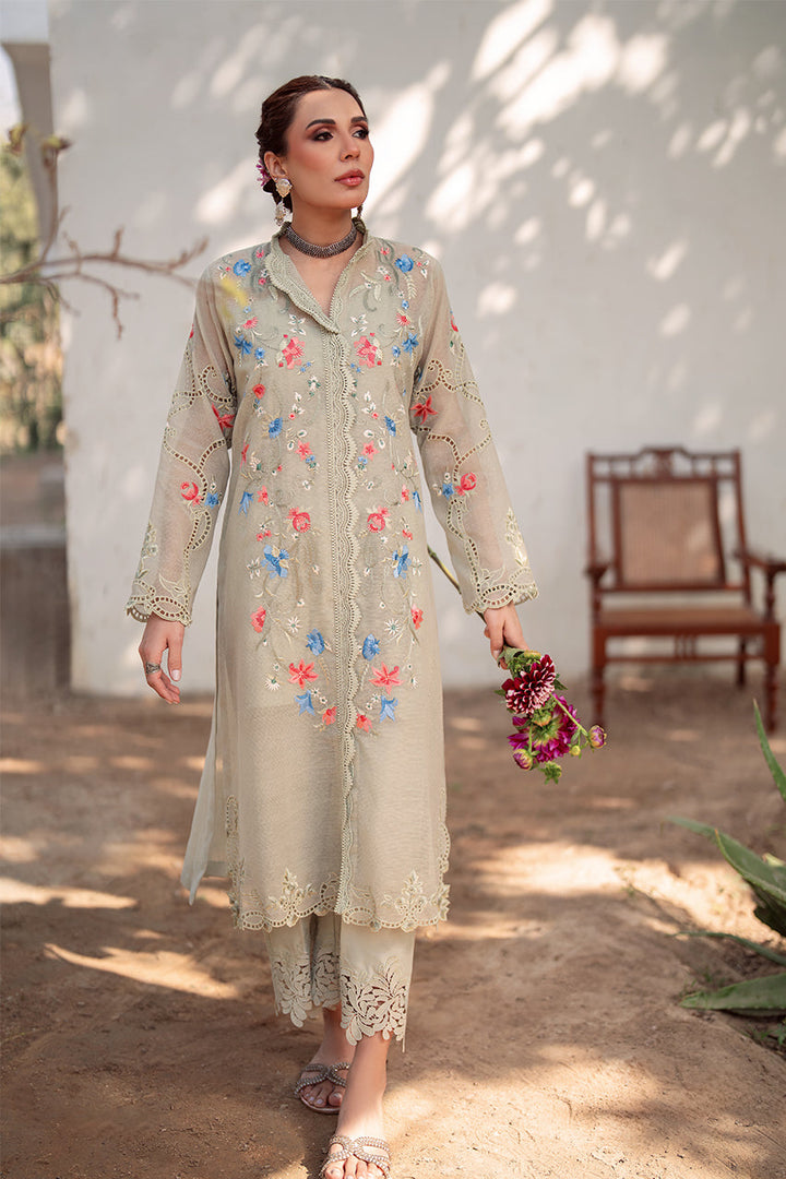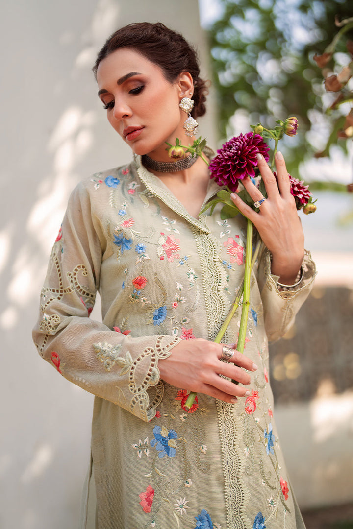 Playing on luminous seladon tones, a pure cotton karandi shirt is embroidered with floral blooms along the shirt front and finished with embroidered cutwork on the daaman. Matching lace detailed...