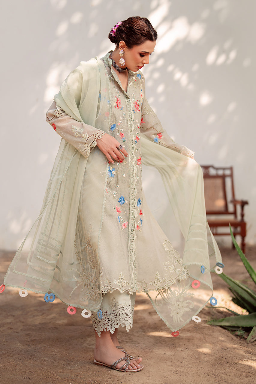 Playing on luminous seladon tones, a pure cotton karandi shirt is embroidered with floral blooms along the shirt front and finished with embroidered cutwork on the daaman. Matching lace detailed culottes and an organza dupatta with colourful tassels complete the look.