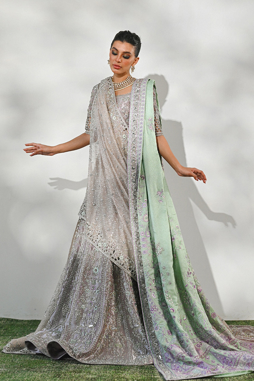 Fairy-like hues take centre stage in this elaborate bridal ensemble. Cut from a metallic tissue, this lehnga and choli have a uniquely light shade of lilac. The set is embroidered with cool toned zardoze details and are accented with mint and lilac resham flowers. Cutwork details adorn the fully embellished gossamer sleeves and the back. A matching dupatta, crafted from tissue, has zardoze and resham detailing on its cutwork borders surrounding sequin and pearl bouquets dispersed densely on the length. Paired with a light, mint hued shawl, crafted from the finest self jamawar, hand embroidered with zardoze, resham, aari, and applique details.