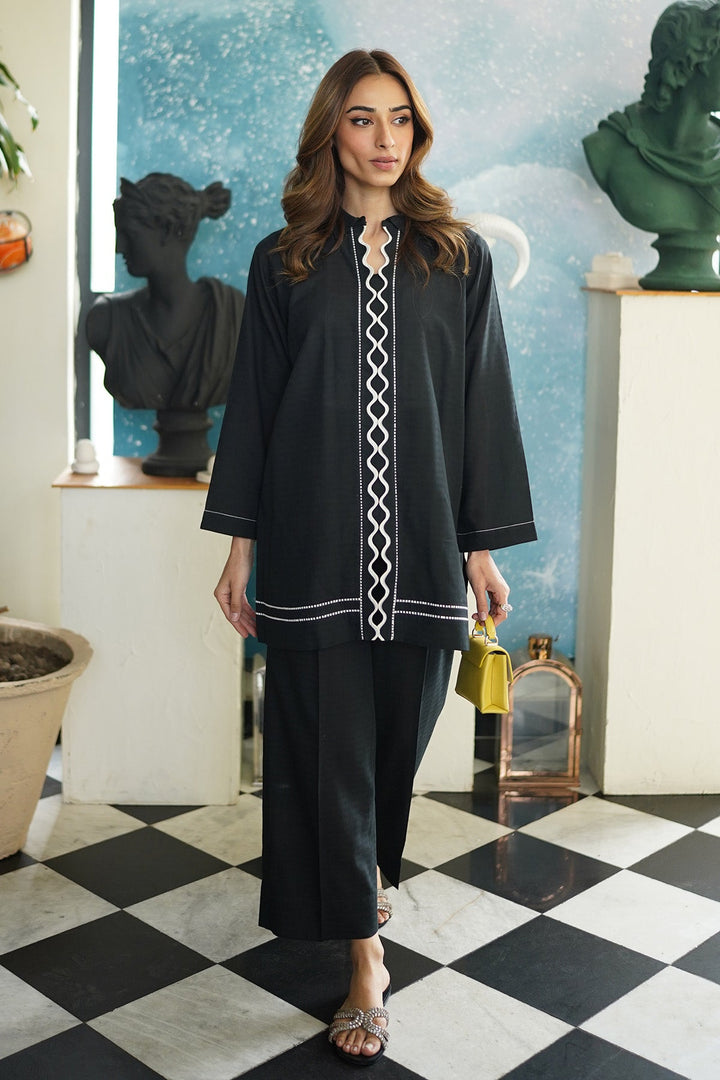 This Black Shirt, Featuring Intricate White Wave-Like Fabric Manipulation And Dotted Lace Detailing, Exudes Sophistication. Paired With Sleek Black Culottes.