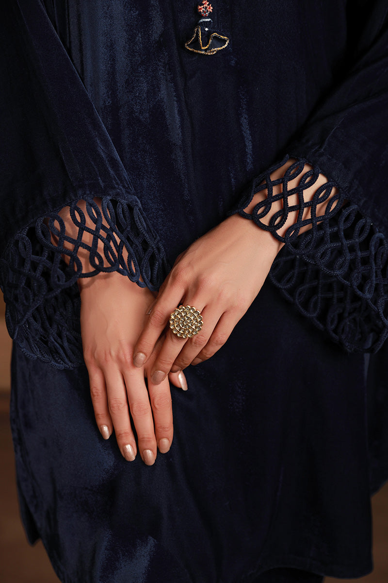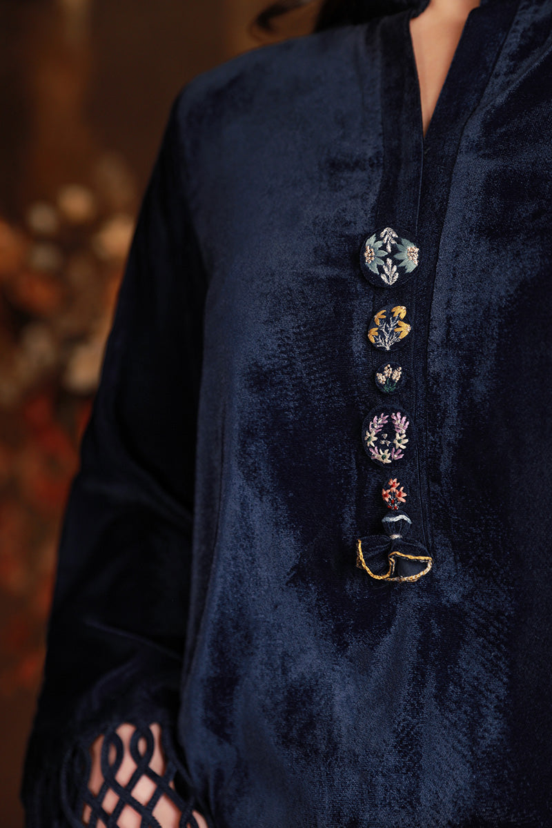 Elegant Shirt With Rounded Hem And Intricate Fabric Manipulation, Accentuated With Embroidered Buttons On The Placket Paired With Tapered Shalwar.