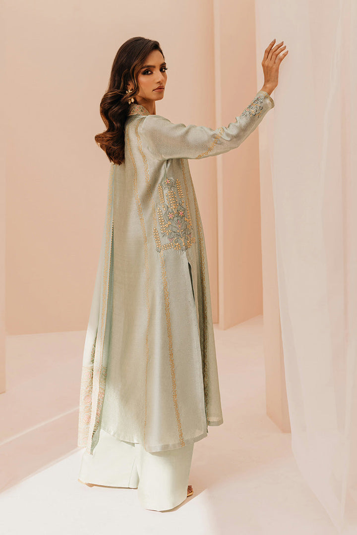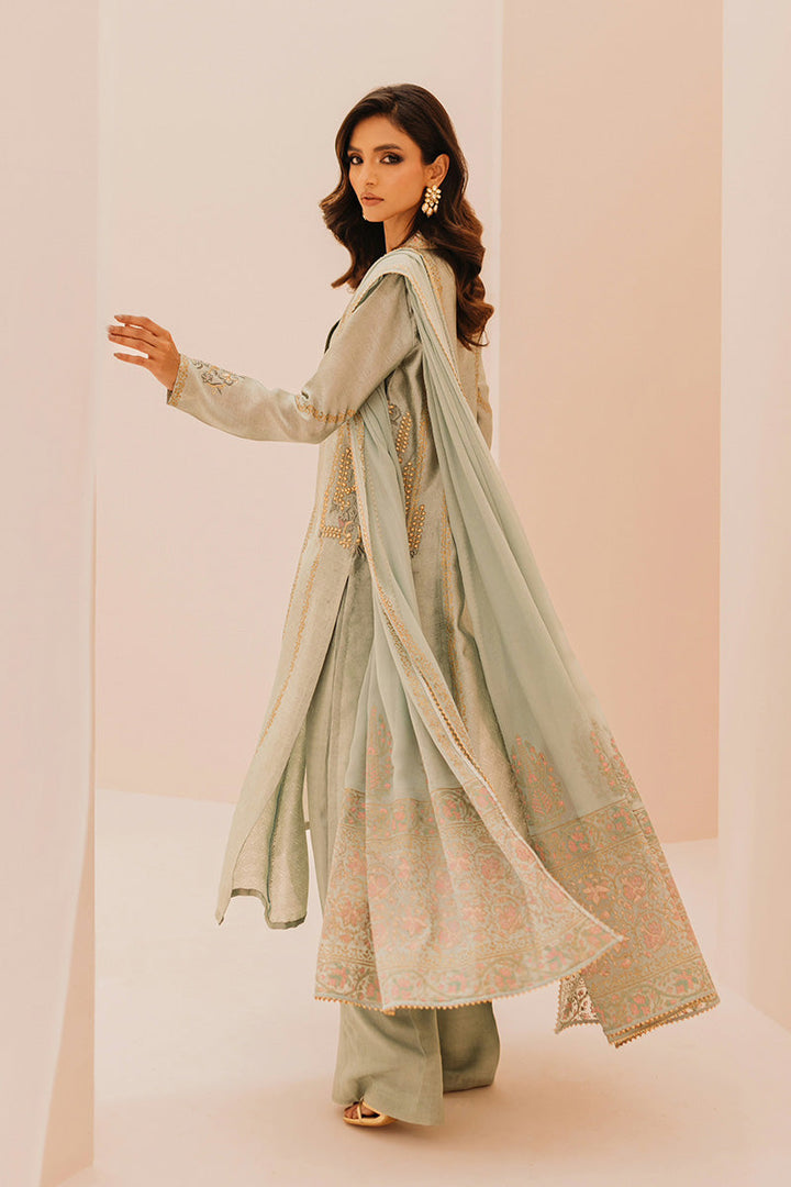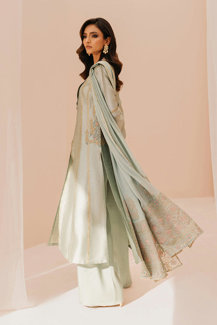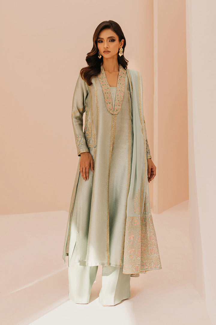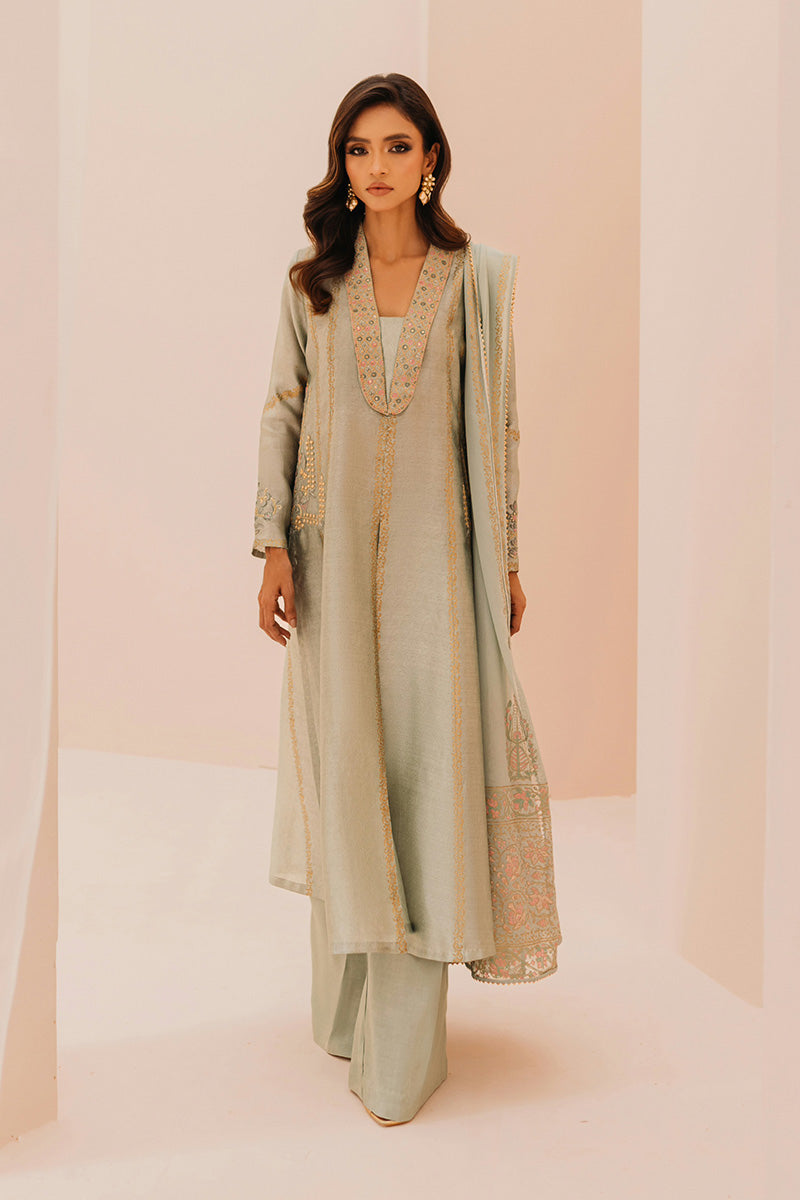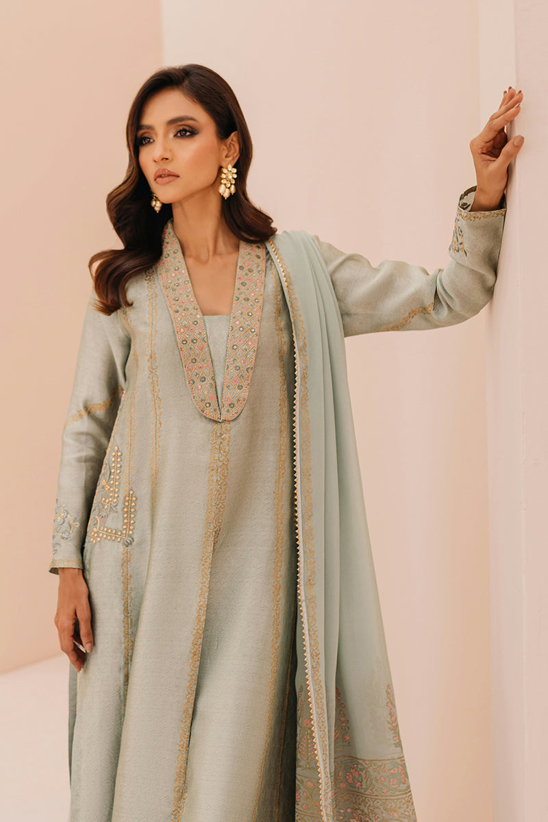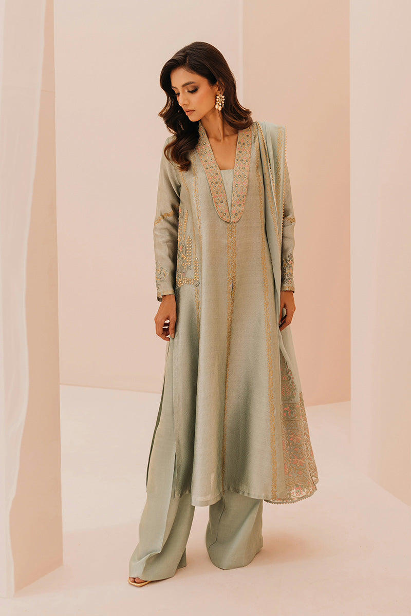 Feel just like royalty in this luxe embossed silk outfit! Made in green with a ornately embroidered shawl collar, this lovely outfit features delicate floral motifs on the neckline and sleeves. The outfit is completed with a matching color dupatta with floral motifs.