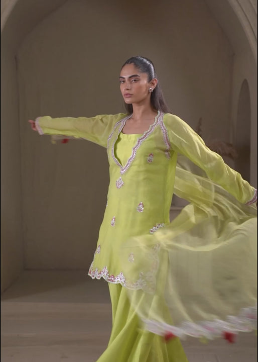 A chic short-length shirt showcasing fine cutwork along the neckline, side slits, and daman, styled with raglan sleeves for a refined silhouette. Paired with flowy bias-cut pants and a sheer organza dupatta adorned with detailed pallu embroidery—this ensemble strikes the perfect balance between tradition and modern elegance.