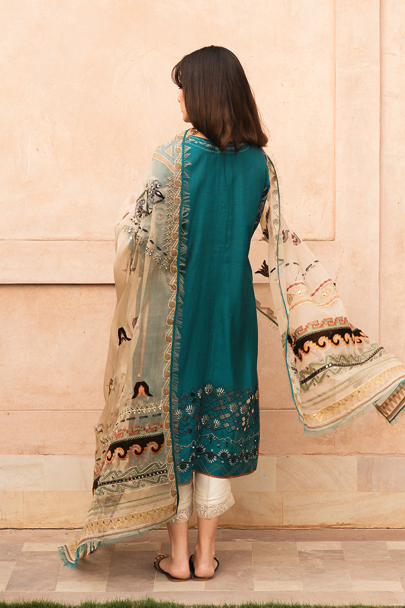 The Mira outfit features a khadi silk shirt with intricate machine embroidery in resham, mirror work, ari work, and delicate cutwork on the daman. Handcrafted buttons and tassels on the neckline add charm. The organza dupatta is adorned with resham embroidery, badla touches, applique, ari work, and mirror details, finished with bonpiping and shredded edges for a refined look.