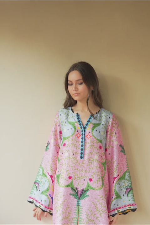 A vision of tropical grandeur, this flowing pure rawsilk kaftan is rendered in a delicate candy pink hue and adorned with an exquisite botanical and architectural print. The sapphire hued contrasting neckline, with ebony fabric manipulation and tukri details, adds a sartorial edge, complemented by the 3D scallop detailing on the sleeves.