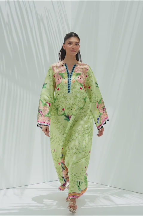 A vision of tropical grandeur, this flowing pure rawsilk kaftan is rendered in a delicate pistachio hue and adorned with an exquisite botanical and architectural print. The sapphire hued contrasting...