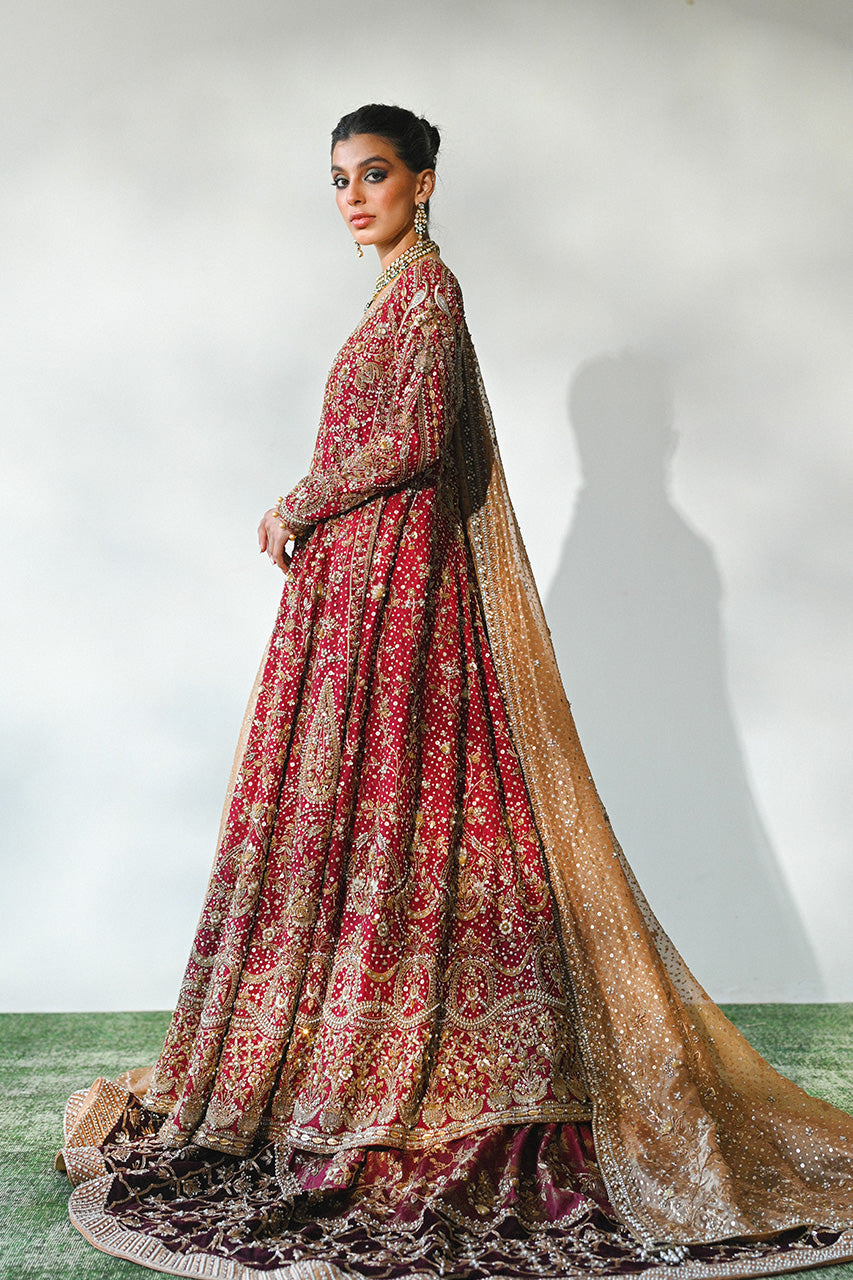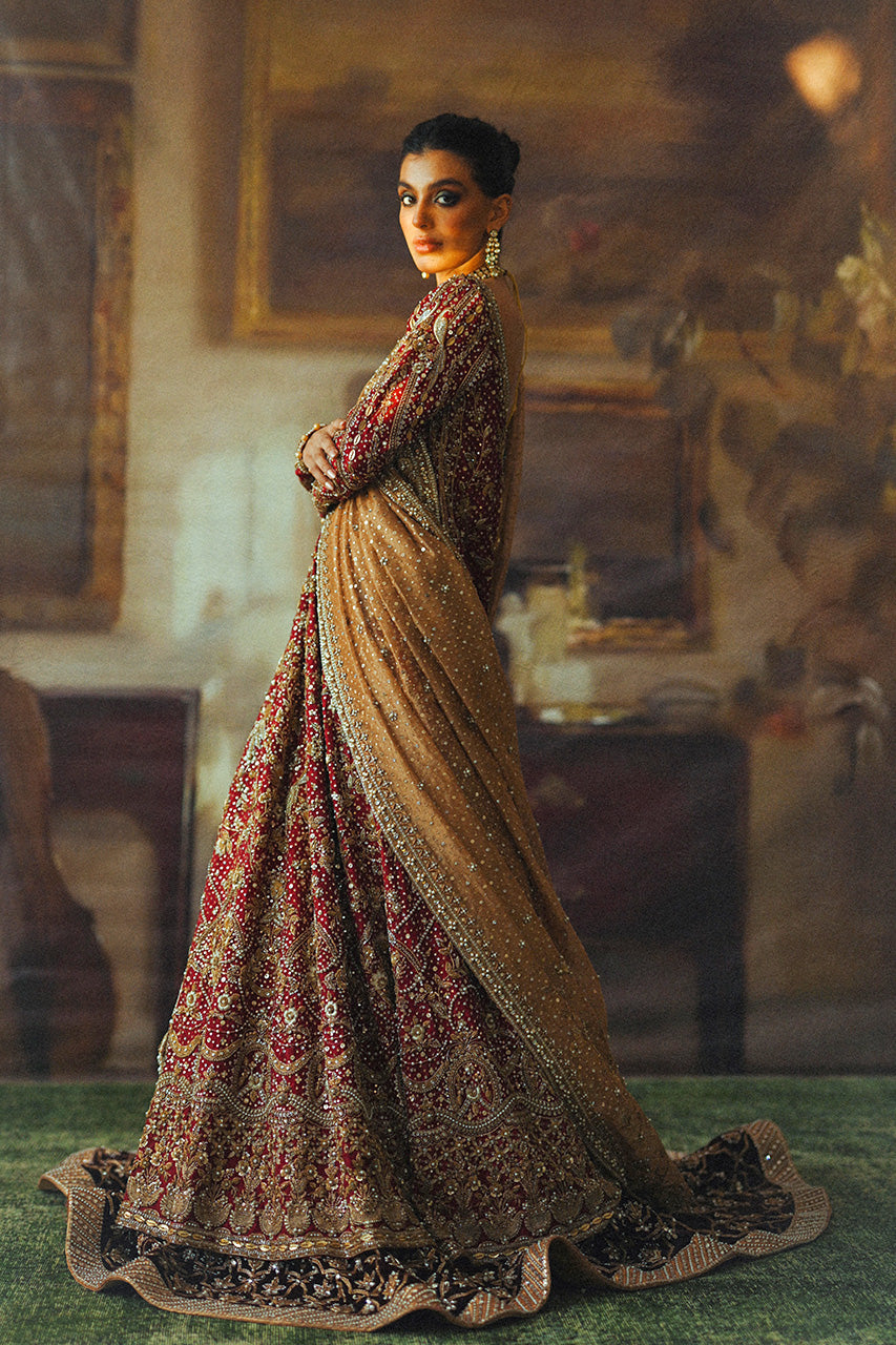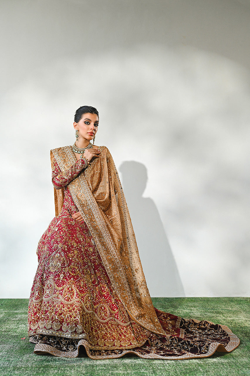 Be the spotlight in this classic crimson hued cotton net peshwas meticulously hand embroidered by our expert artisans with zardoze work in various hues of gold. Scalloped edges on the handworked full sleeves add to the flattering silhouette. Complemented by a matching brocade lehnga with a deep burgundy velvet border, hand embellished with zardoze and pearl floral sprigs and geometric patterns. A contrasting copper-toned tissue dupatta has a zardoze and pearl detailed thick border on one side and an intricate one on the other, continuing on the pallu with velvet tassels featuring pearl details.