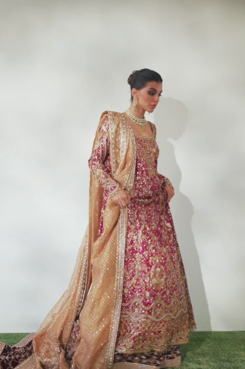 Be the spotlight in this classic crimson hued cotton net peshwas meticulously hand embroidered by our expert artisans with zardoze work in various hues of gold. Scalloped edges on the...