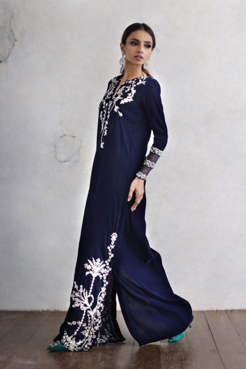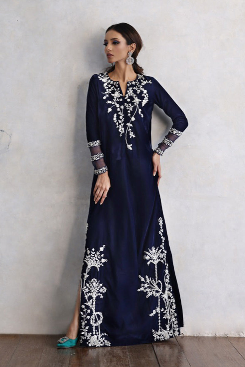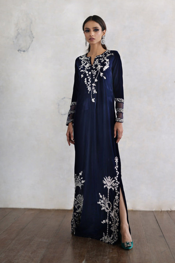 Delicate flowers embellished in traditional dabki, nakshi and zardozi kaam lay on luxe velvet in this Mina Hasan Kaftan. The assymetrical kaam on the neckline looks every so graceful whilest two flowering palms decorate the slits.