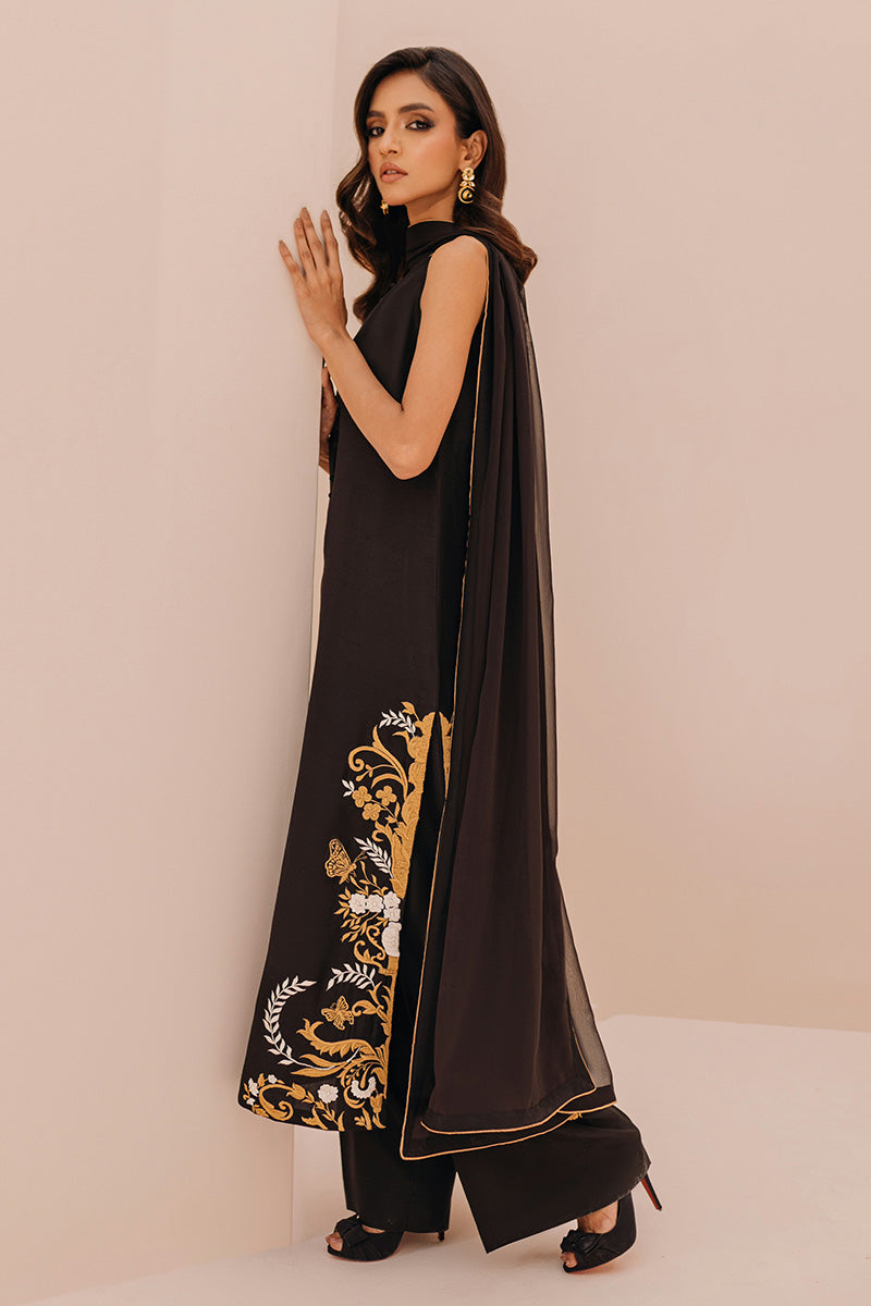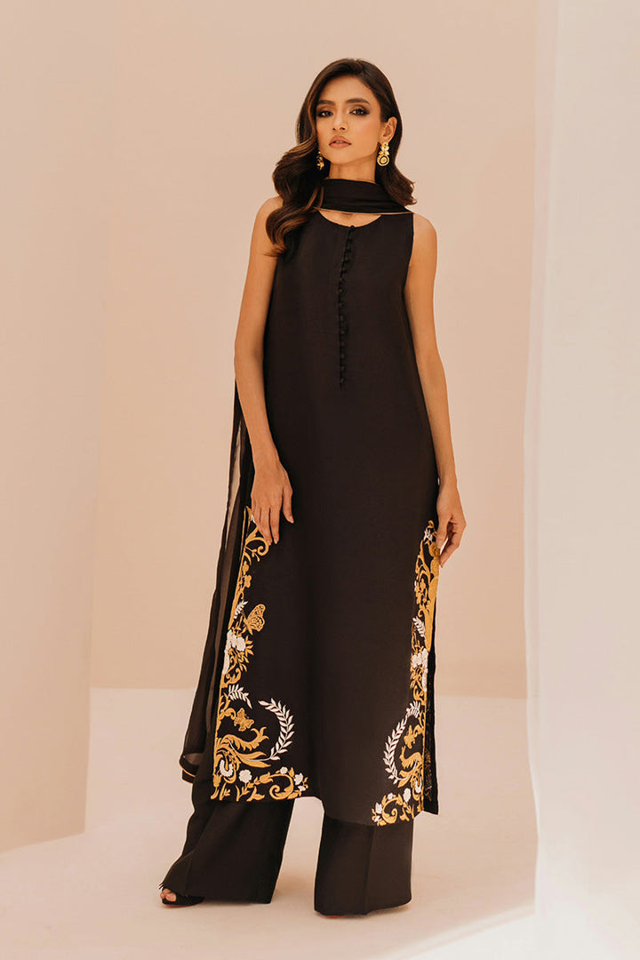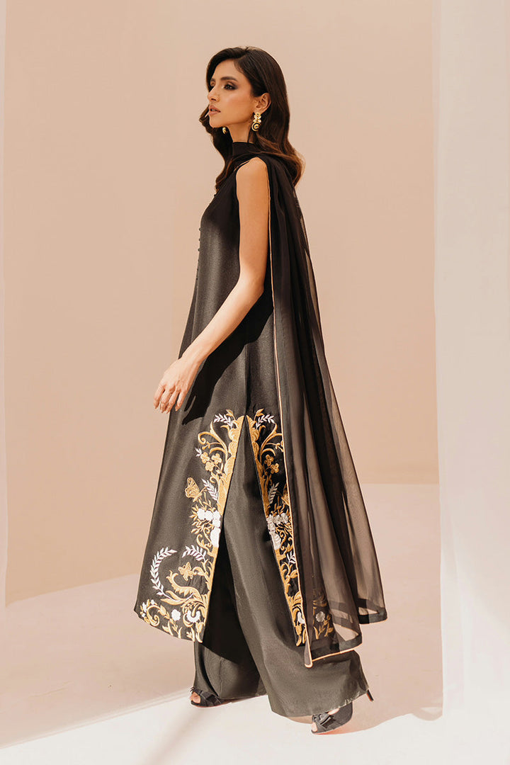 Look incredibly chic in this striking Mina Hasan outfit. Made in luxe raw silk fabric, the outfit features custom buttons on the neckline and carefully botanical baroque embroidery on the sides of the slit. The is complete with a matching silk chiffon dupatta.