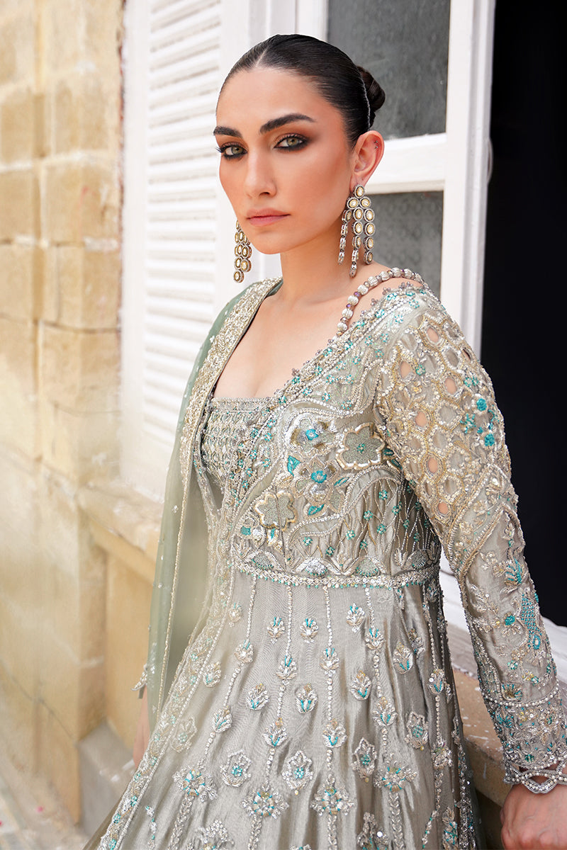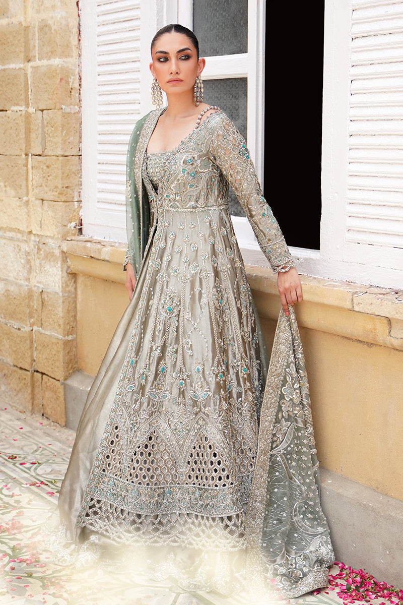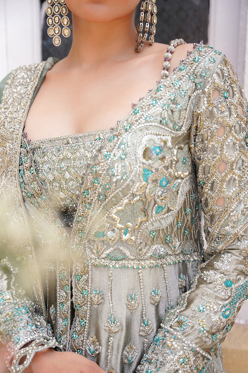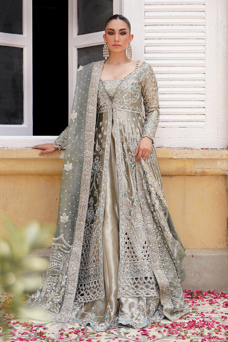 Intricately crafted with grey lama front-open scalloped gown paired with a tube top and lehenga. This silhouette is adorned with aari, applique, and Resham needle-craft. To further enhance the silhouette, kora, dabka, zardozi, and other embellishments are added for a perfect wedding look.