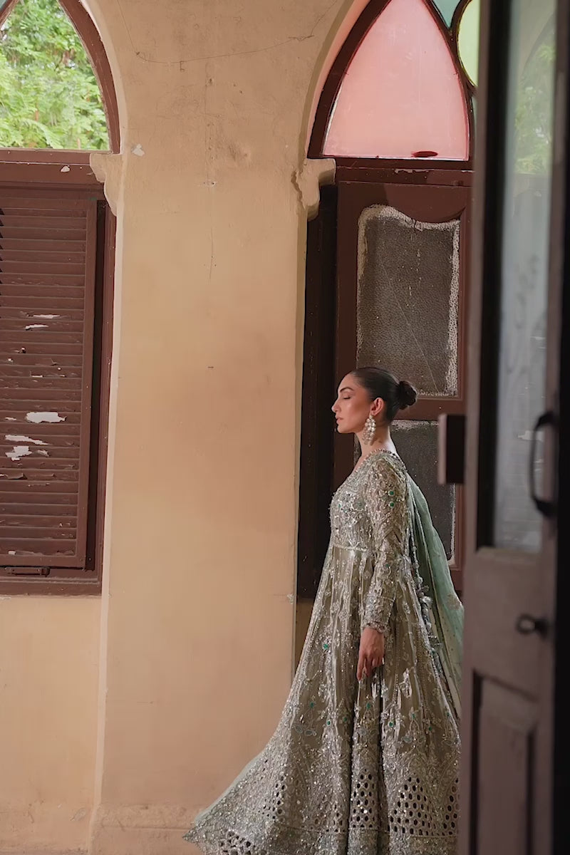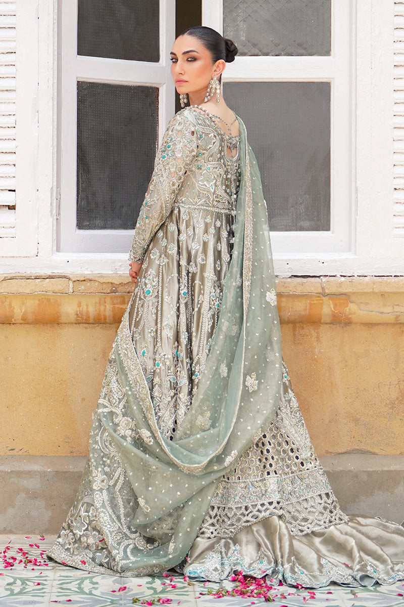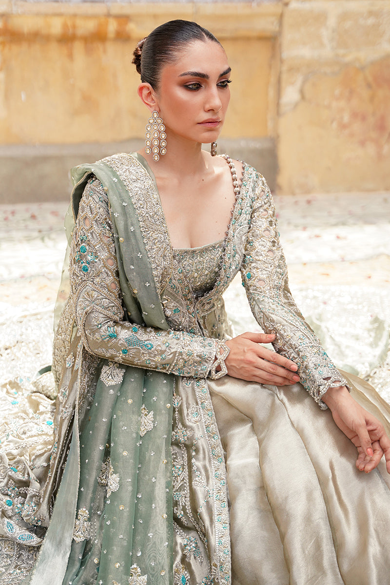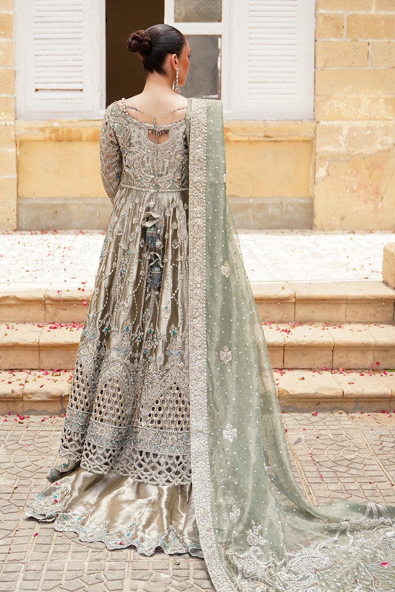Intricately crafted with grey lama front-open scalloped gown paired with a tube top and lehenga. This silhouette is adorned with aari, applique, and Resham needle-craft. To further enhance the silhouette, kora, dabka, zardozi, and other embellishments are added for a perfect wedding look.