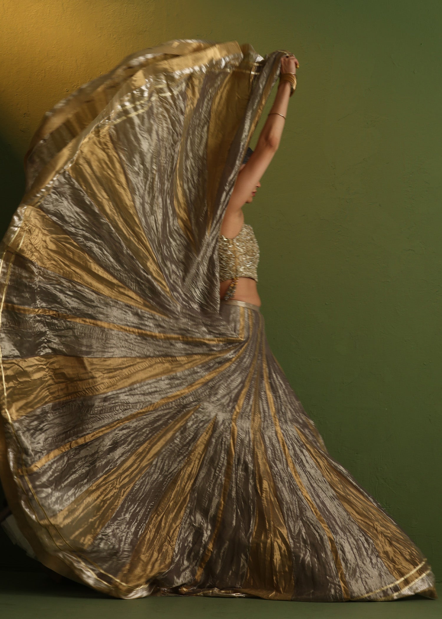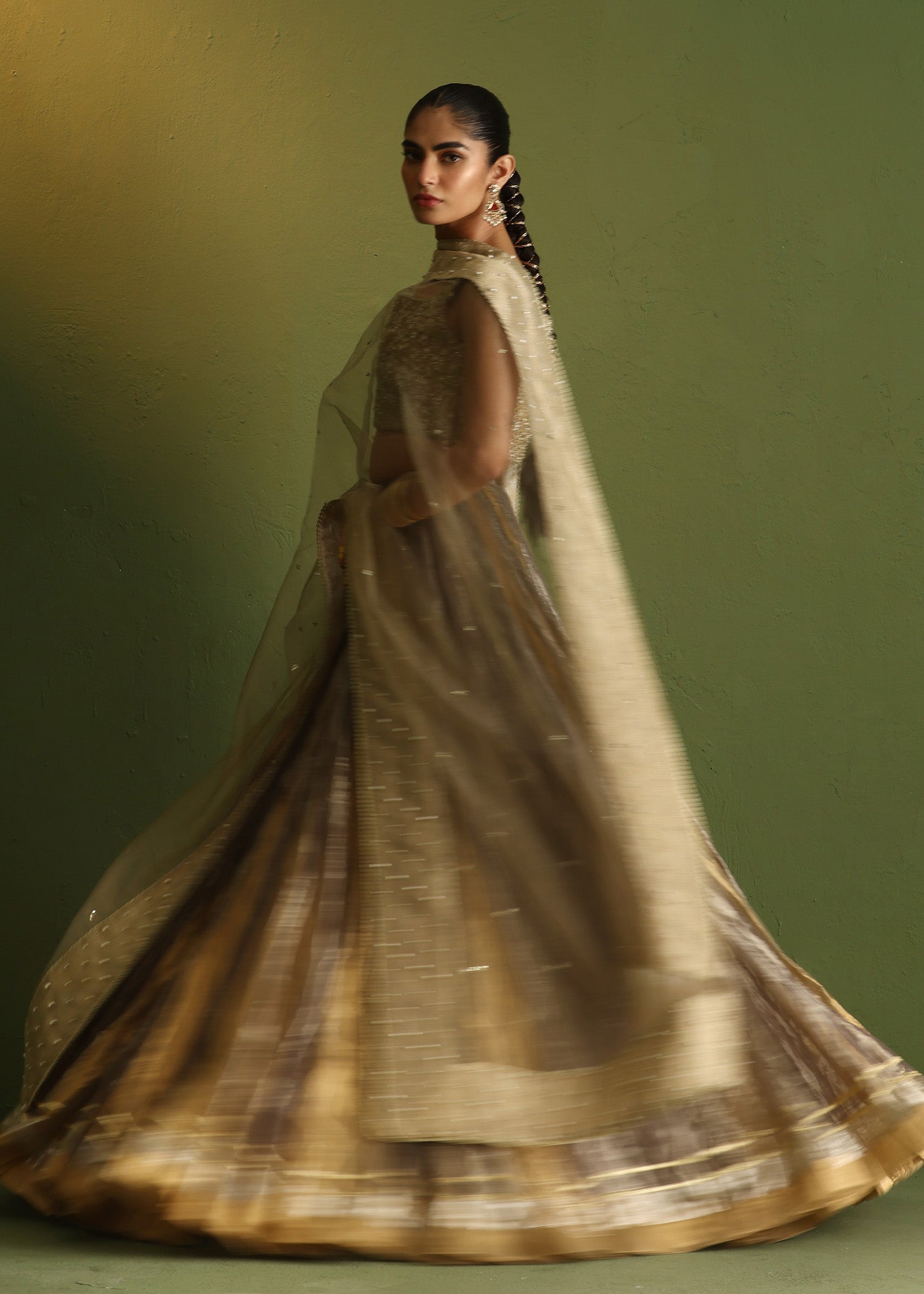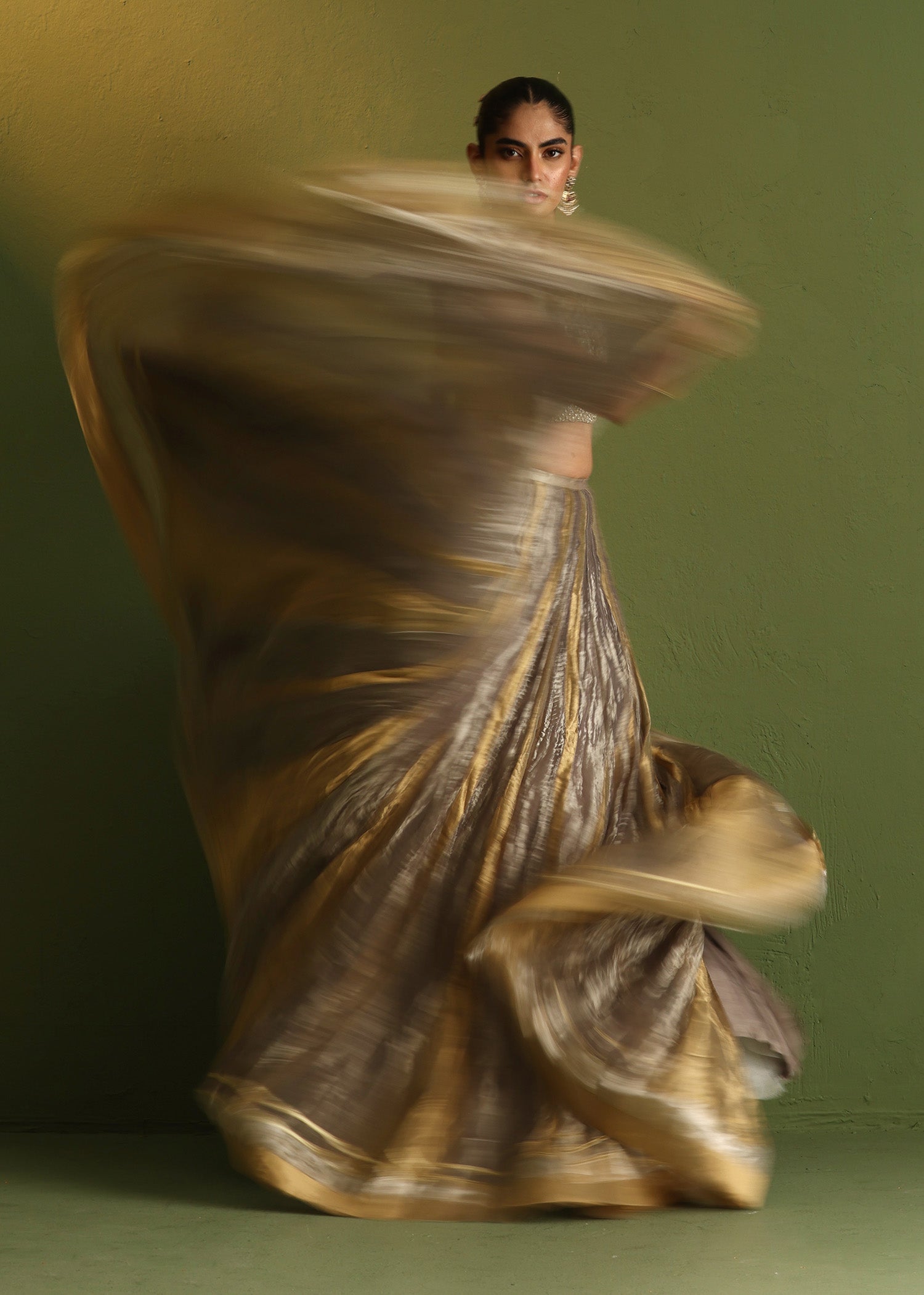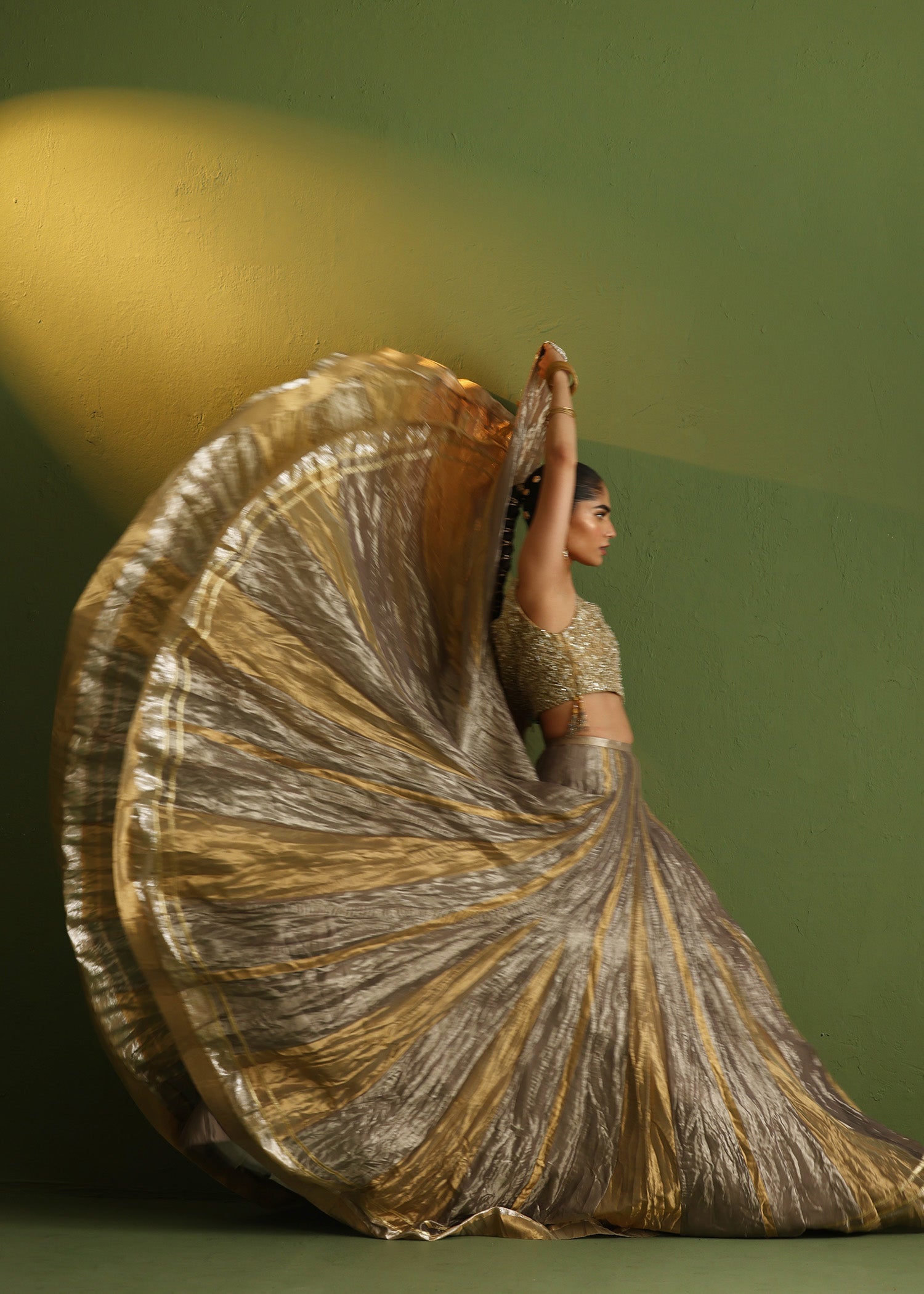 The blouse is beautifully crafted from luxurious lama fabric, showcasing intricate embroidery and exquisite hand embellishments that add a touch of elegance. It pairs perfectly with a charcoal gray pencil-paneled lehenga, creating a refined and sophisticated look. This ensemble is designed for those seeking a perfect blend of traditional artistry and modern style. Ideal for festive occasions, it promises to make a statement