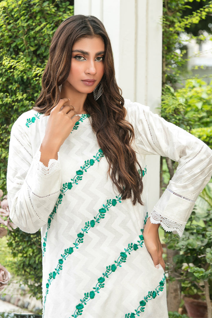 Khaddi net shirt embellished with laces and detailed with plates and embroidery paired with tulip shalwar.