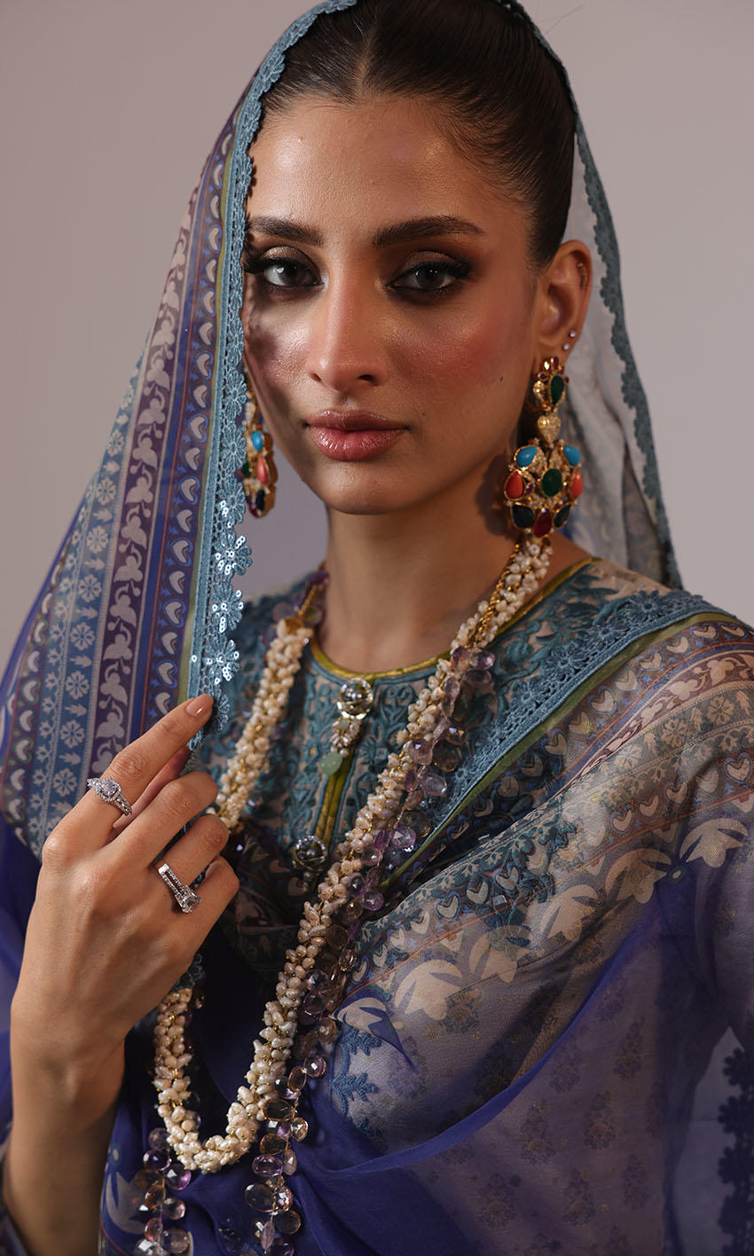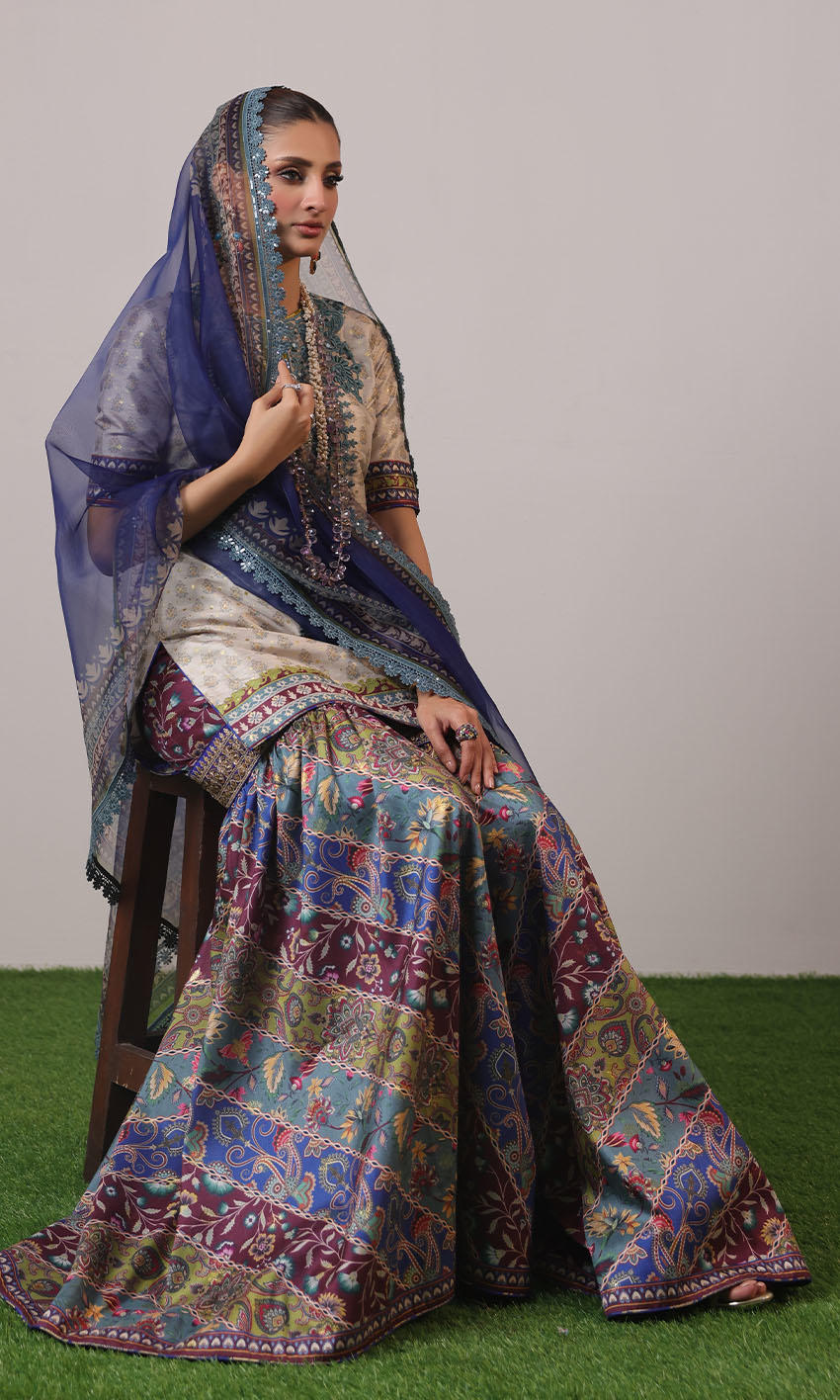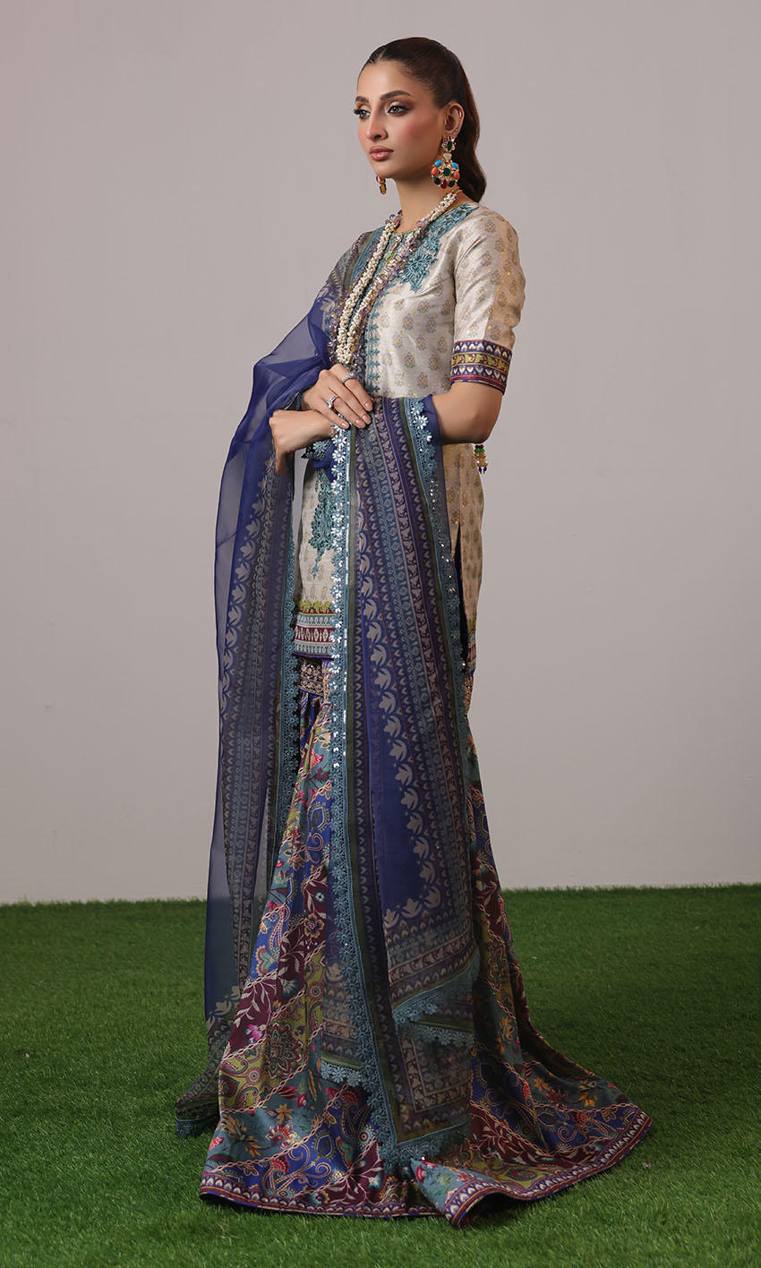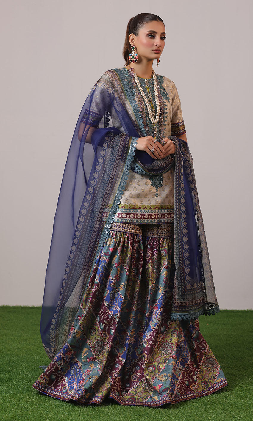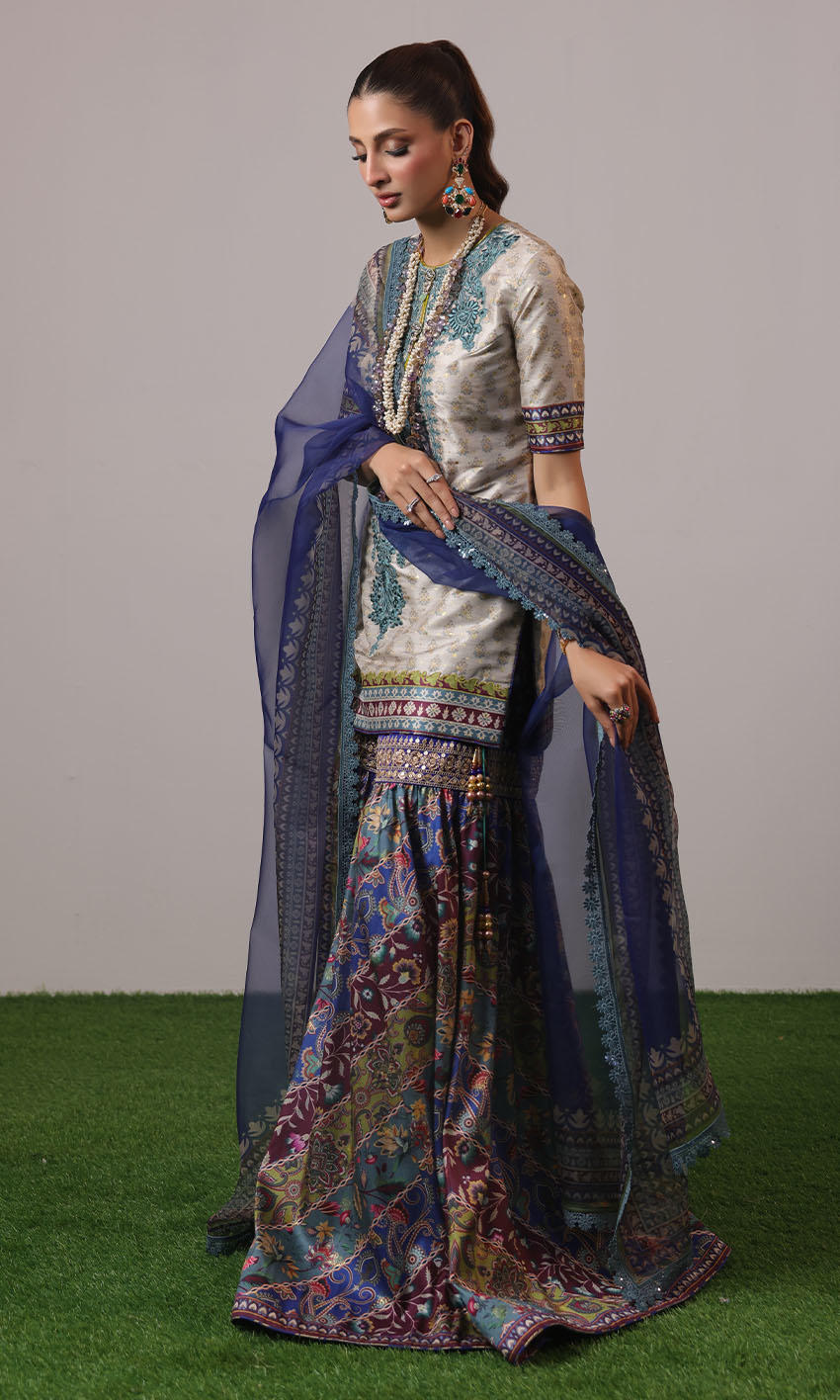 Raw silk shirt with embroidered neckline, paired seamlessly with a raw silk multi color gharara and organza dupatta adorned with lace borders.