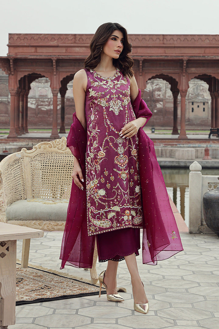 A magenta, silk jamawar shirt designed with hand embroidery on the front and back; paired with matching, raw silk culottes with scallop detailing and an organza dupatta crafted with hand embroidery.