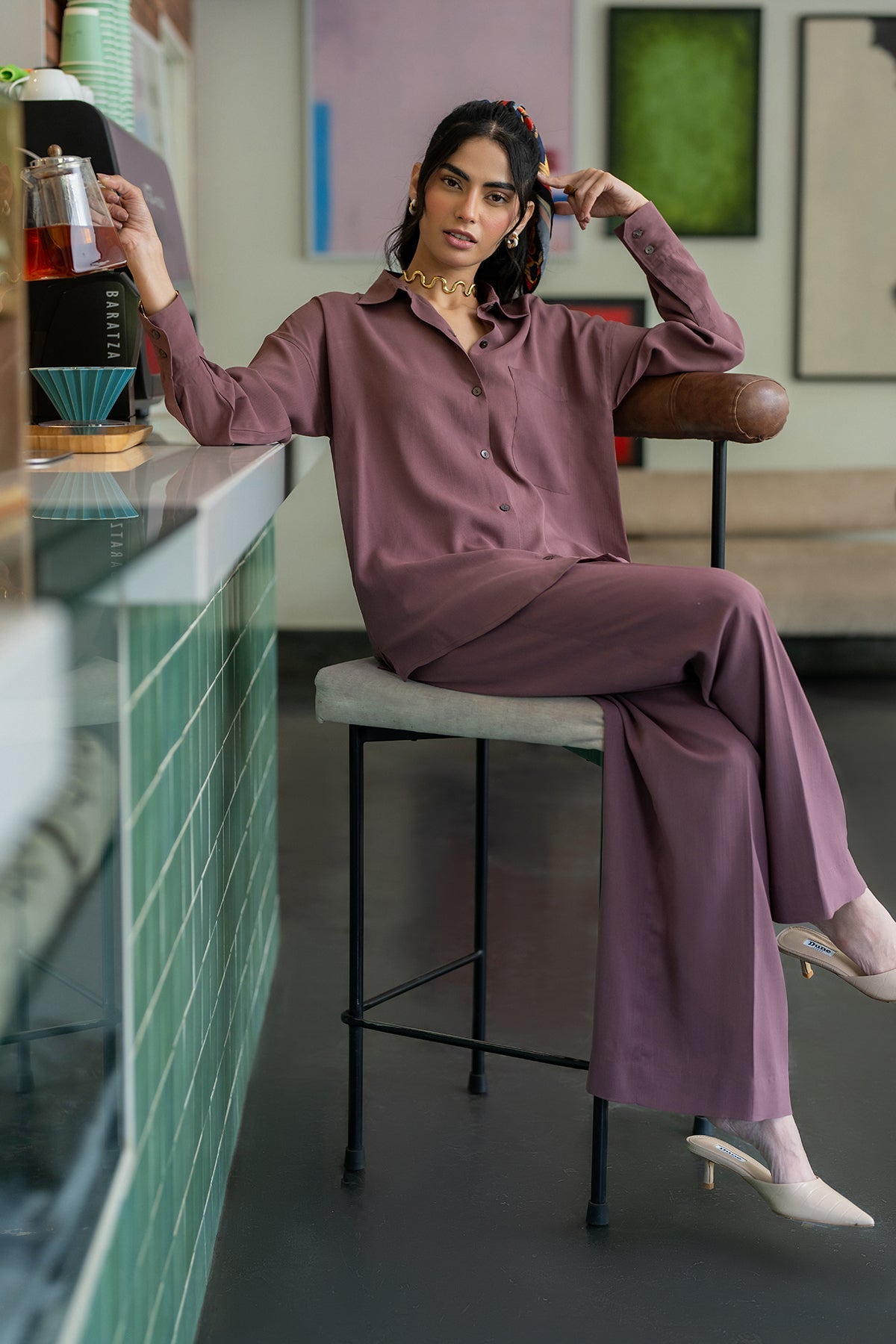 This Purple Co-Ord Set Features A Button-Up Shirt With A Spread Collar And Cuffed Sleeves, Paired With Matching Bell Bottoms.