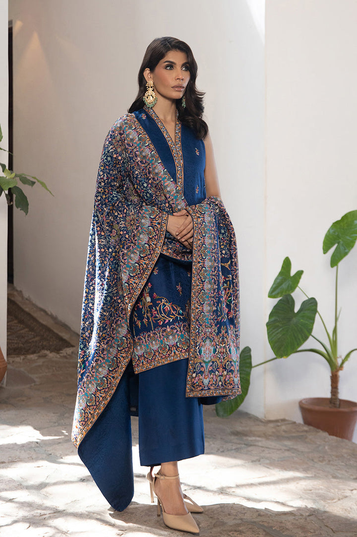 A montana blue, silk jamawar shirt designed with hand embroidery on the front and back; paired with matching, raw silk plain culottes. This outfit is made complete with a heirloom, silk jamawar shawl crafted with hand embroidery.